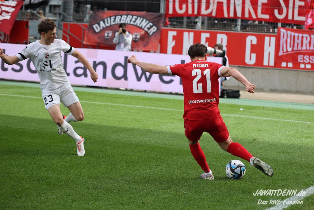 Christoph Dabrowski und sein Trainerteam zaubern derzeit stetig ein rot-weisses Kaninchen aus dem Aufstellungs-Zylinder. Diesmal war es Sandro Plechaty, der überraschend in die Startaufstellung berufen wurde. Essens langjährige Nummer 21 durfte auf der rechten offensiven Bahn ran und überzeugte dort. Nicht nur wegen seines frühen Treffers zum 1:0 (9.). Mit seiner ausgefeilten Technik war Plechaty kongenialer Partner von Youngster Nils Kaiser, der das fünfte Spiel in Serie beginnen durfte, diesmal wieder als rechter Verteidiger, sodass Andy Wiegel insgesamt heraus rotierte.