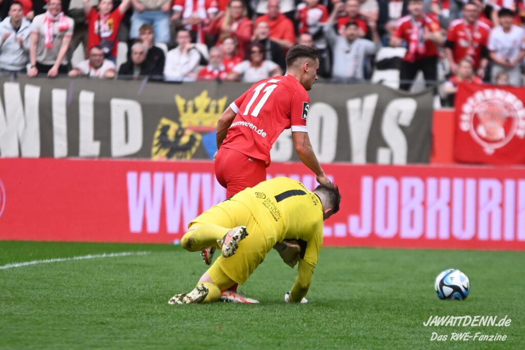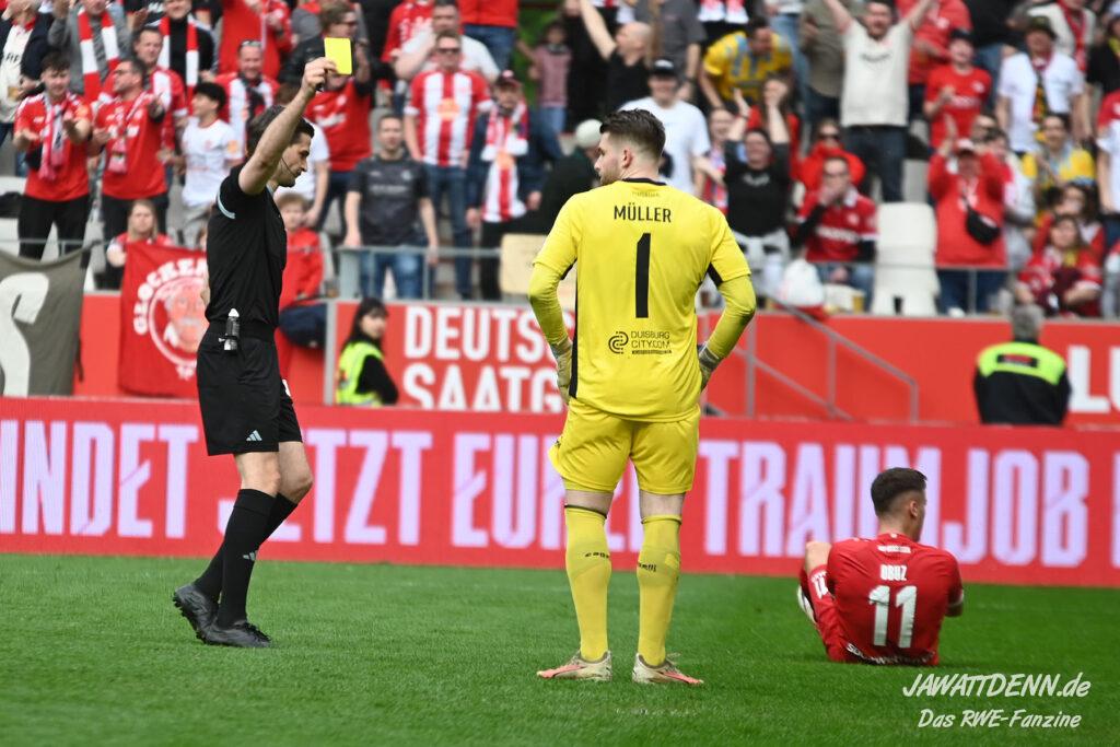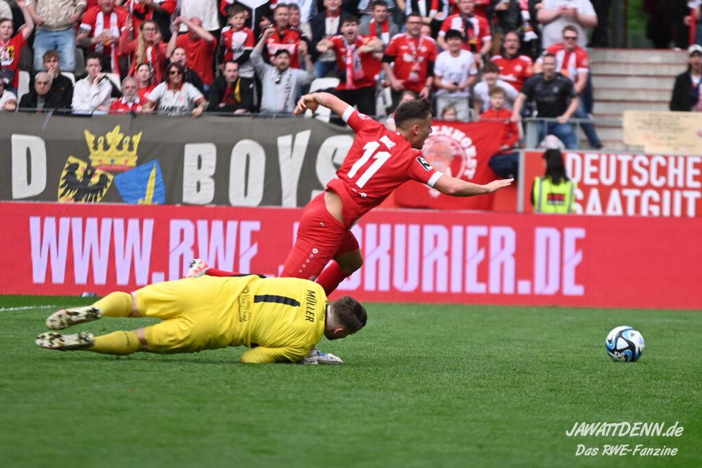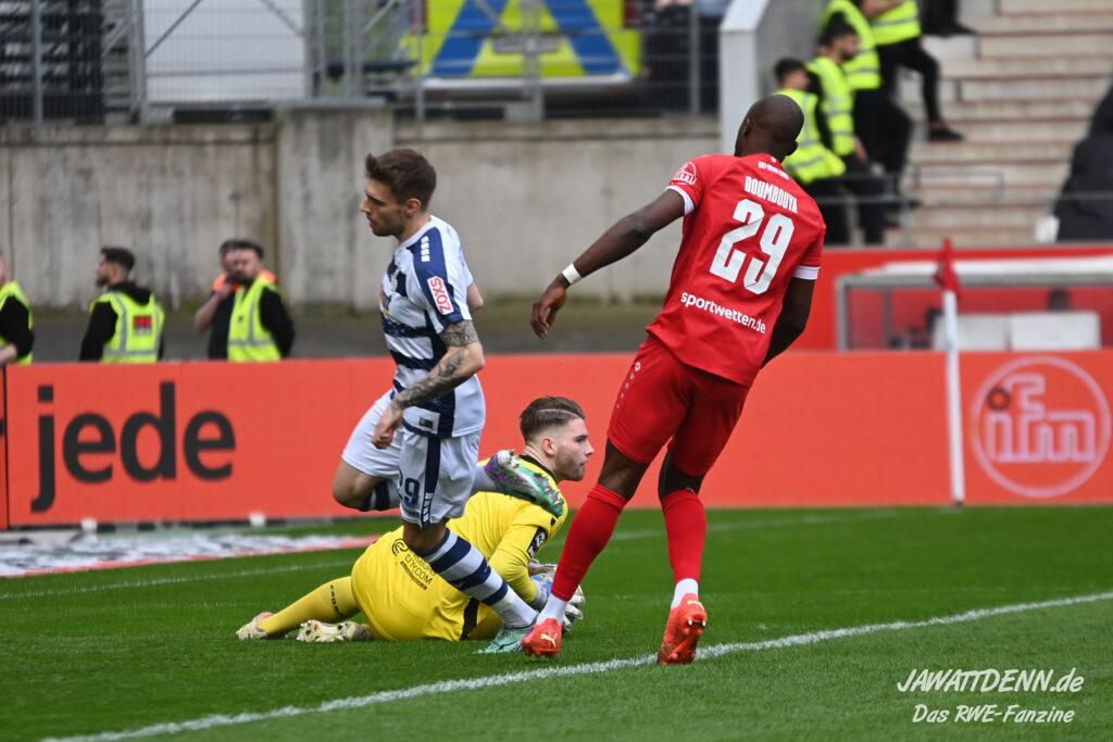 Nach der 2:1-Führung durch eher ungewohnte Stärken setzte RWE wieder auf altbekannte Waffen. Die weit aufgerückten Duisburger sollten wieder mit direkten Pässen in die Tiefe und überfallartigen Kontern schachmatt gesetzt werden. Ein Ball von Harenbrock auf den durchgestarteten Obuz findet sein Ziel auch mit Hilfe des Duisburger Innenverteidigers Knoll, der den Weg des Balles völlig falsch einschätzte. In der Folge wollte Obuz Torwart Müller umkurven, wurde aber von ihm gefällt wie eine kaputte Eiche an der Duisburger Sechs-Seen-Platte, hier konnte Schiedsrichter Dr. Max Burda nur auf den Punkt zeigen. Diese Aufgabe übernimmt zurzeit Moussa Doumbouya, der trotz mäßigen Spiels einmal mehr vom Punkt keine Nerven zeigte.