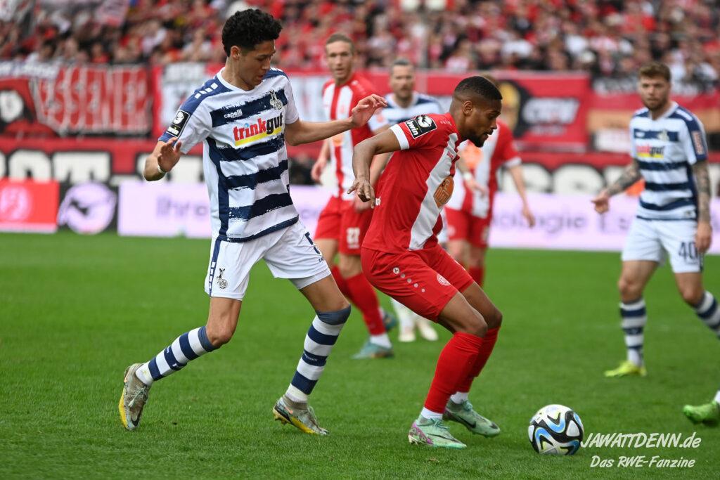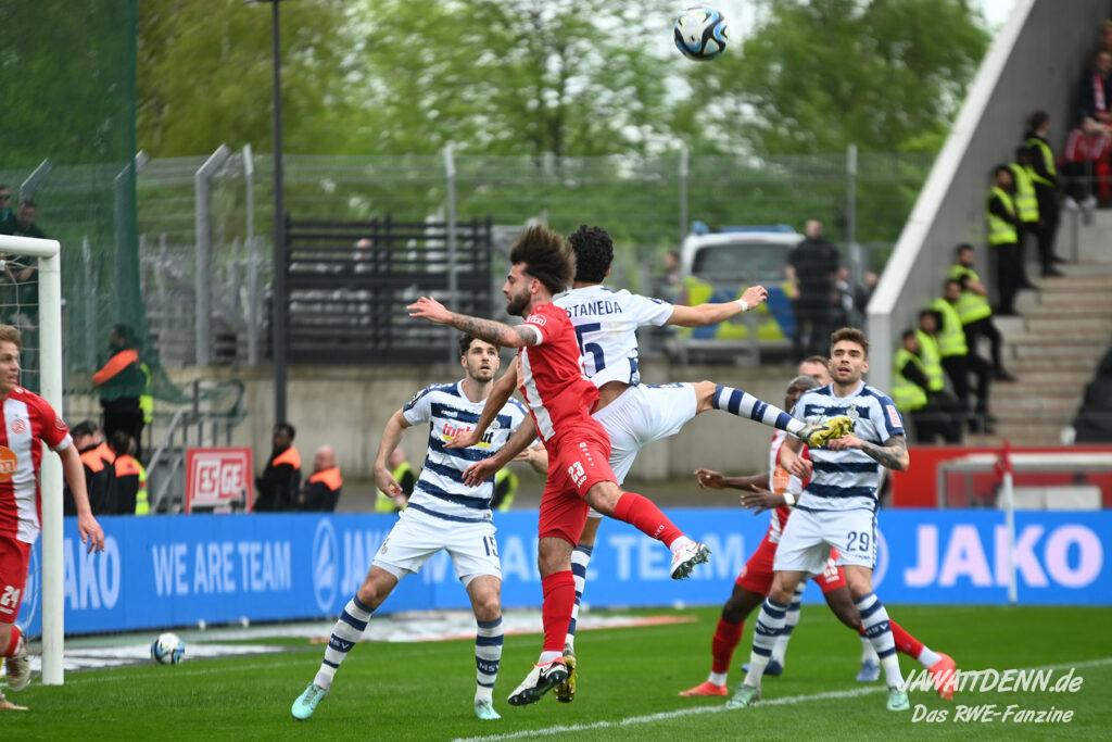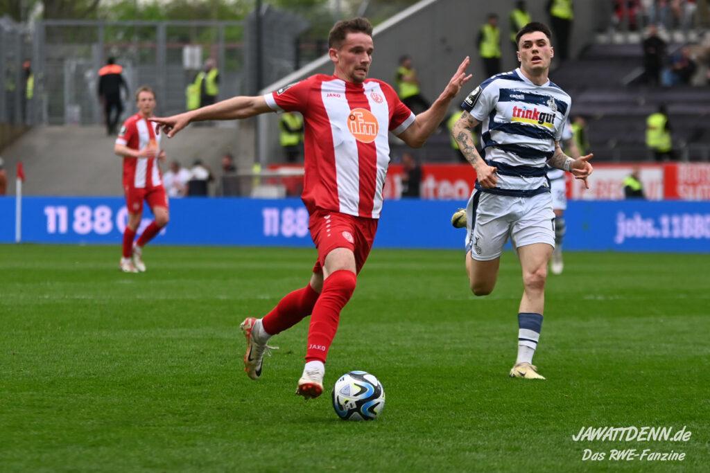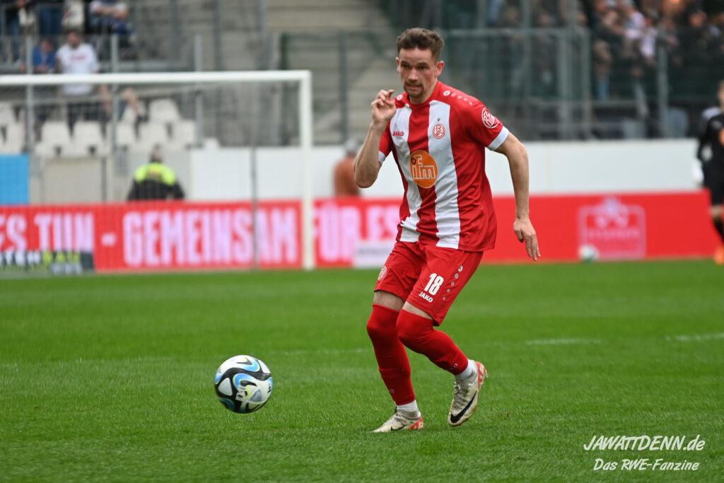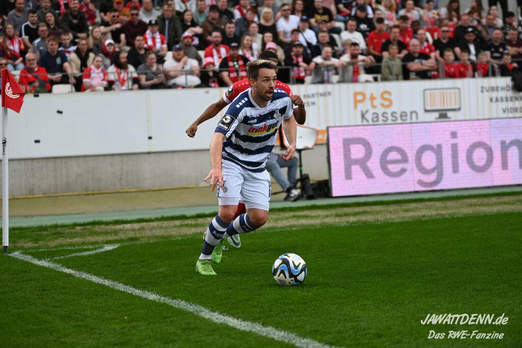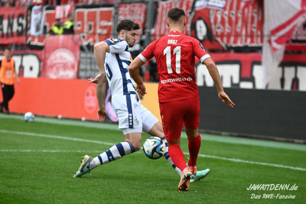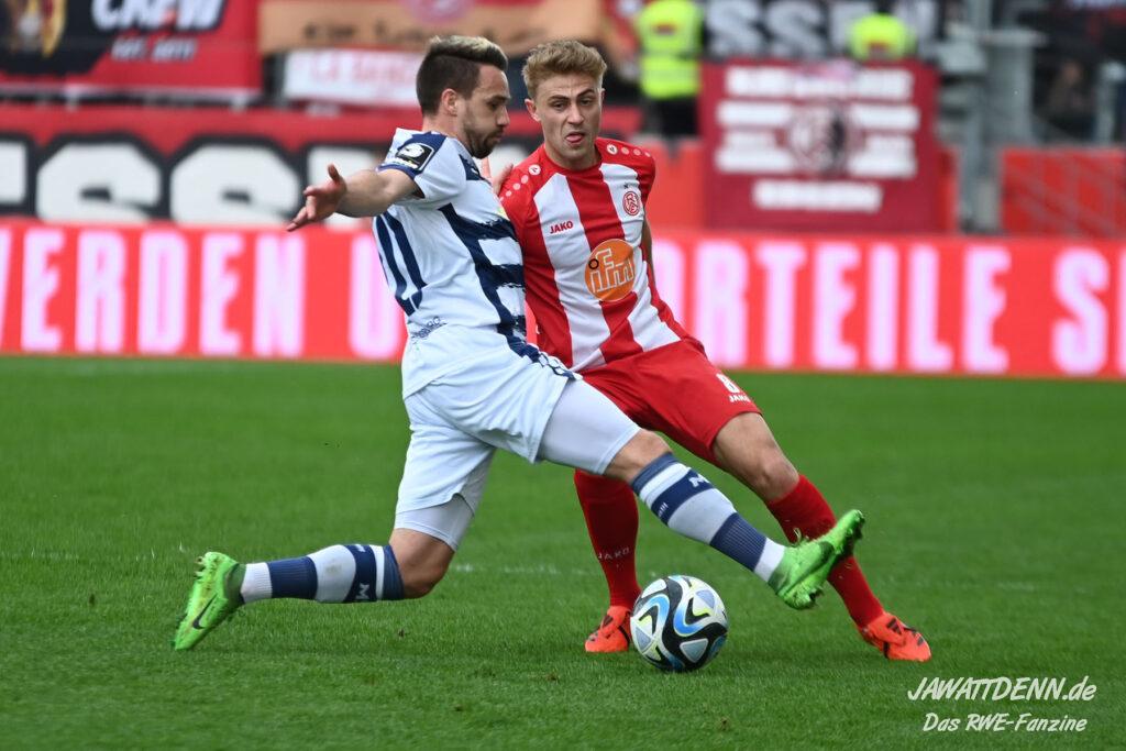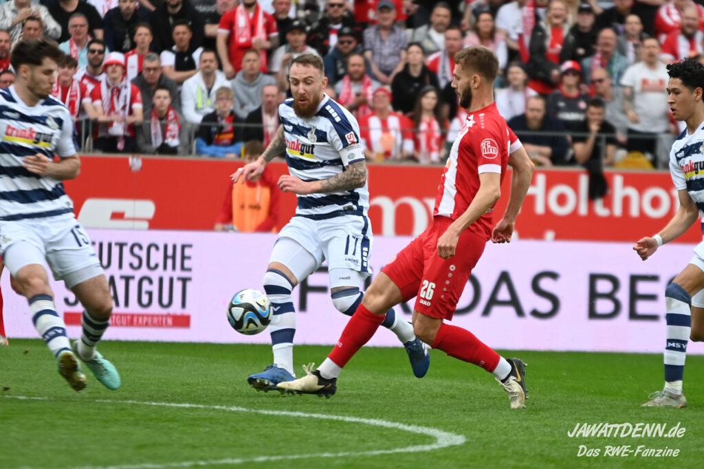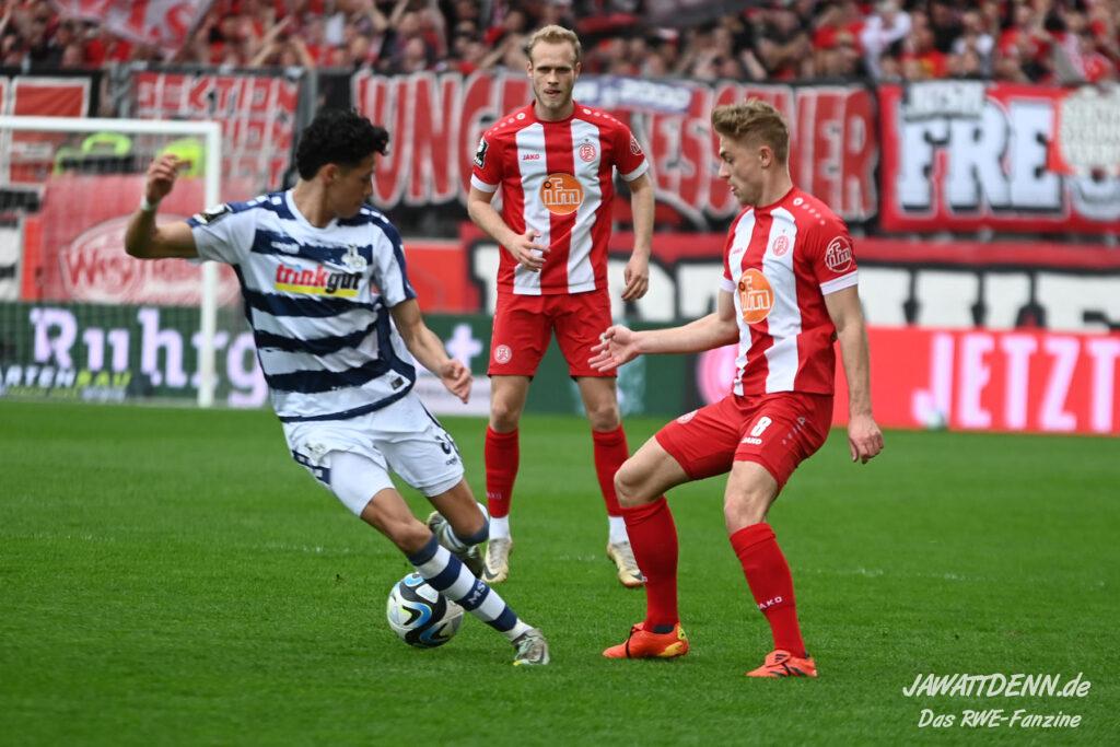Zudem fiel auf, dass ähnlich zum Spiel gegen den BVB 2 die Dominanz zu Beginn nicht unbedingt zu gefährlichen Aktionen führte. RWE wollte den MSV anscheinend müde spielen, tat sich aber von außen gesehen schwer mit der engmaschigen Fünferkette. So uninspiriert, wie der MSV gewirkt hat, wäre hier mehr drin gewesen, dazu fehlte aber die Geschwindigkeit und die entscheidende Kreativität, um die weiß-blaue Defensive zu Beginn der Partie ins Schwitzen zu bringen.