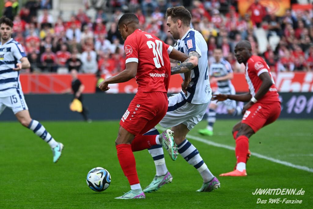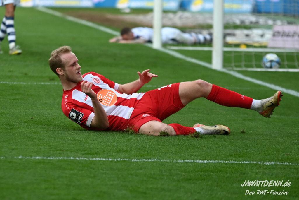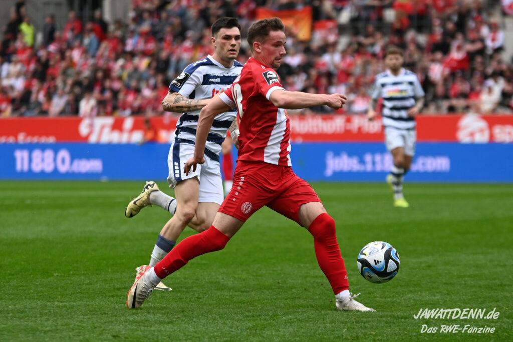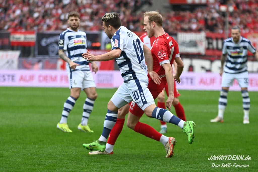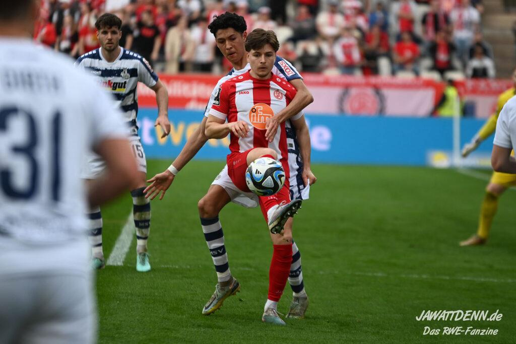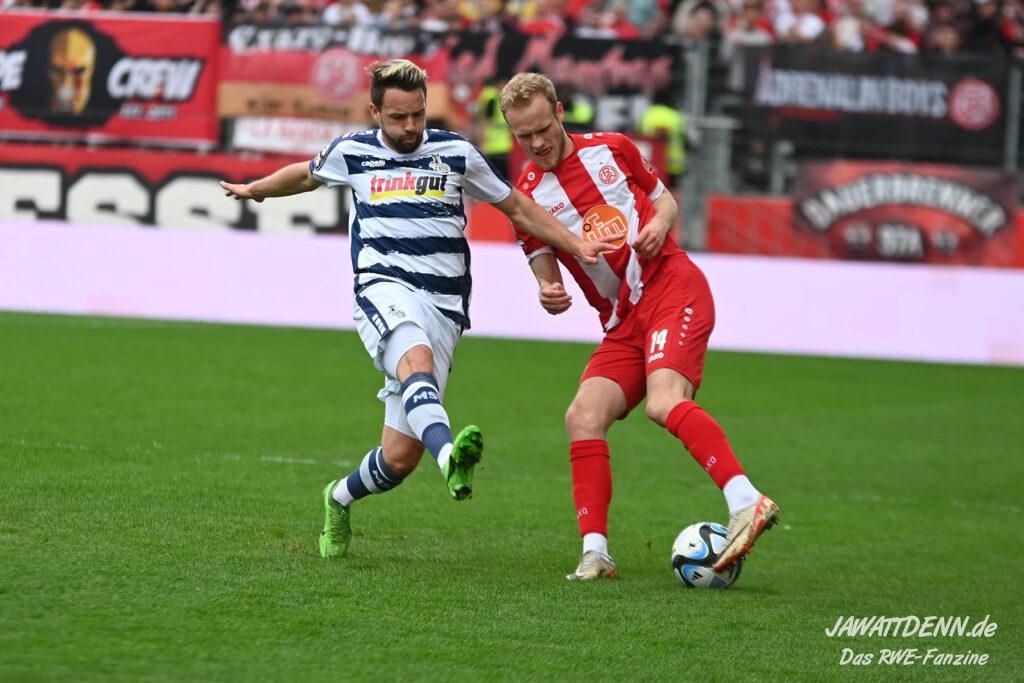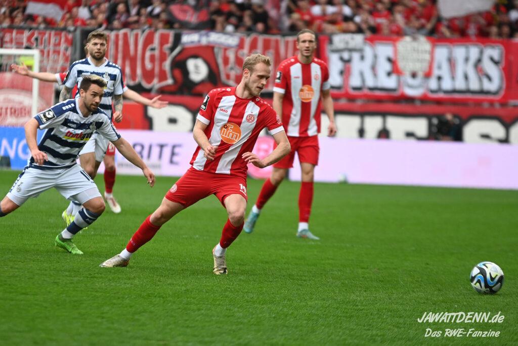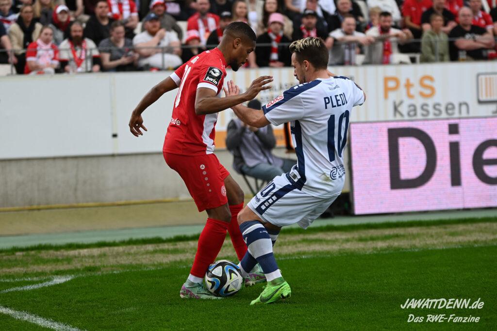 Zudem fiel auf, dass ähnlich zum Spiel gegen den BVB 2 die Dominanz zu Beginn nicht unbedingt zu gefährlichen Aktionen führte. RWE wollte den MSV anscheinend müde spielen, tat sich aber von außen gesehen schwer mit der engmaschigen Fünferkette. So uninspiriert, wie der MSV gewirkt hat, wäre hier mehr drin gewesen, dazu fehlte aber die Geschwindigkeit und die entscheidende Kreativität, um die weiß-blaue Defensive zu Beginn der Partie ins Schwitzen zu bringen.