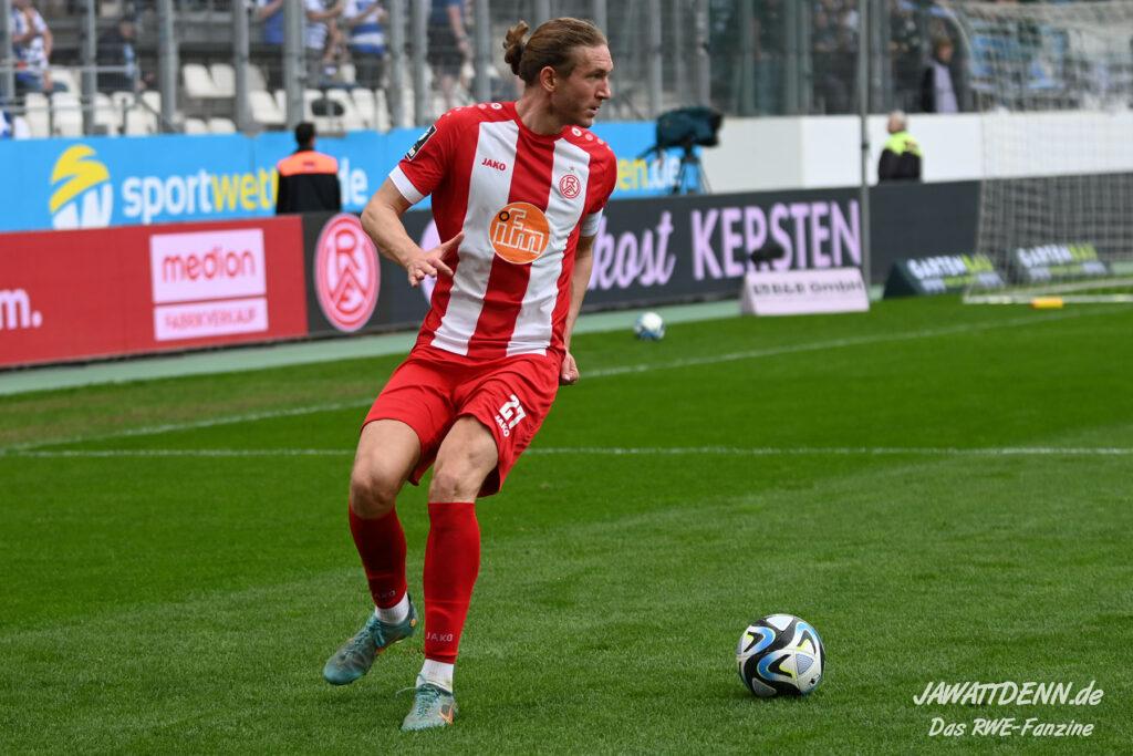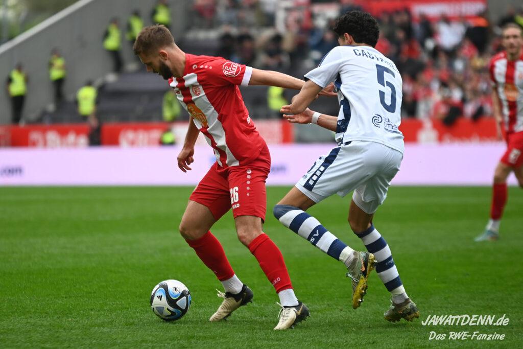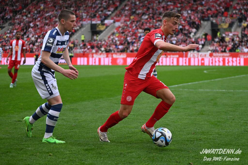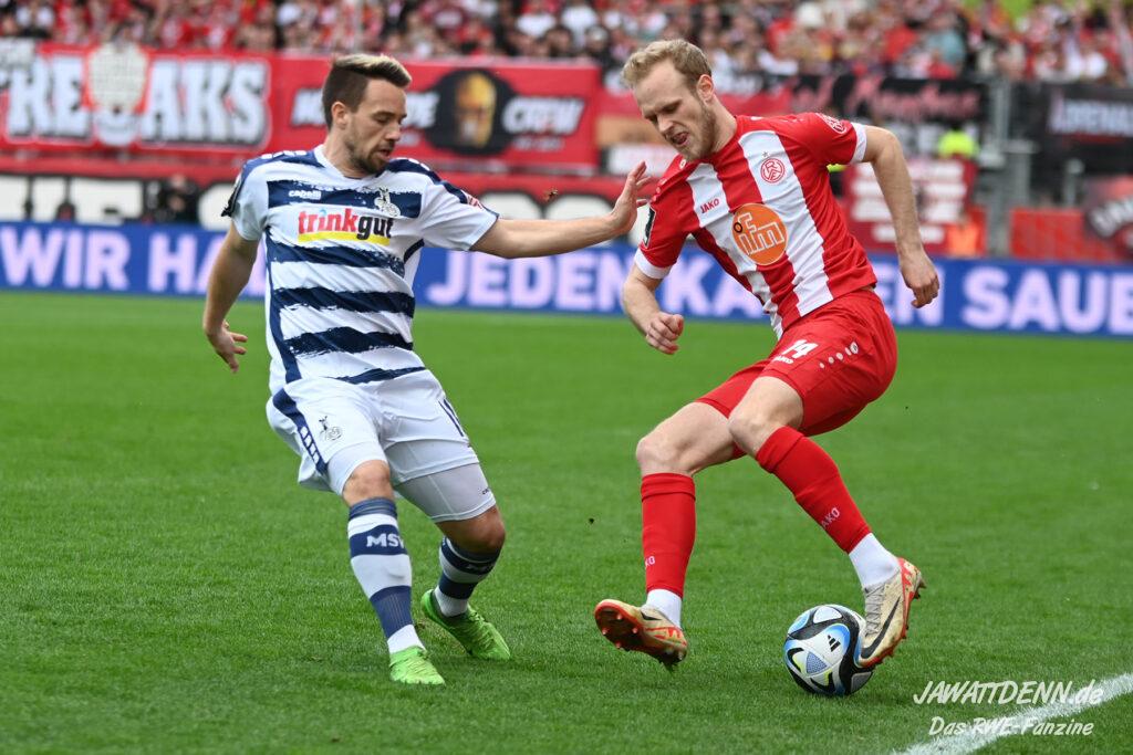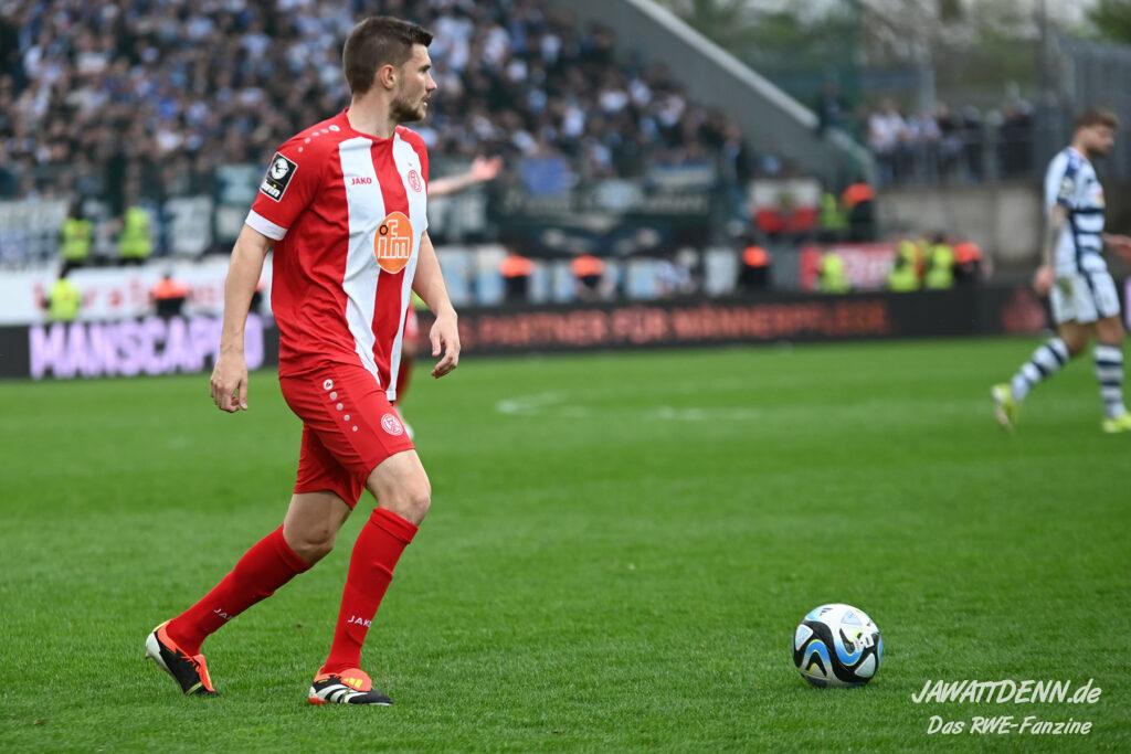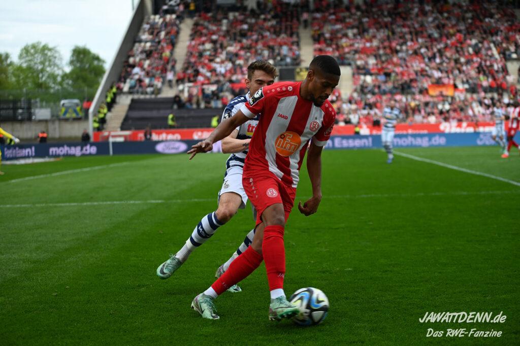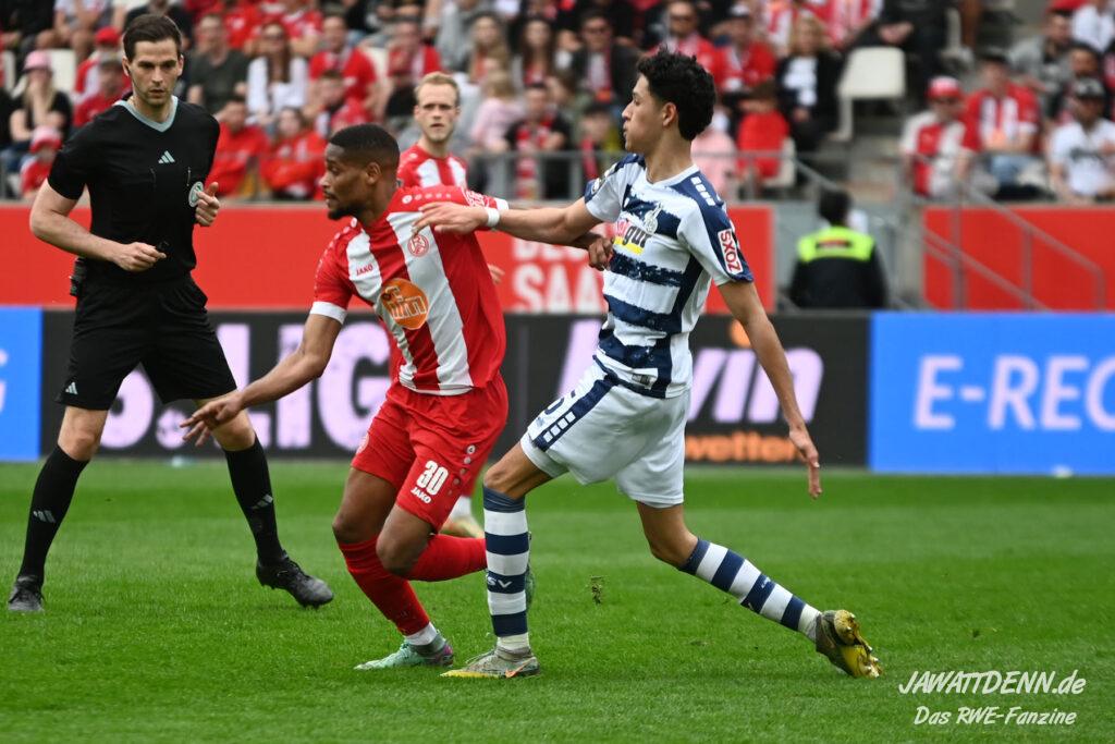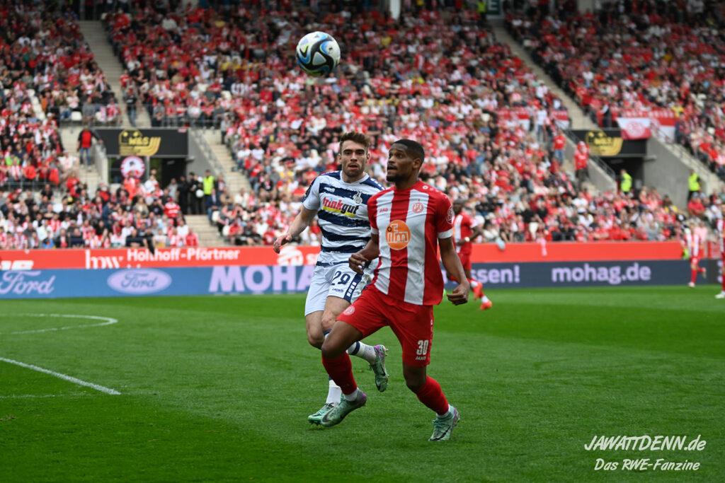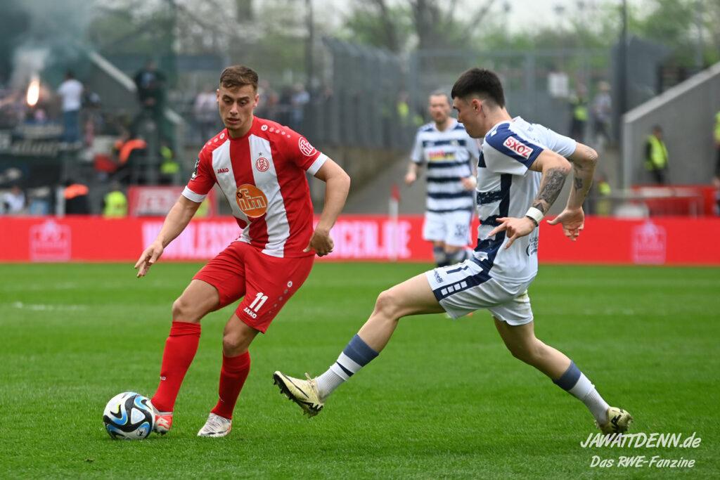 Zudem fiel auf, dass ähnlich zum Spiel gegen den BVB 2 die Dominanz zu Beginn nicht unbedingt zu gefährlichen Aktionen führte. RWE wollte den MSV anscheinend müde spielen, tat sich aber von außen gesehen schwer mit der engmaschigen Fünferkette. So uninspiriert, wie der MSV gewirkt hat, wäre hier mehr drin gewesen, dazu fehlte aber die Geschwindigkeit und die entscheidende Kreativität, um die weiß-blaue Defensive zu Beginn der Partie ins Schwitzen zu bringen.