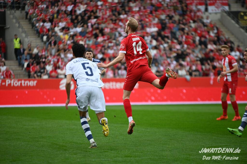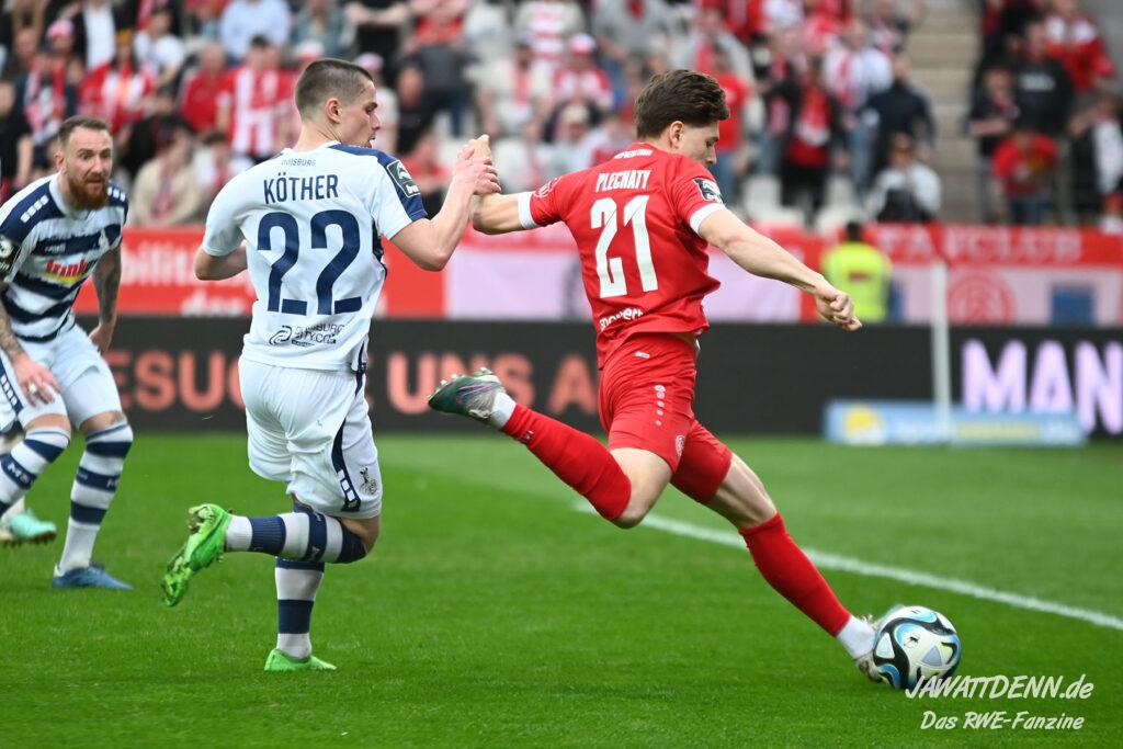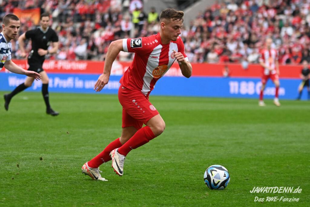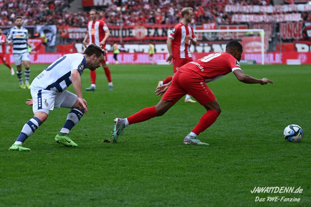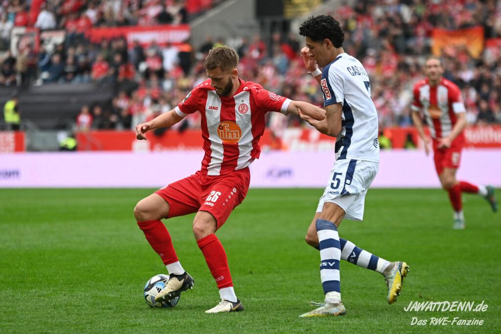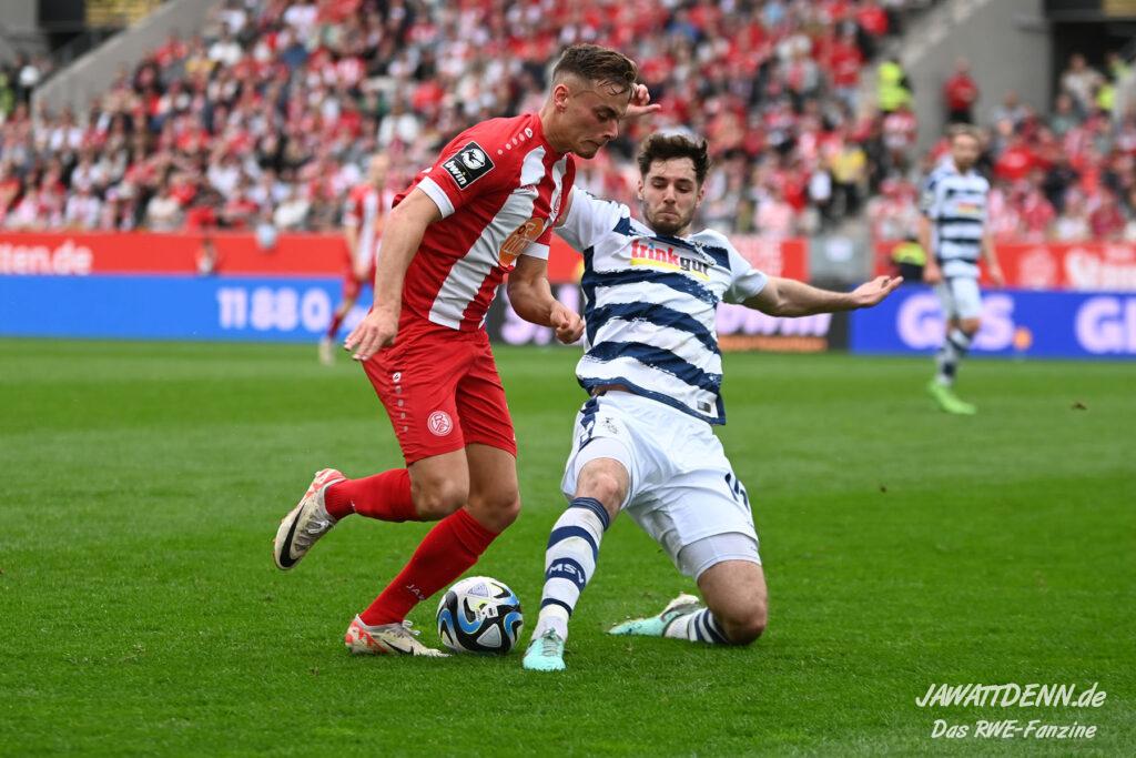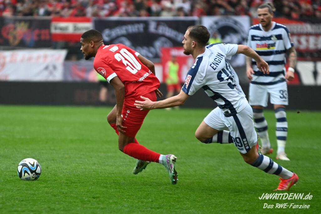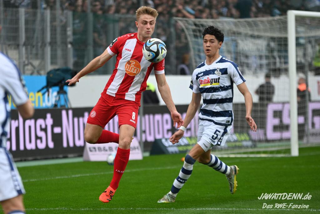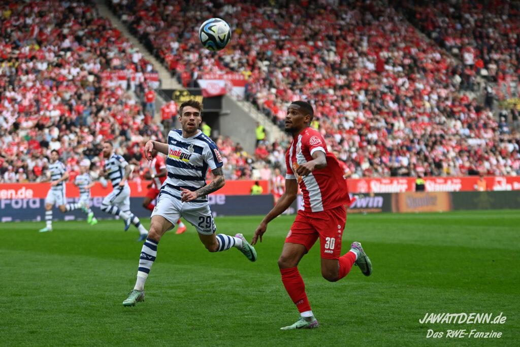 Zudem fiel auf, dass ähnlich zum Spiel gegen den BVB 2 die Dominanz zu Beginn nicht unbedingt zu gefährlichen Aktionen führte. RWE wollte den MSV anscheinend müde spielen, tat sich aber von außen gesehen schwer mit der engmaschigen Fünferkette. So uninspiriert, wie der MSV gewirkt hat, wäre hier mehr drin gewesen, dazu fehlte aber die Geschwindigkeit und die entscheidende Kreativität, um die weiß-blaue Defensive zu Beginn der Partie ins Schwitzen zu bringen.