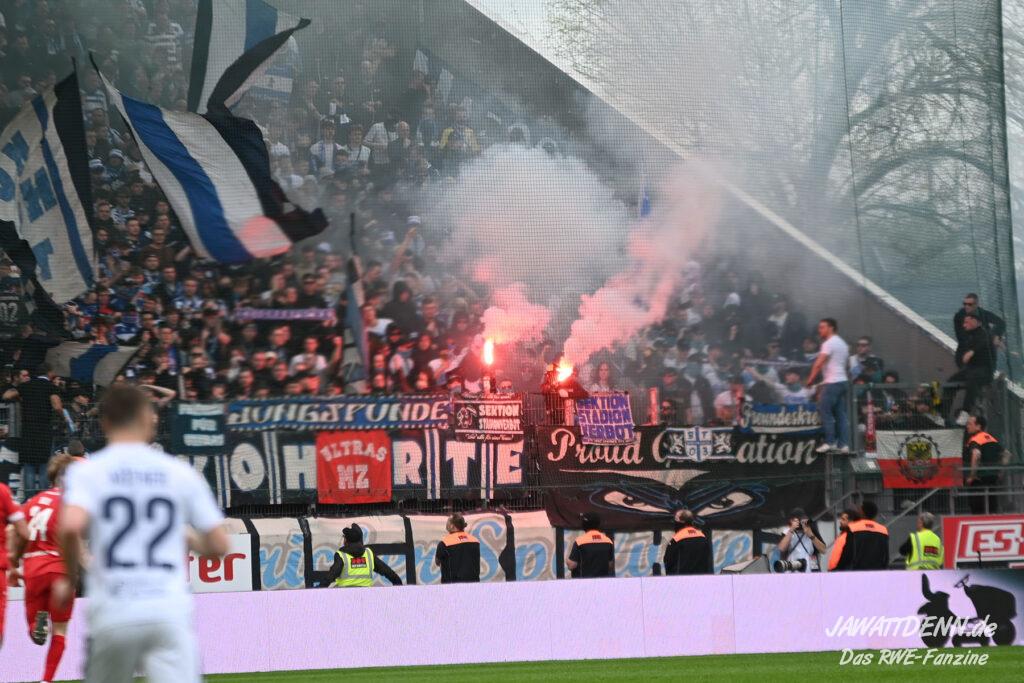 Ansonsten muss ja irgendwie damit gerechnet werden, dass besonders in einem Derby der Einsatz von Pyrotechnik kommt wie das Amen in der Kirche. Polizei und Ordner hatten sich auf diesen Fall zwar vorbereitet, indem die große Blockfahne nicht zum Einsatz kommen durfte, die Vorbereitungen auf solche Aktionen gut verbergen kann, gezündet wurde aber trotzdem. Hier scheiden sich bekanntlich die Geister, was aber absolut gar nicht geht, ist das Werfen von Böllern. Ausgerechnet gingen diese in den eigenen Reihen der Gästefans hoch, was einmal mehr zeigt, wie wenig in dem Oberstübchen mancher Kartenbezahler zu finden ist.