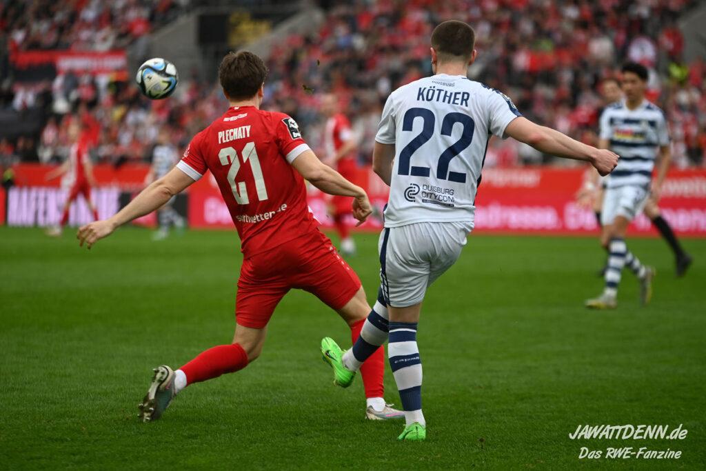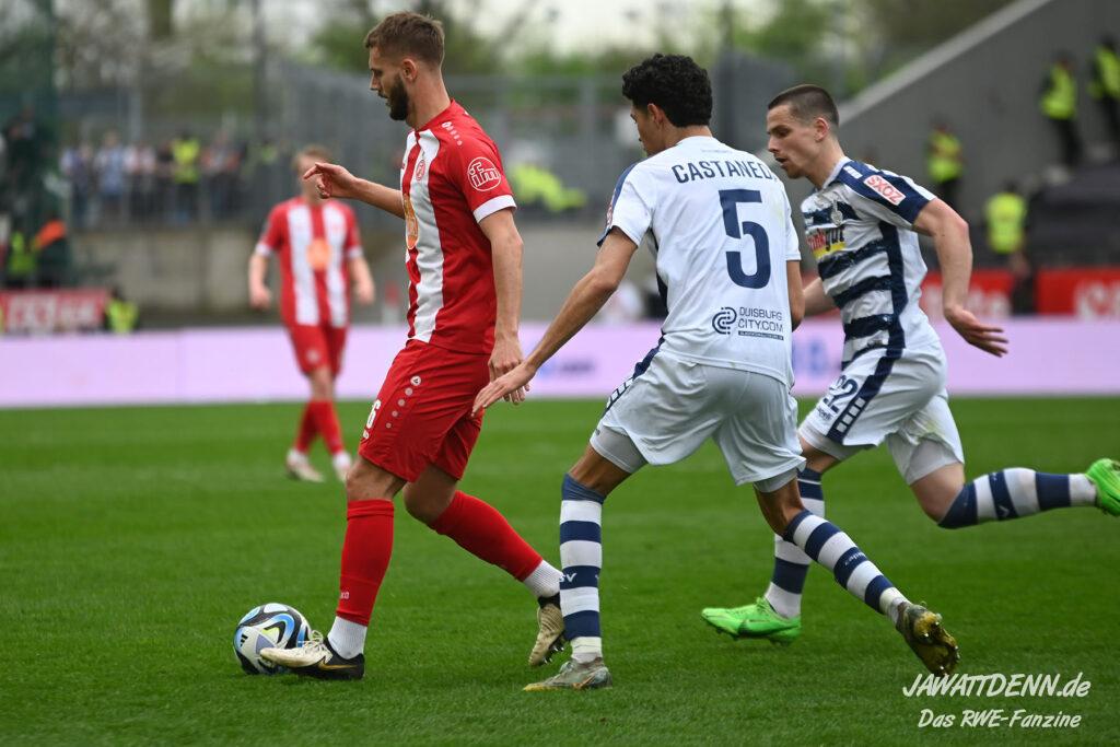 Nach zehn Minuten Leerlauf nahm RWE das Geschehen weites gehend in die Hand. Zugute kam der Heimelf die passive Spielweise des abstiegsbedrohten Gegners, die erst im letzten Drittel mit der Verteidigung anfingen. So konnte das rot-weisse Mittelfeld nahezu ungestört agieren, besonders auffällig war dies auf der rechten Angriffsseite zu beobachten. Während der Matchplan von Boris Schommers anscheinend war, die spielstarken Außenbahnspieler Young und Obuz auf die Füße zu stehen, durfte Nils Kaiser ungehindert Meter machen und Flanken in den Duisburger Strafraum setzen. Auch Harenbrock und Müsel erkannte nach einigen Versuchen, statt den Ball in den Strafraum zu passen, lieber den Abschluss von der Ferne aus zu setzen.