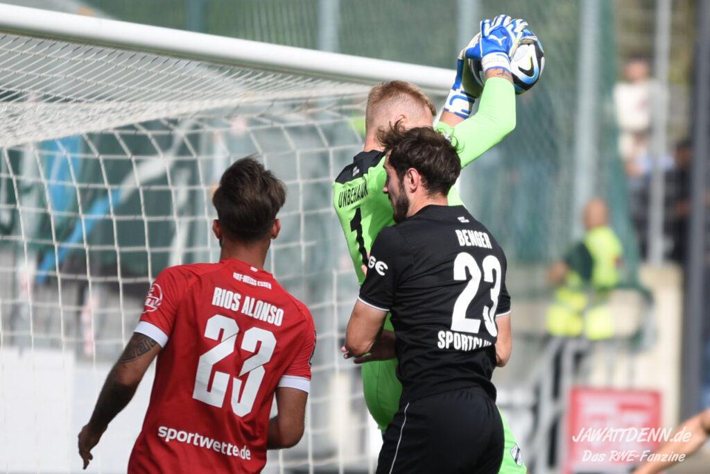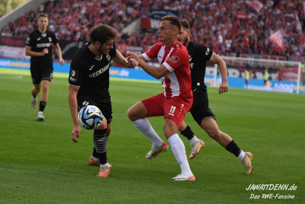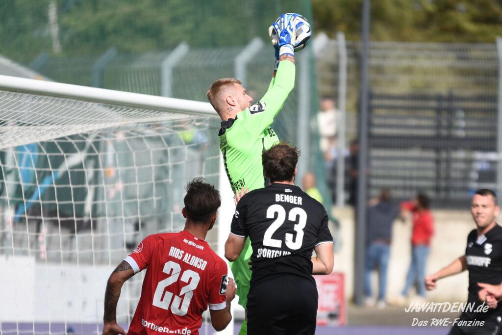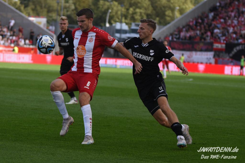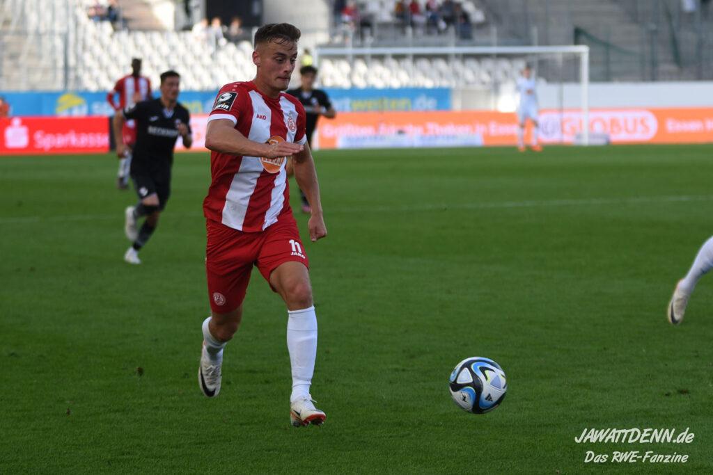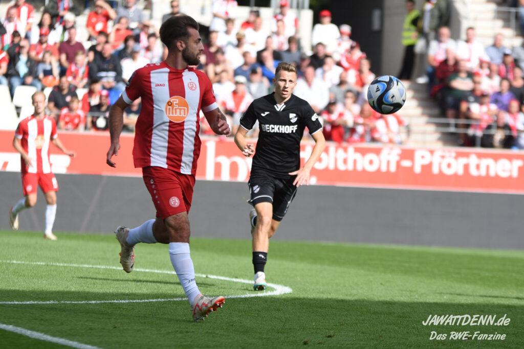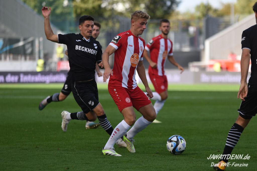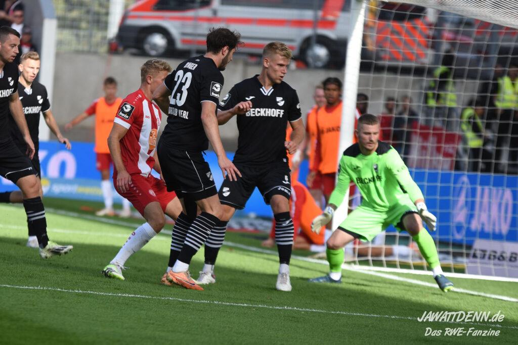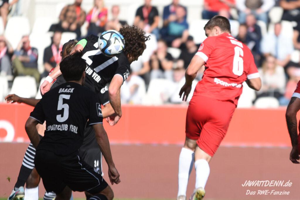 Mit Keeper Luca Unbehaun, den Bertels vom BVB 2 an die Verler Poststraße lotste, steht zwar ein junger Klassemann zwischen den Pfosten, aber ein Hochsicherheitstrakt war die Verler Box bislang nicht. Das Aufbauspiel der Verler ist riskant und für RWE mit aggressivem Pressing nutzbar, um Chancen zu kreieren. Hier wäre wohl der Ex-Verler Ron Berlinski (10 Tore für den Sportclub in der Spielzeit 21/22) prädestiniert. Auch bei Standards ist der Gast anfällig. Den diversen guten Fußballern in den Verler Reihen sollte RWE jedoch nicht allzu viel Raum offerieren. Für Kompaktheit und Anschieben im Mittelfeld sollte dann der zweite Ex-Verler Vinko Sapina, falls einsatzfähig, sorgen.