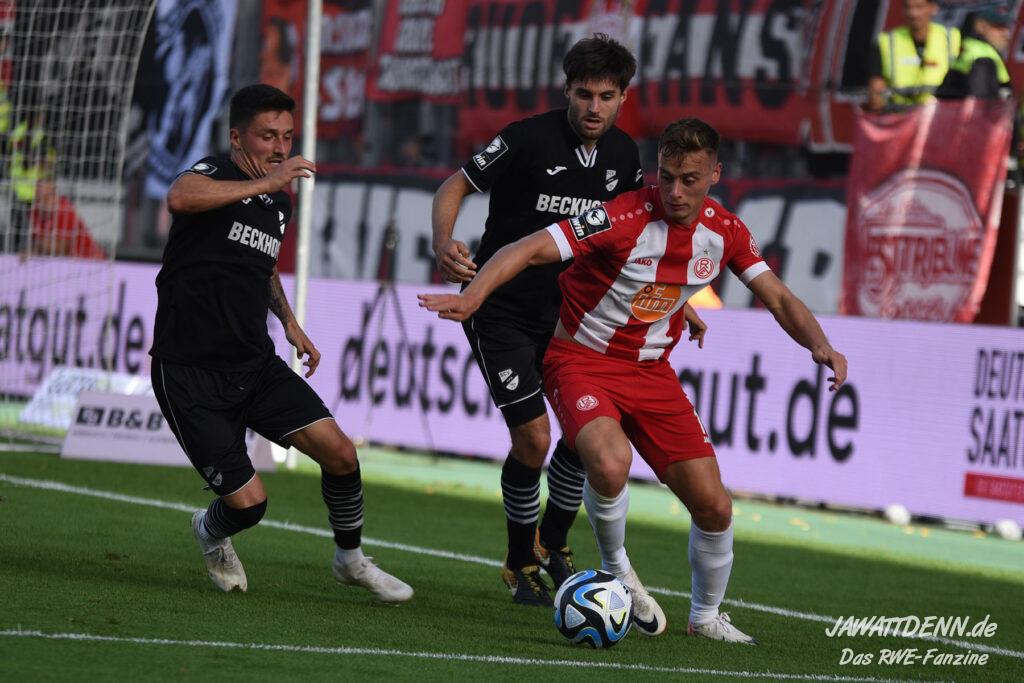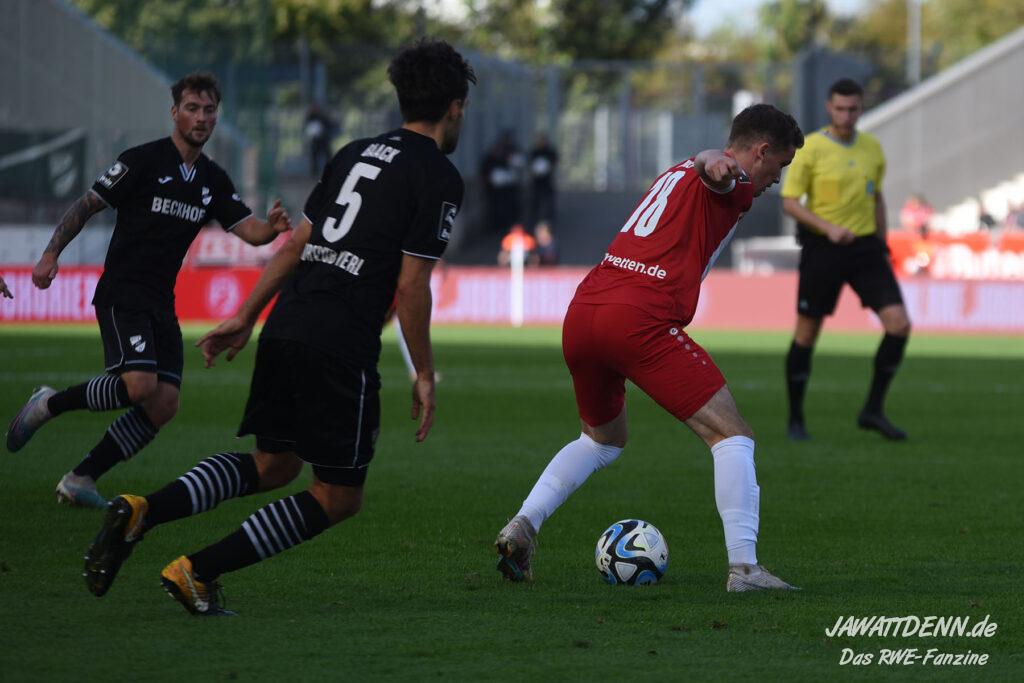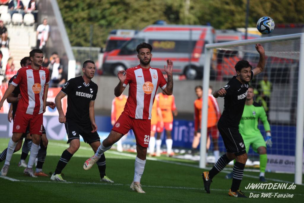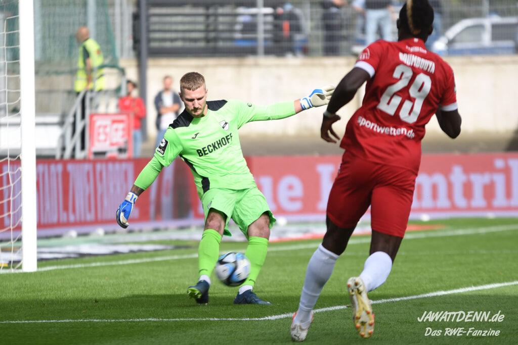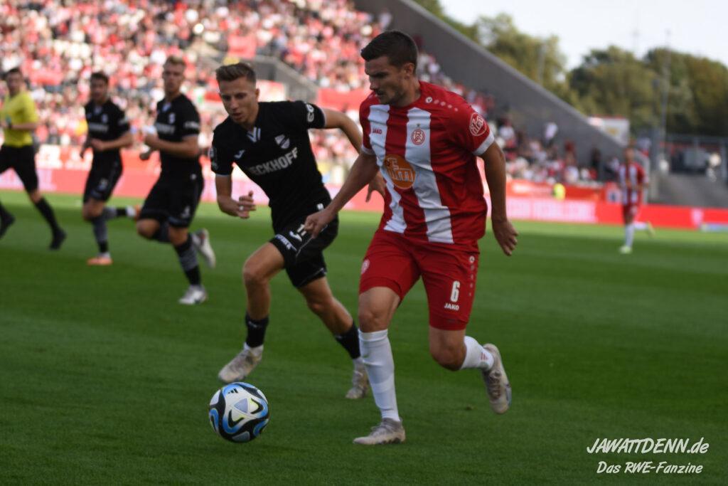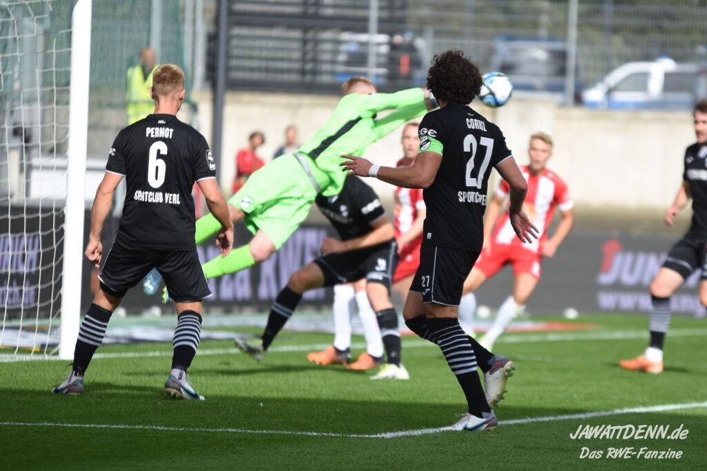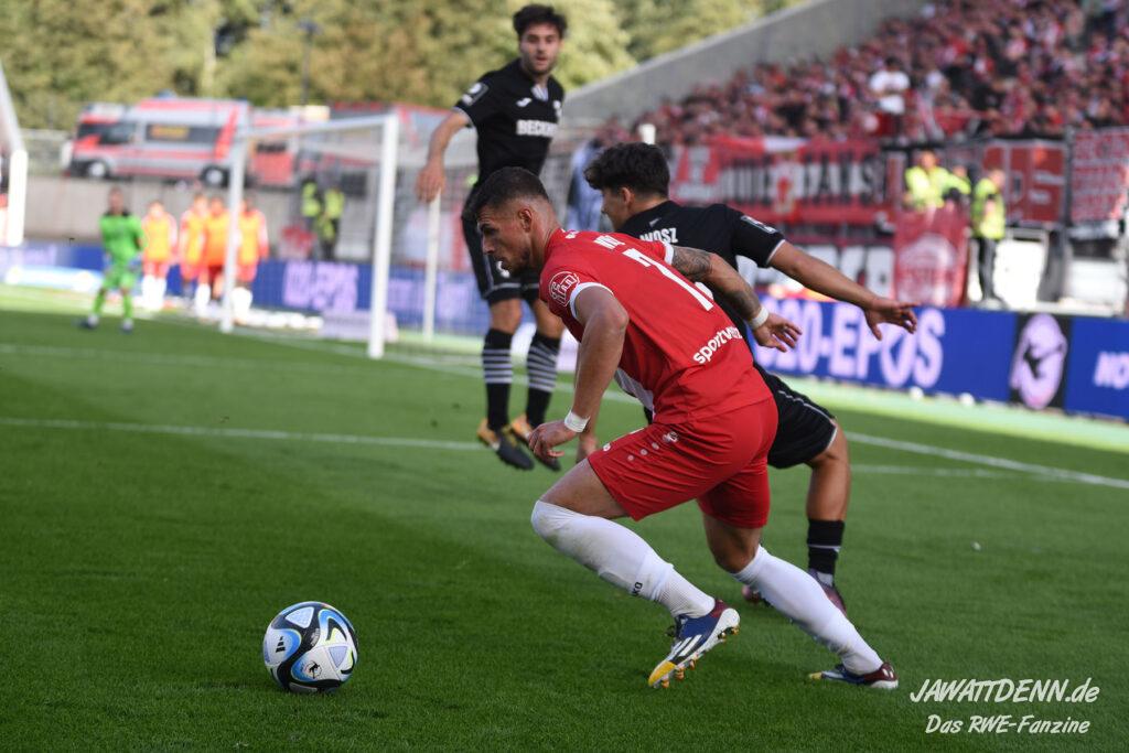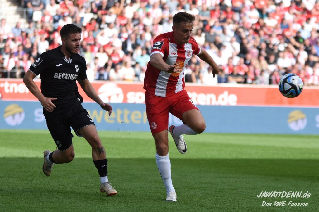 Mit Keeper Luca Unbehaun, den Bertels vom BVB 2 an die Verler Poststraße lotste, steht zwar ein junger Klassemann zwischen den Pfosten, aber ein Hochsicherheitstrakt war die Verler Box bislang nicht. Das Aufbauspiel der Verler ist riskant und für RWE mit aggressivem Pressing nutzbar, um Chancen zu kreieren. Hier wäre wohl der Ex-Verler Ron Berlinski (10 Tore für den Sportclub in der Spielzeit 21/22) prädestiniert. Auch bei Standards ist der Gast anfällig. Den diversen guten Fußballern in den Verler Reihen sollte RWE jedoch nicht allzu viel Raum offerieren. Für Kompaktheit und Anschieben im Mittelfeld sollte dann der zweite Ex-Verler Vinko Sapina, falls einsatzfähig, sorgen.