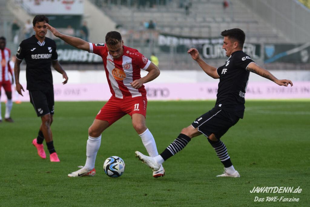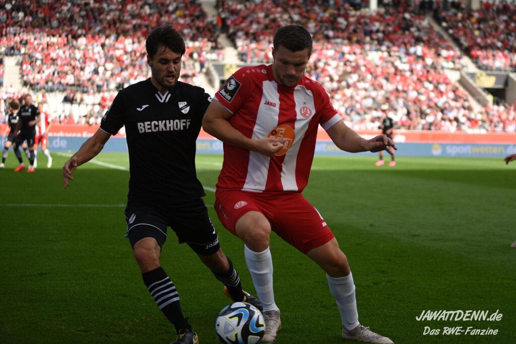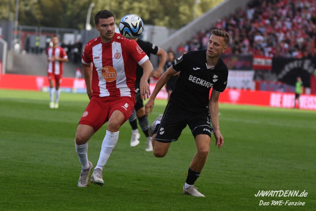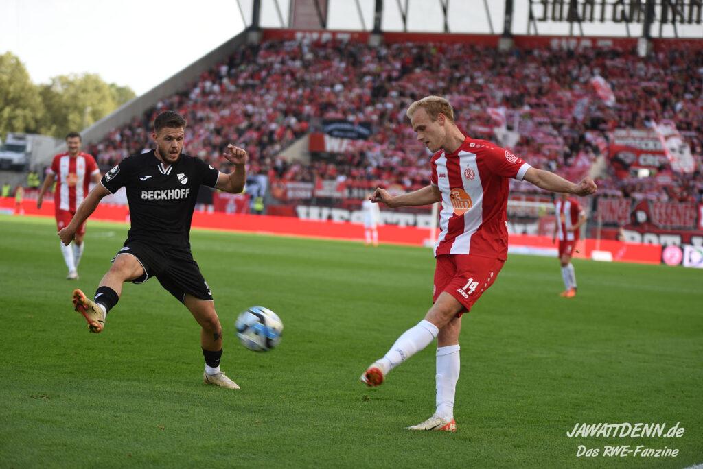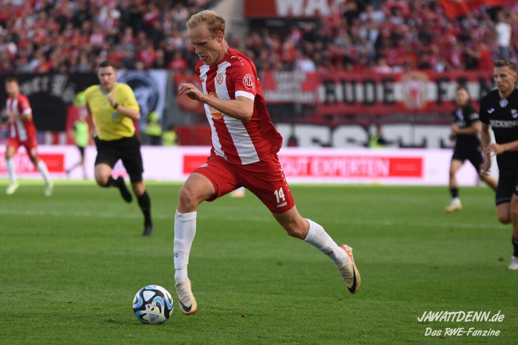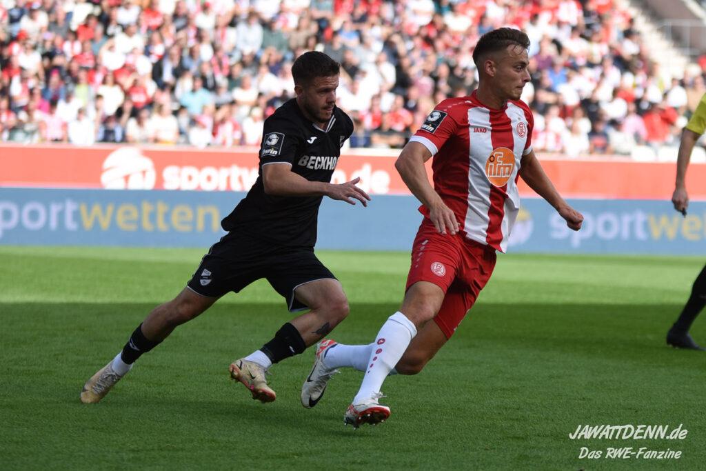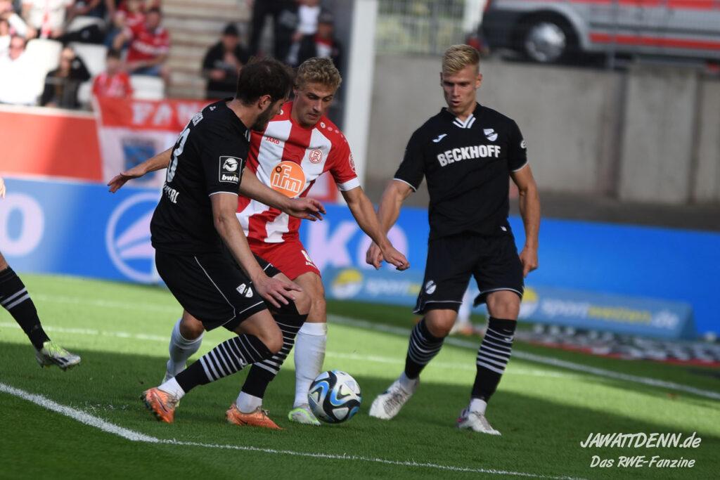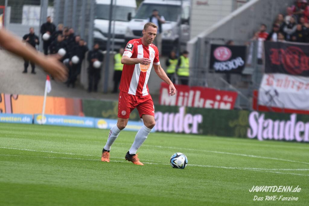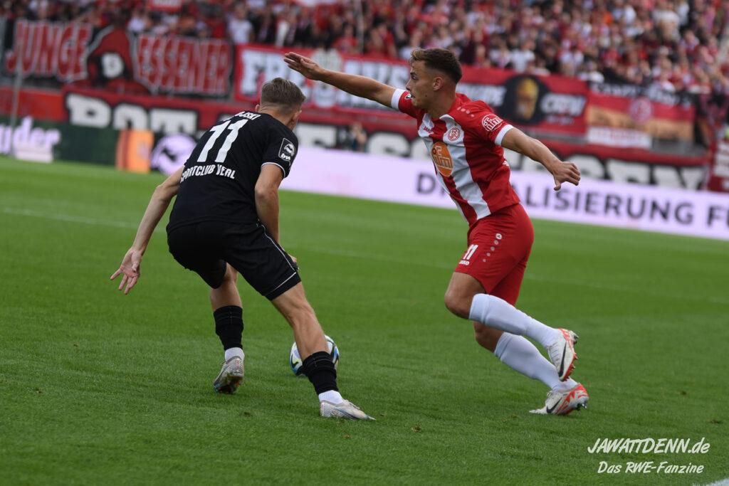 Mit Keeper Luca Unbehaun, den Bertels vom BVB 2 an die Verler Poststraße lotste, steht zwar ein junger Klassemann zwischen den Pfosten, aber ein Hochsicherheitstrakt war die Verler Box bislang nicht. Das Aufbauspiel der Verler ist riskant und für RWE mit aggressivem Pressing nutzbar, um Chancen zu kreieren. Hier wäre wohl der Ex-Verler Ron Berlinski (10 Tore für den Sportclub in der Spielzeit 21/22) prädestiniert. Auch bei Standards ist der Gast anfällig. Den diversen guten Fußballern in den Verler Reihen sollte RWE jedoch nicht allzu viel Raum offerieren. Für Kompaktheit und Anschieben im Mittelfeld sollte dann der zweite Ex-Verler Vinko Sapina, falls einsatzfähig, sorgen.