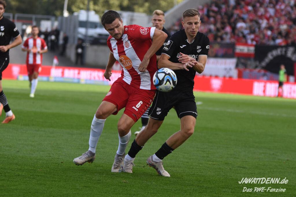 Bei allem Frust wirkt die Klatsche gegen Verl – auch im Verbund mit dem 0:4 unter der Woche – alles andere als unerklärlich. Angesichts von drei Spielen in sieben Tagen versuchte sich Christoph Dabrowski unter der Woche an der Belastungssteuerung, die mit dem vorhandenen Kader schlicht nicht möglich ist. Andreas Wiegel und Lucas Brumme, die immer an ihre Grenzen und darüber hinaus gehen, sollten ihre Pause erhalten – Voufack und Voelcke konnten die beiden jedoch nicht gleichwertig ersetzen. Die Idee eines Umbaus zur Dreier-/Fünferkette in Unterhaching für vermeintlich mehr defensive Stabilität ging schief, da RWE im Gegenzug die Spielkontrolle hergab. Zur Halbzeit ging dann mit Felix Götze der beste Spieler der bisherigen Saison verletzt vom Platz, der überdies auch unübersehbar als Führungsspieler voran geht.