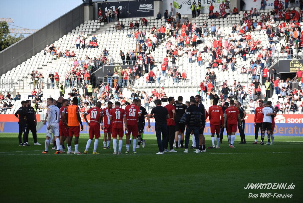 Bei allem Frust – denn heute hatte sicherlich jeder nach Spielende das Recht, zu pfeifen, sofern er dies denn für nötig hielt: Was nach Schlusspfiff auf den Rängen teilweise in Richtung Mannschaft abgesondert wurde, war noch deutlich schlechter als die unterirdische Darbietung auf dem Rasen und führte sowohl auf Rahn- als auch Westtribüne zu verbalen und körperlichen Auseinandersetzungen unter den eigenen Fans.