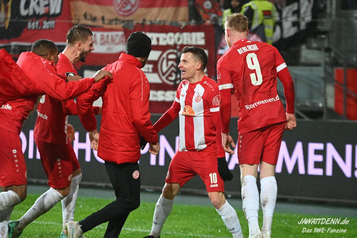 RWE spielte eine begeisternde zweite Halbzeit und eine der stärksten der bisherigen Saison. War die Partie in Hälfte eins noch ausgeglichen, RWE suchte in Persona von Vinko Sapina und Lucas Brumme aber lobenswerter Weise auch zweimal den Abschluss aus der Distanz, so kam Rot-Weiss mit großem Elan aus der Pause und stellte die Gäste sogleich vor für sie unlösbare Probleme. Anders als in Aue, als Essen die Partie ebenfalls begonnen hatte wie die Feuerwehr, dann aber nachließ, gelangen in den ersten 10 Minuten gleich zwei vorentscheidende Treffer.