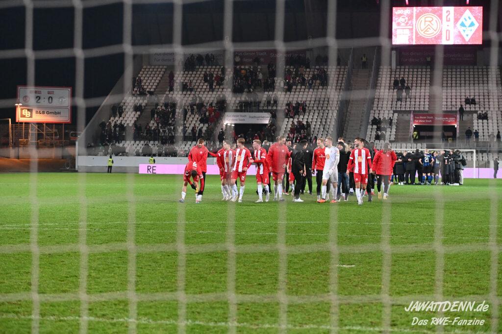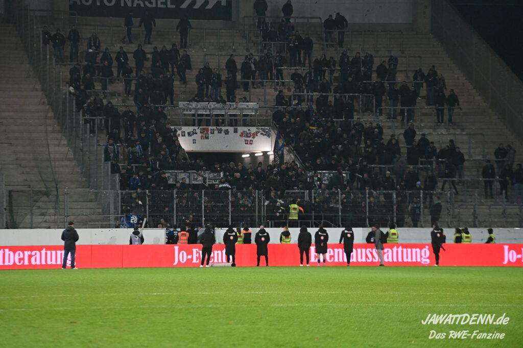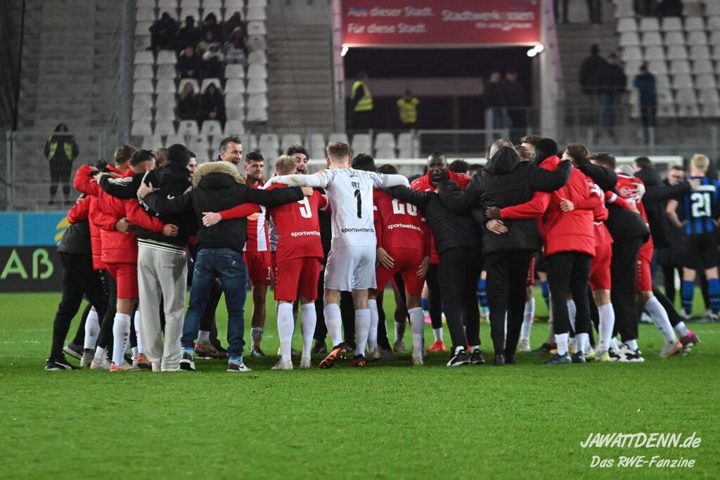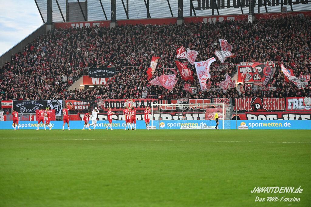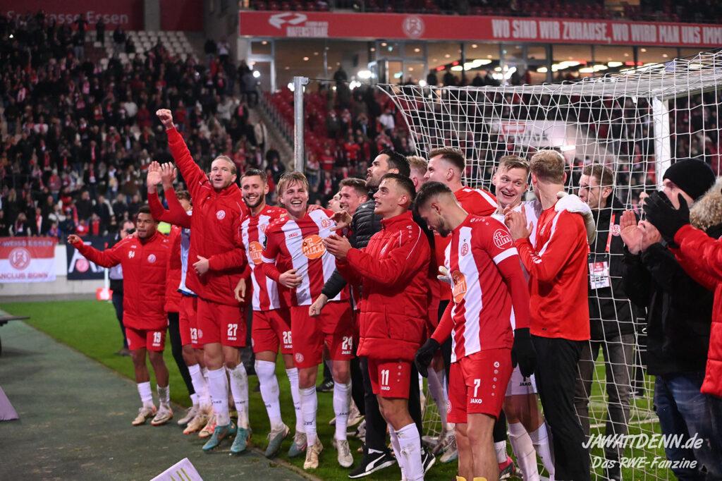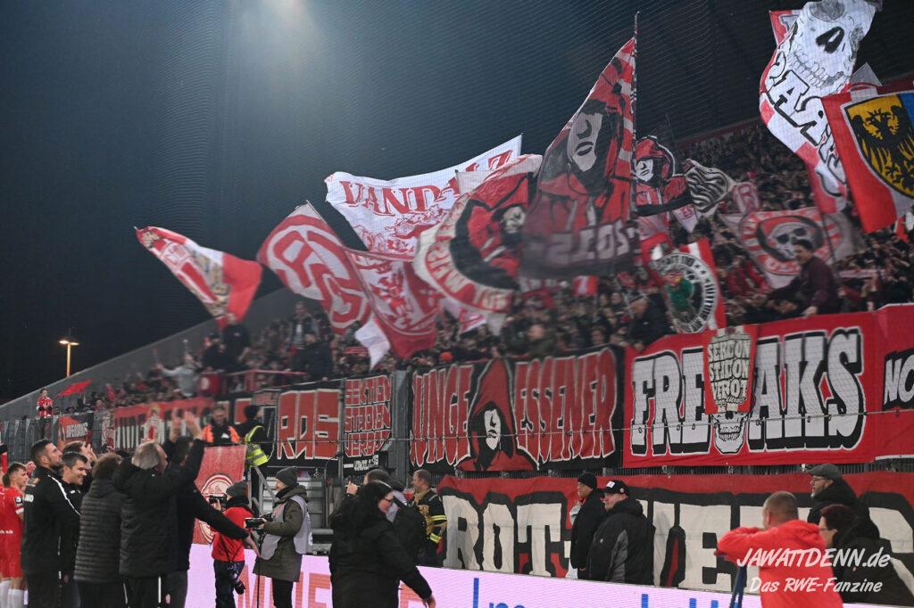 Nach einer schwierigen Premierensaison in der 3. Liga können es die meisten der 16.000 RWE-Fans nach dem fünften Sieg in Folge nicht fassen, dass sich RWE gerade in seiner bislang stärksten Saisonphase befindet und Platz 3 erfolgreich verteidigen konnte. Es gab Liebe für alle Beteiligten. Ein besonderer Moment war, dass die Fans Christoph Dabrowski hochleben ließen und das war deswegen so besonders, weil viele Anhänger es noch vor wenigen Wochen als dringend notwendig empfunden haben, dass ebenjener Trainer entlassen werden sollte. Gerade weil Dabrowski sich nicht hat beeindrucken lassen, ist es ihm zu gönnen, dass er auch positiv im Mittelpunkt stehen durfte.