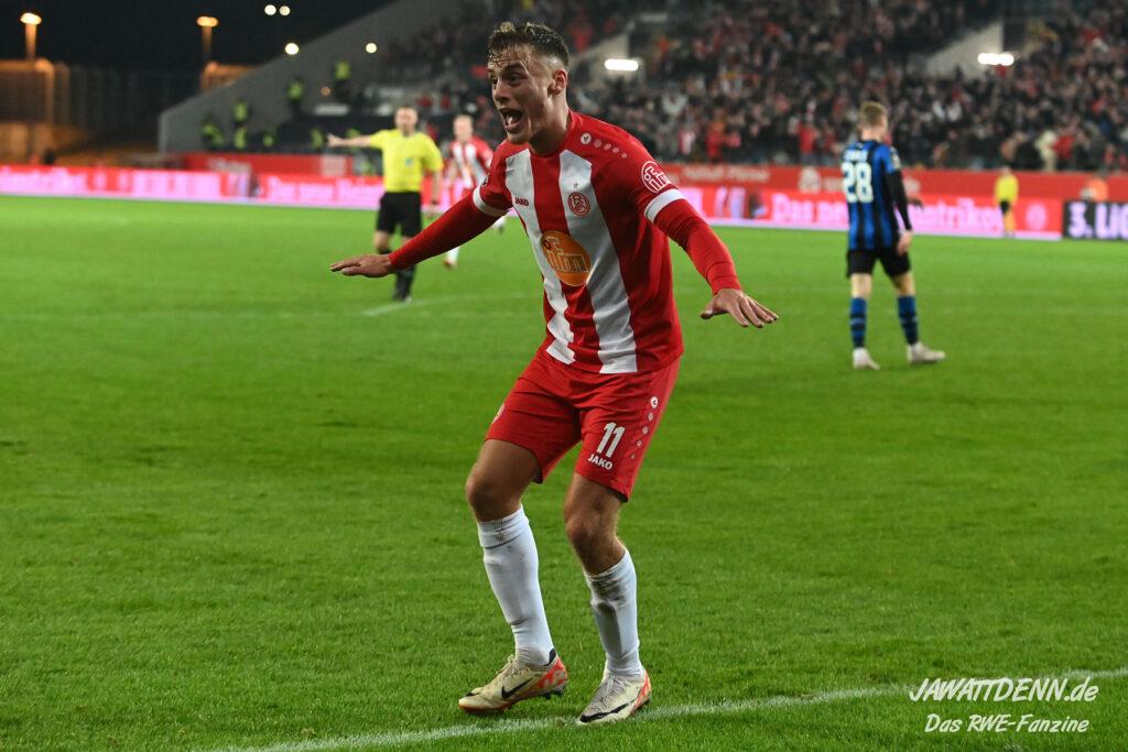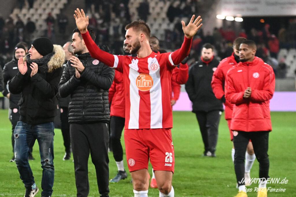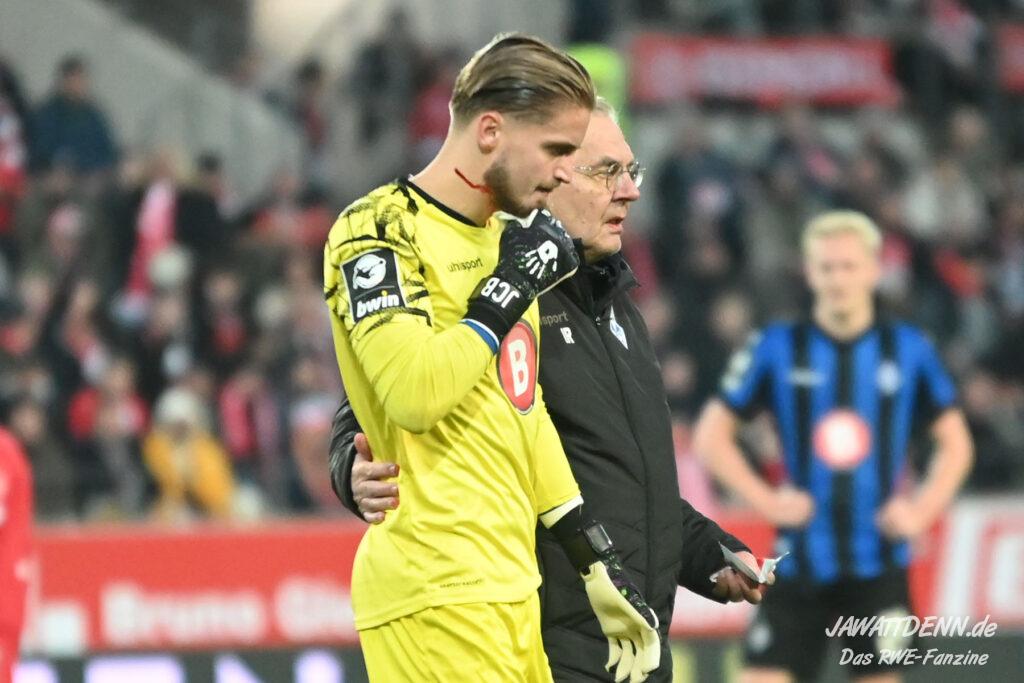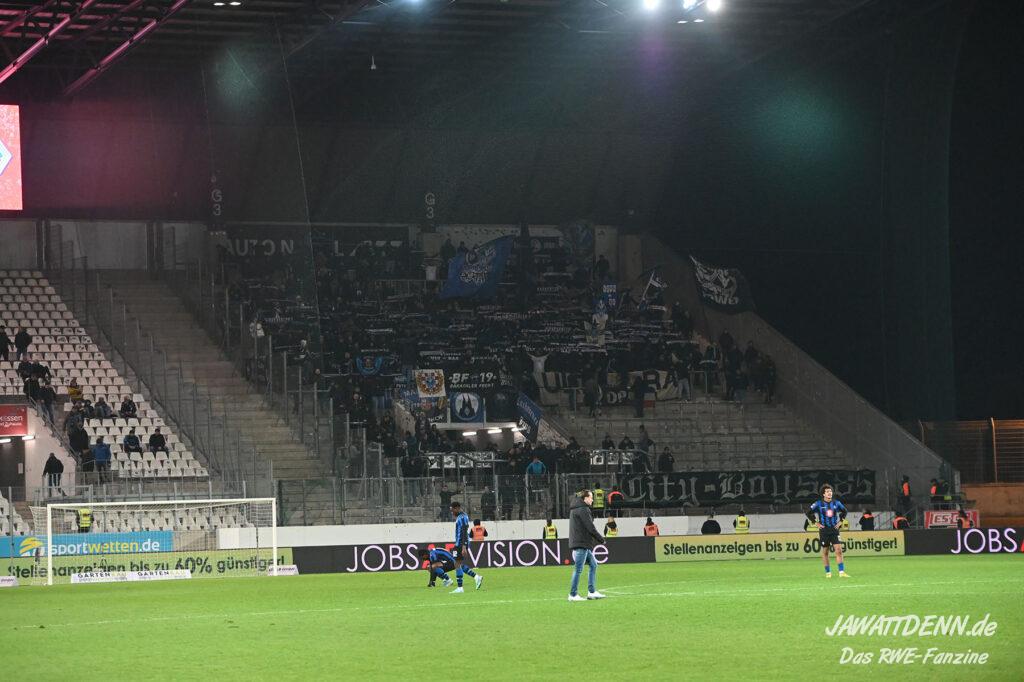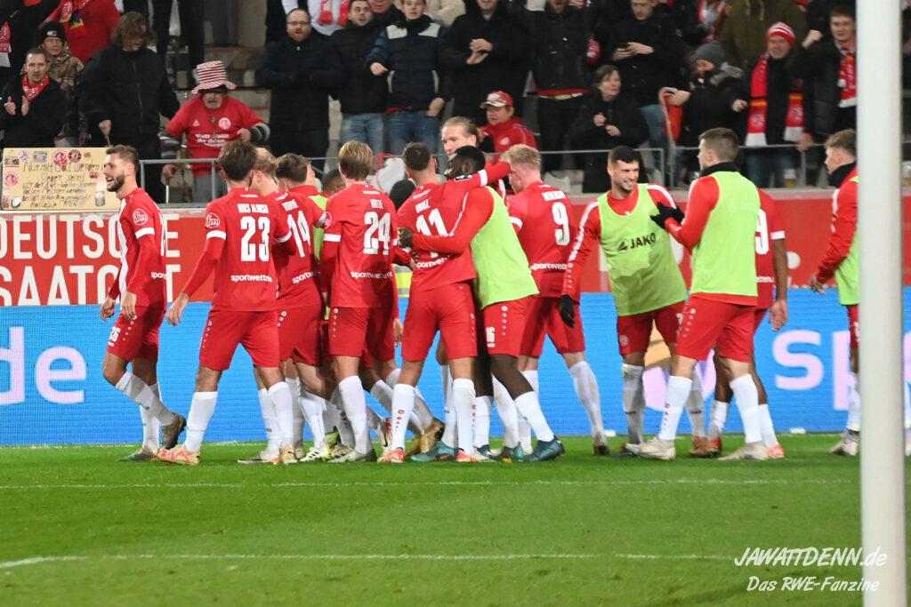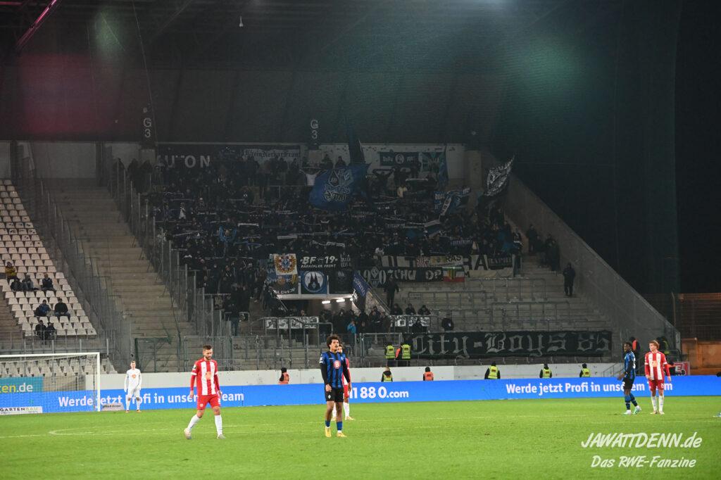 Nach einer schwierigen Premierensaison in der 3. Liga können es die meisten der 16.000 RWE-Fans nach dem fünften Sieg in Folge nicht fassen, dass sich RWE gerade in seiner bislang stärksten Saisonphase befindet und Platz 3 erfolgreich verteidigen konnte. Es gab Liebe für alle Beteiligten. Ein besonderer Moment war, dass die Fans Christoph Dabrowski hochleben ließen und das war deswegen so besonders, weil viele Anhänger es noch vor wenigen Wochen als dringend notwendig empfunden haben, dass ebenjener Trainer entlassen werden sollte. Gerade weil Dabrowski sich nicht hat beeindrucken lassen, ist es ihm zu gönnen, dass er auch positiv im Mittelpunkt stehen durfte.