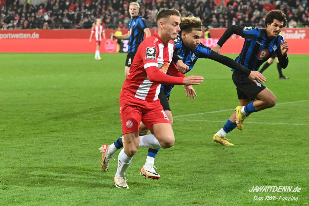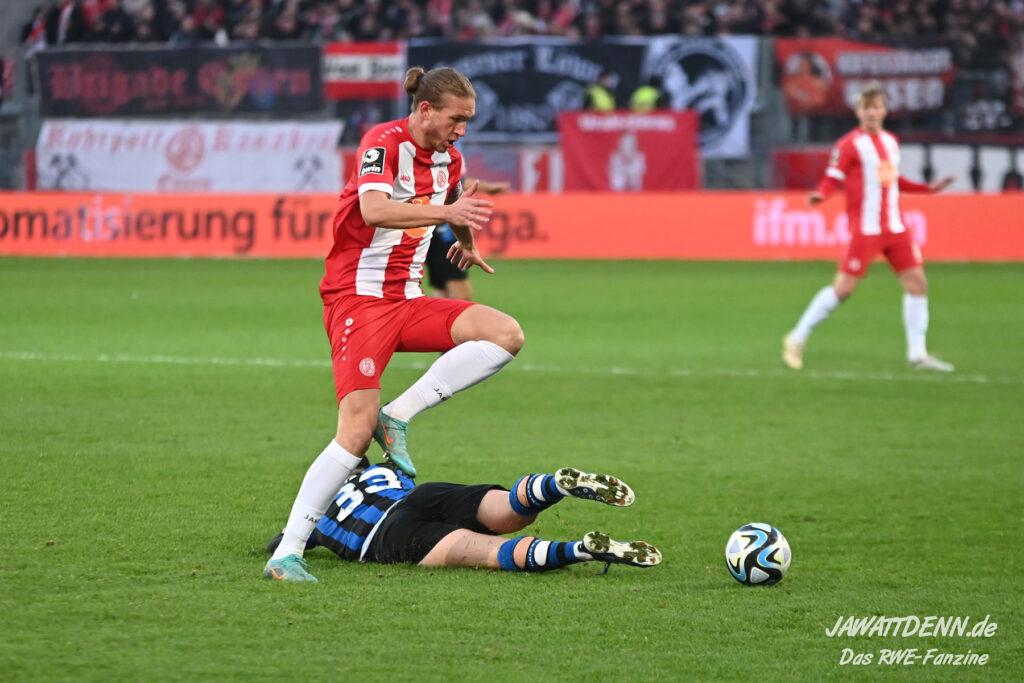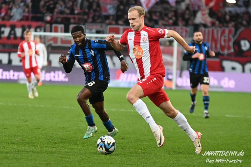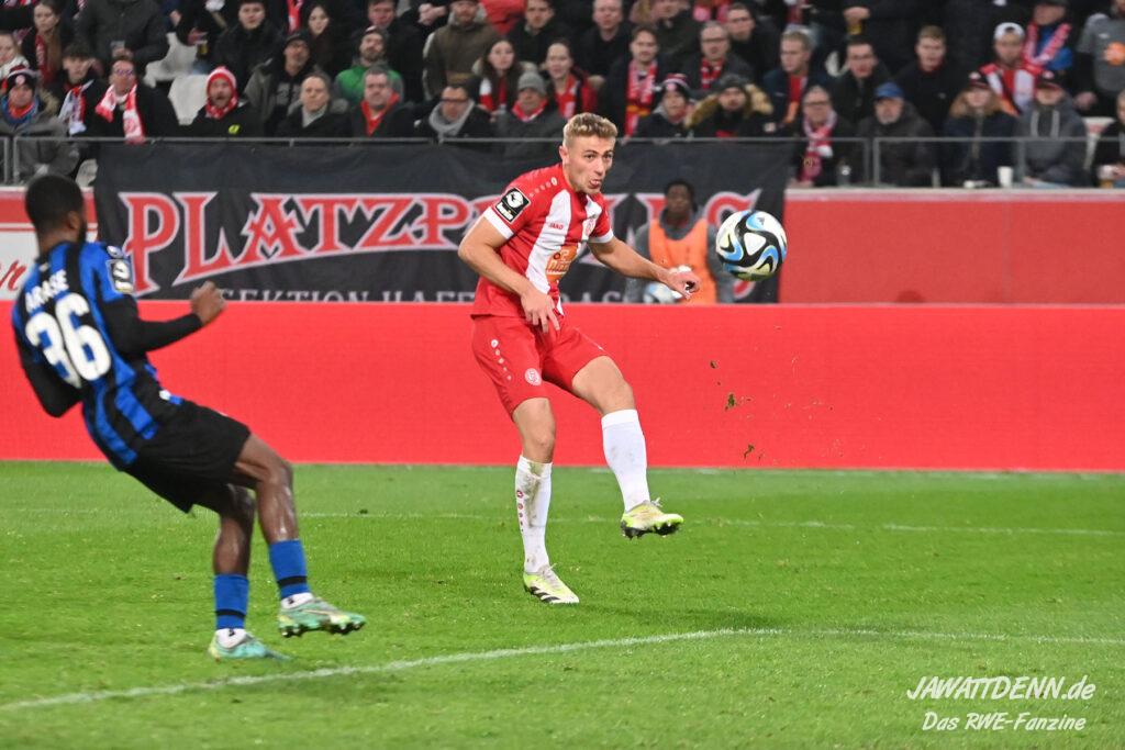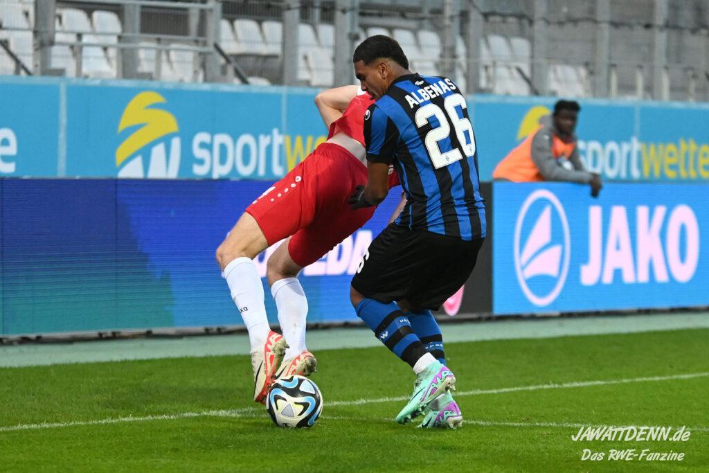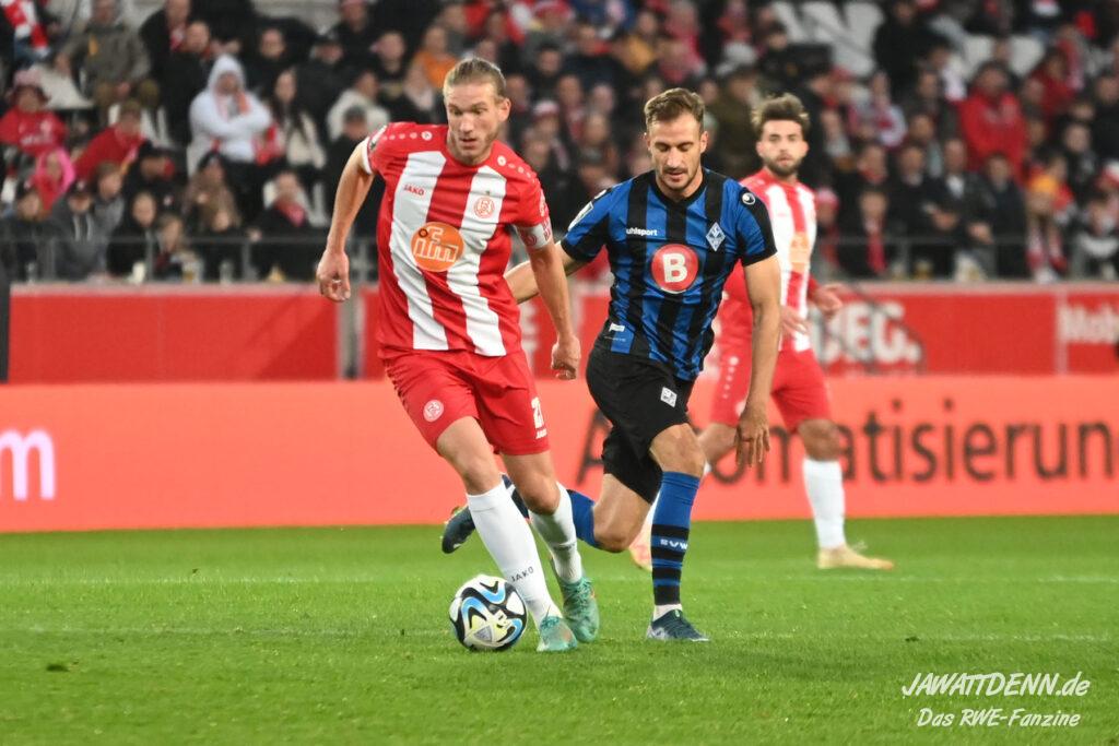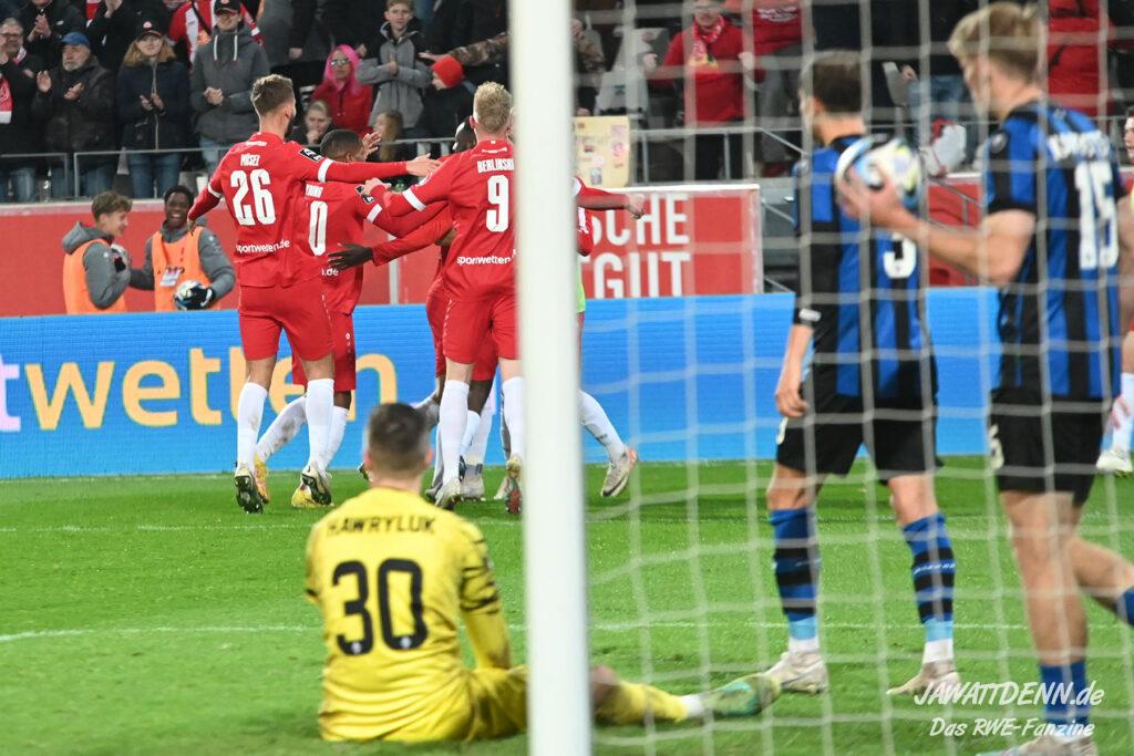 Rot-Weiss nahm die Favoritenrolle an, die ihm in diesem Spiel zugeschoben wurde, und hatte von Beginn an klare Feldvorteile. Während sich dies in der ersten Hälfte jedoch noch nicht in klare Chancen ummünzen ließ, spielte der Gastgeber im zweiten Durchgang sehr viel klarer und suchte immer wieder den Abschluss, was am Ende auch erfolgreich war. Der erste Treffer war sehr sehenswert. Auf der rechten Seite kam José-Enrique Rios Alonso an den Ball nahm Maß und flankte perfekt auf Cedric Harenbrock, der völlig frei im Strafraum stand. Harenbrock ist ohnehin mit einem guten Fuß gesegnet und schloss volley mit dem Innenrist ab. Der Ball ging perfekt ins lange Eck.
