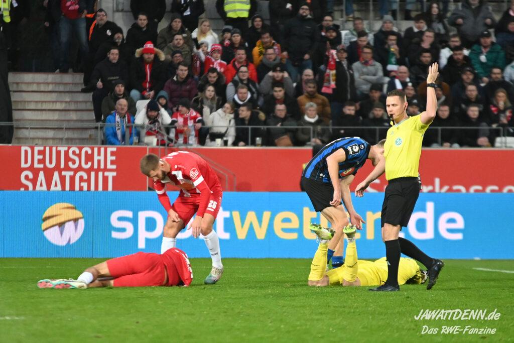 Einmal mehr müssen wir auch über das Thema Elfmeter sprechen. Marvin Obuz wurde klar gefoult, sodass dem Schiedsrichter nichts anderes übrig blieb, als auf den Punkt zu zeigen. Es spricht für Marvin Obuz, dass er sein Momentum nutzen, und der Mannschaft weiterhelfen wollte und es spricht für Vinko Sapina, dass er dem jungen Spieler das Vorrecht am Punkt ohne Diskussion zugestand. Am Ende sorgte RWE auch spielerisch dafür, dass der vergebene Elfmeter keine Auswirkungen hatte. Angesichts der vielen verschossenen Elfmeter der letzten Jahre wünscht man sich in engen Spielen jedoch einen sicheren Schützen, den es bei den elf Essenern sicher gibt.