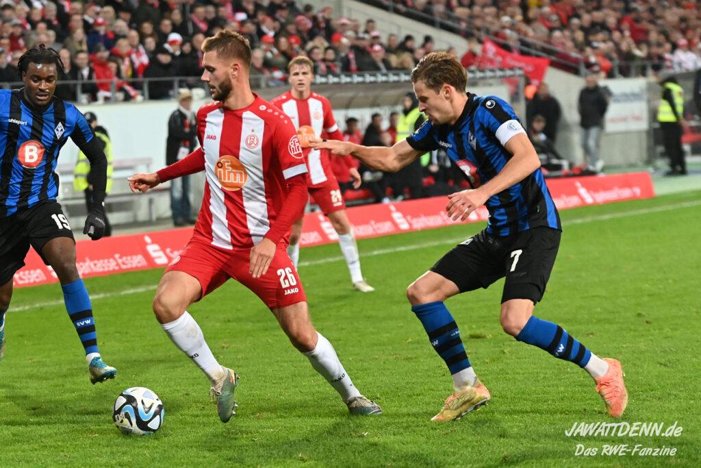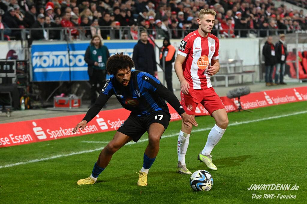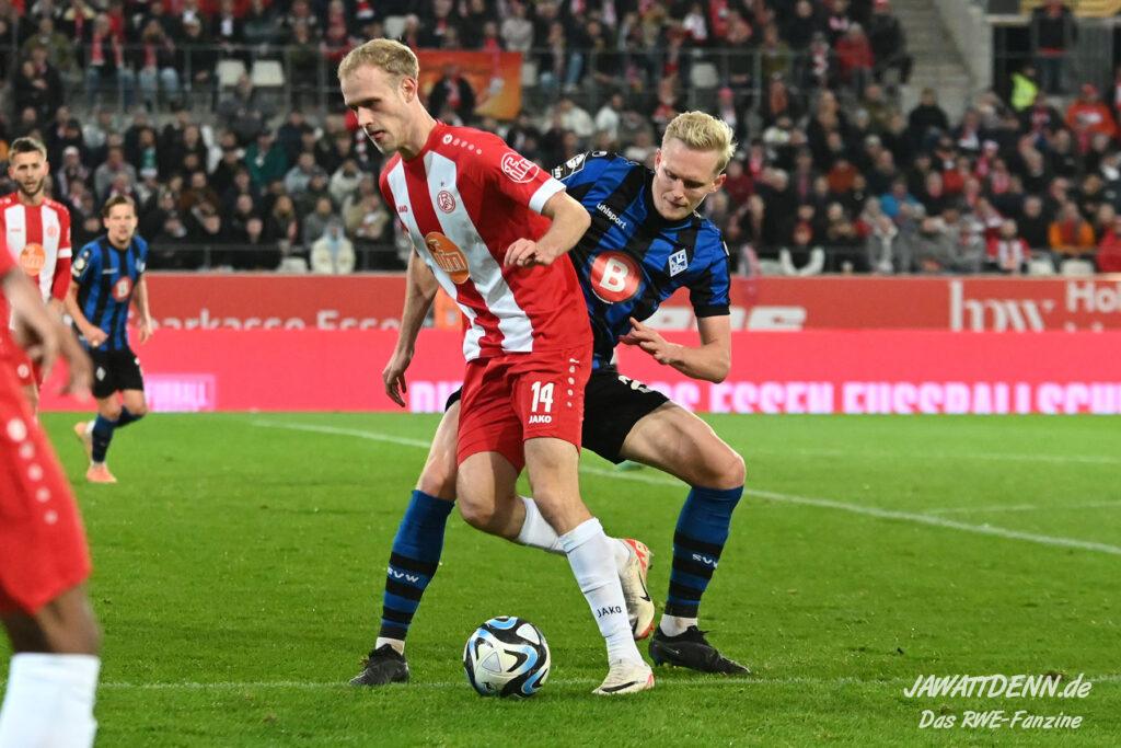 Trotz der spielerischen Überlegenheit und dem deutlichen Plus an Ballbesitz hätte der Waldhof bei konsequenter Ausnutzung seiner hochkarätigen Torchancen einen Punkt von der Hafenstraße entführen können. Die Abläufe bei der spielerischen Befreiung aus Pressingsituationen funktioniert mittlerweile sehr gut, manchmal sind die Aktionen aber sehr risikofreudig. So sah sich Charles Jesaja Hermann allein vor Jakob Golz, nachdem ein risikoreicher Alleingang von Vinko Sapina als letzter Mann misslungen ist. Sein Schuss war jedoch ebenso ungefährlich wie der Moment, als er völlig freistehend weit über den Essener Kasten drosch.
