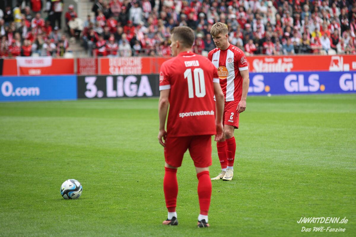Nach diesem erlittenen Doppelschlag versuchte Essen noch einmal alles. Kourouma kam für Nils Kaiser und Moussa Doumbouya für Leo Vonic. RWE stellte auf hinten Dreierkette um und kam mit zwei Schienenspielern über Außen, vorne gab es nun eine Doppelspitze bestehend aus Doumbouya und abwechselnd Berlinski und Young. Wirkung zeigte das nicht mehr. Die Uhr lief herunter.