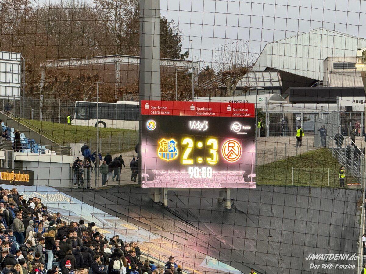 RWE erzielte zwei bildschöne Tore zum 1:1 und 3:2 und schaffte mittels offensiver Power seine erkennbaren defensiven Schwächen zu überlagern. Vor dem 1:1 hebelten Lucas Brumme und Kaito Mizuta mittels eines perfekten Doppelpasses die Saarländer Abwehr aus. Brumme drang bis zur Grundlinie vor und sah Müsel, der die folgende Vorlage verwertete. Müsel, ansonsten sehr unscheinbar, jubelte nicht groß, sondern wies der Mannschaft den Weg zurück zur Mittellinie. Die Botschaft war klar, alles auf Sieg! Diese unbedingte Mentalität war Essen danach auch anzumerken, auch den Nackenschlag des 1:2 verkraftete man und zwang die Gastgeber zu Fehlern, einer davon das Handspiel vor dem Elfer zum 2:2.