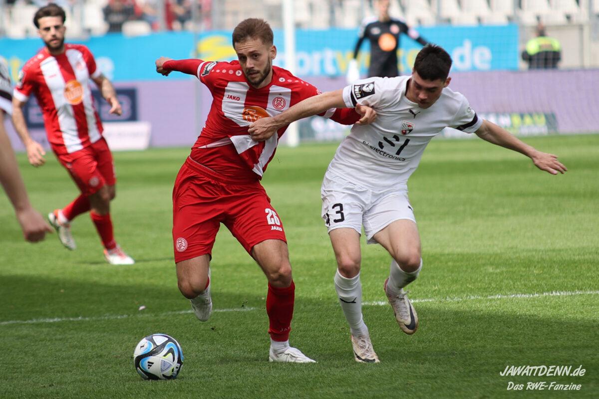 Während man gefühlt die meisten offensiven Außenspieler der Liga hat, ist Rot-Weiss auf der 6 und im Angriff extrem dünn besetzt. Aber fangen wir hinten an. Natürlich ist Jakob Golz im Tor gesetzt. Wer vor ihm auflaufen wird, ist die erste spannende Frage. RWE versuchte es in dieser Spielzeit abwechselnd mit einer Dreier- bzw. Fünferkette und zuletzt wieder mit Viererkette. Die funktionierte gegen Wehen Wiesbaden nicht wirklich. Zwar bekam RWE von den Gästen kaum Druck, aber in schnellen Umschaltsituationen von diesen mühelos drei Treffer eingeschenkt. Die Abstimmung zwischen Kapitän Michael Schultz und Rios Alonso stimmte nicht.