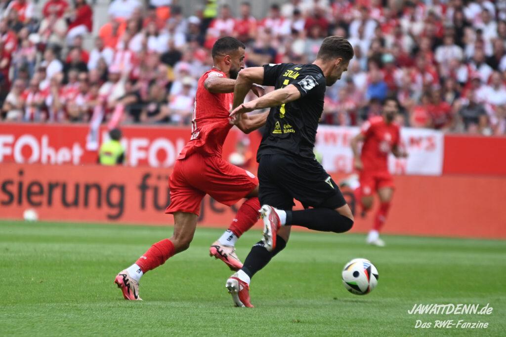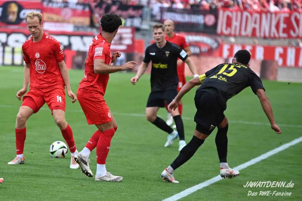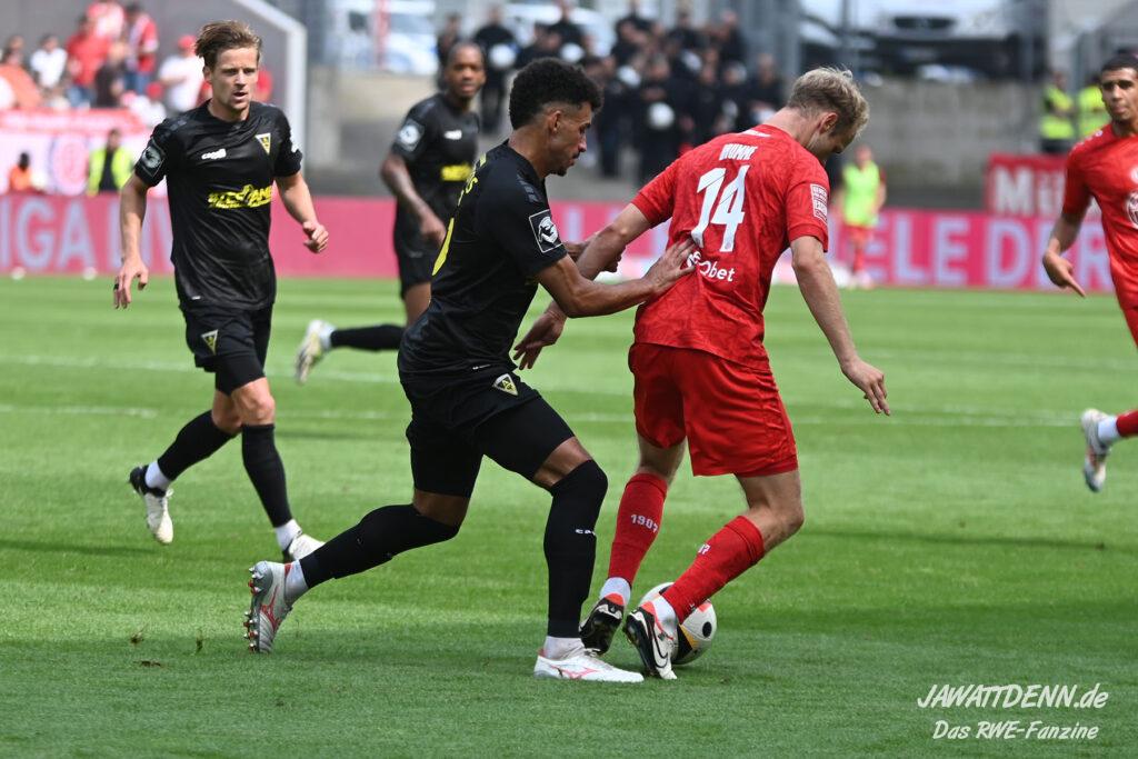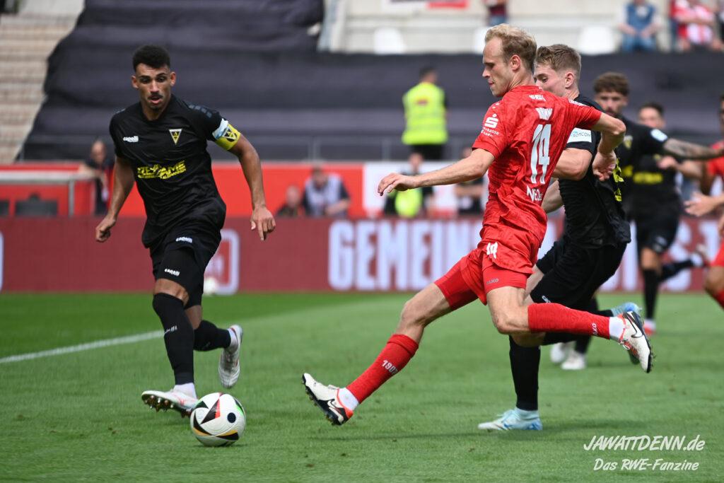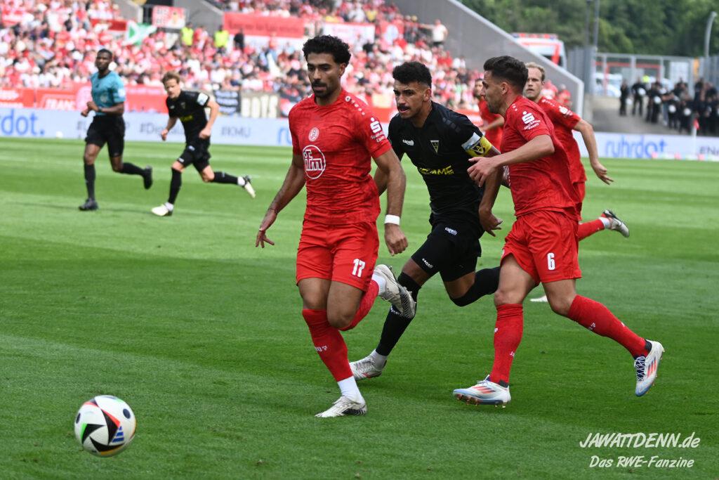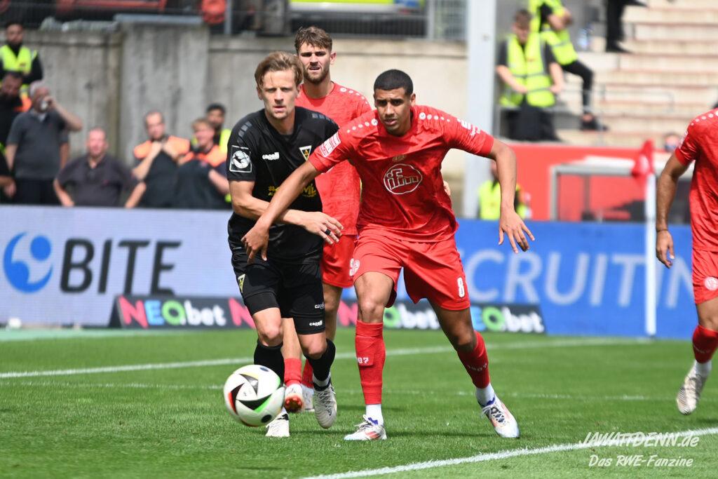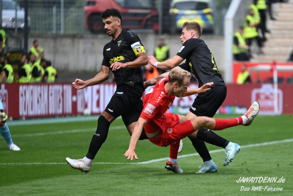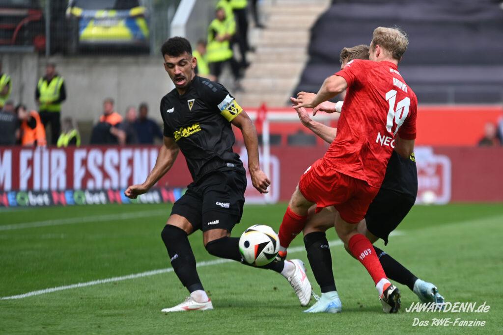 Das Spiel, das RWE auszeichnet, viele schnelle Kontakte, den Ball in die Halbräume spielen und dann Richtung gegnerische Box zu treiben, war über die gesamte Distanz kaum zu sehen. So verwunderte es auch nicht, dass Ahmet Arslan scheinbar kaum mitspielte, in seine Räume gelangte der Ball häufig erst gar nicht.