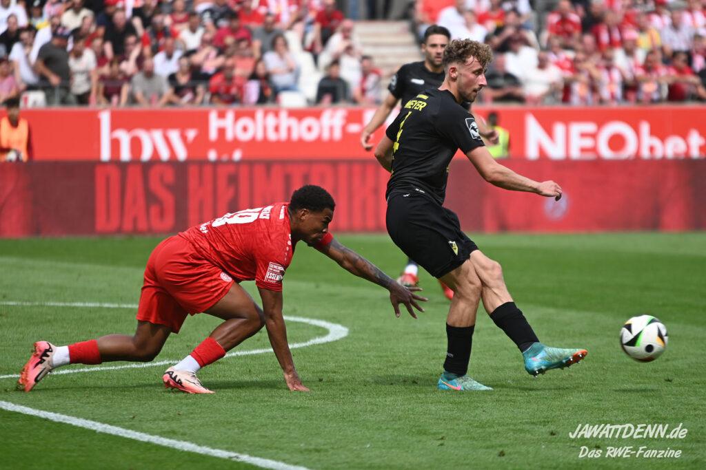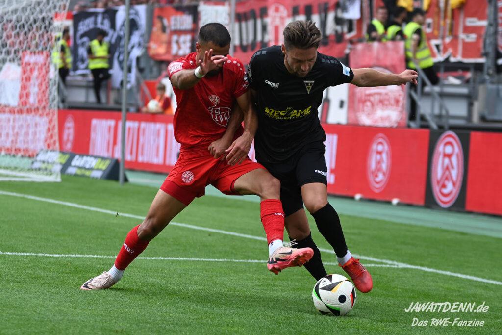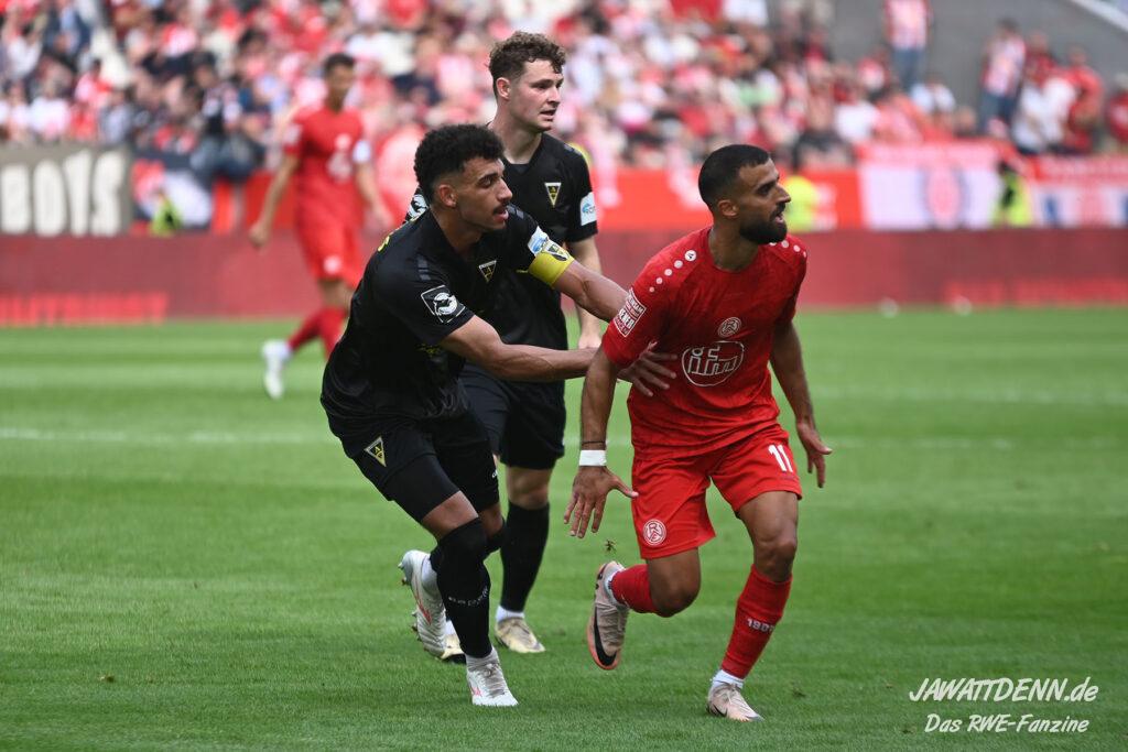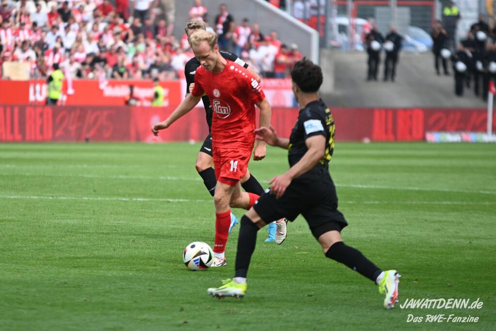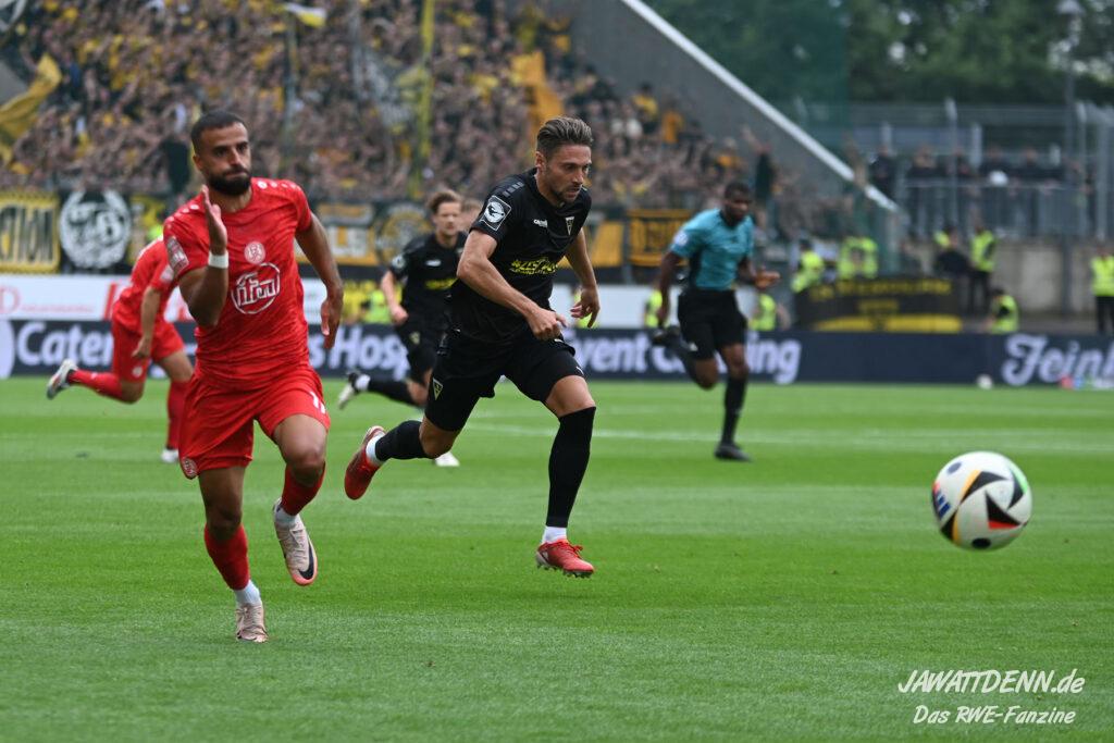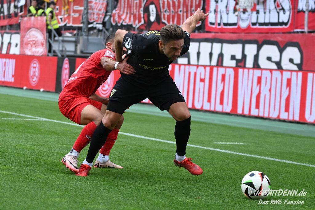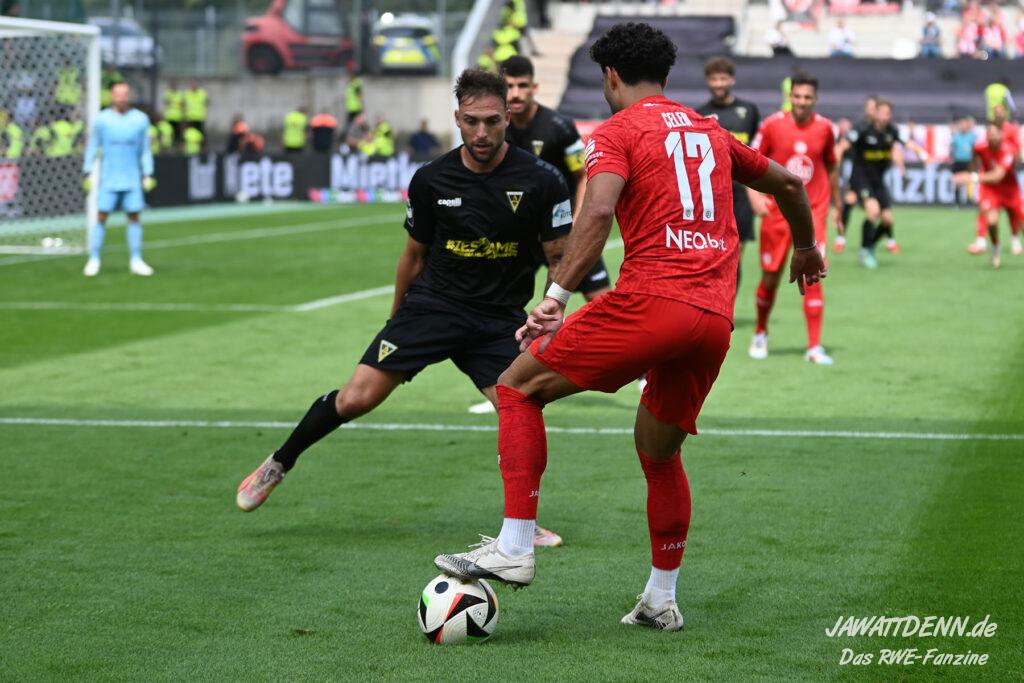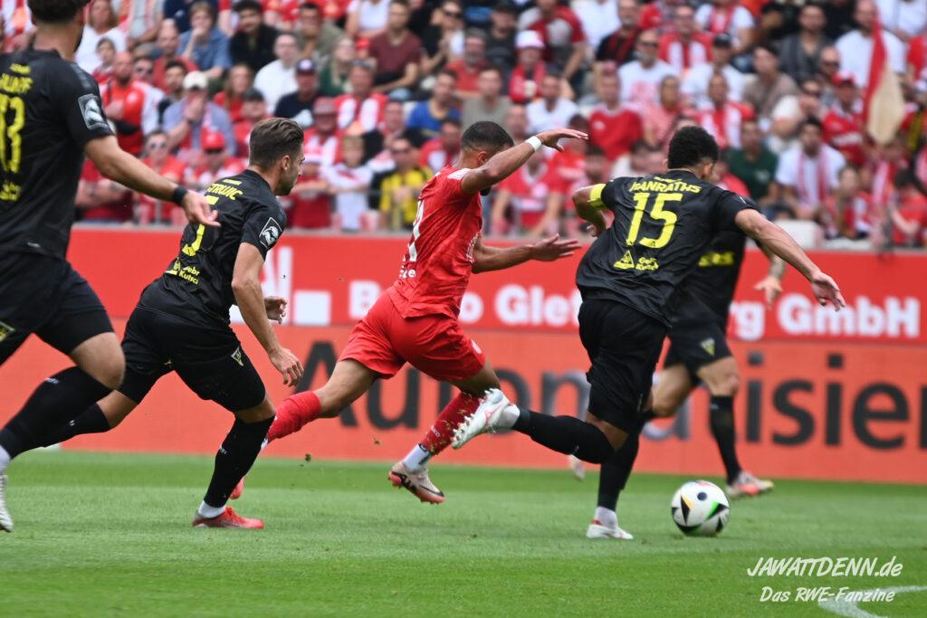 Das Spiel, das RWE auszeichnet, viele schnelle Kontakte, den Ball in die Halbräume spielen und dann Richtung gegnerische Box zu treiben, war über die gesamte Distanz kaum zu sehen. So verwunderte es auch nicht, dass Ahmet Arslan scheinbar kaum mitspielte, in seine Räume gelangte der Ball häufig erst gar nicht.