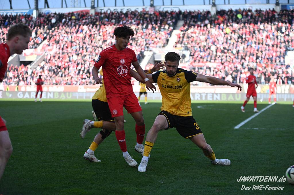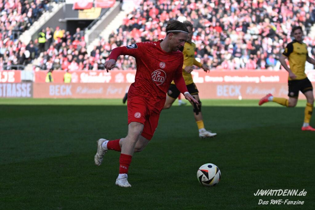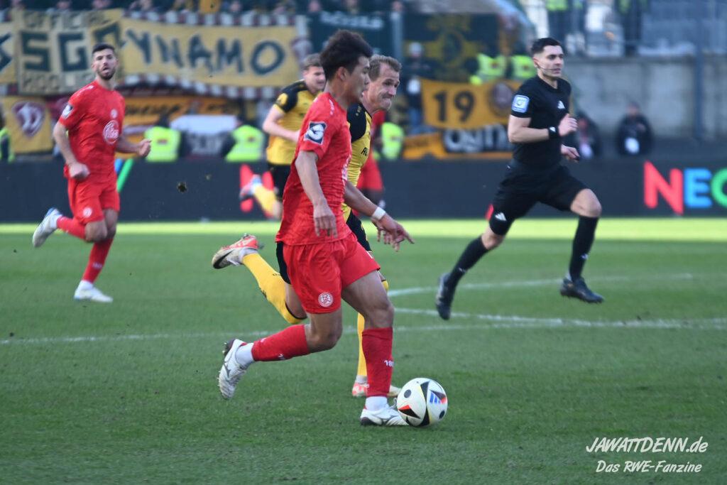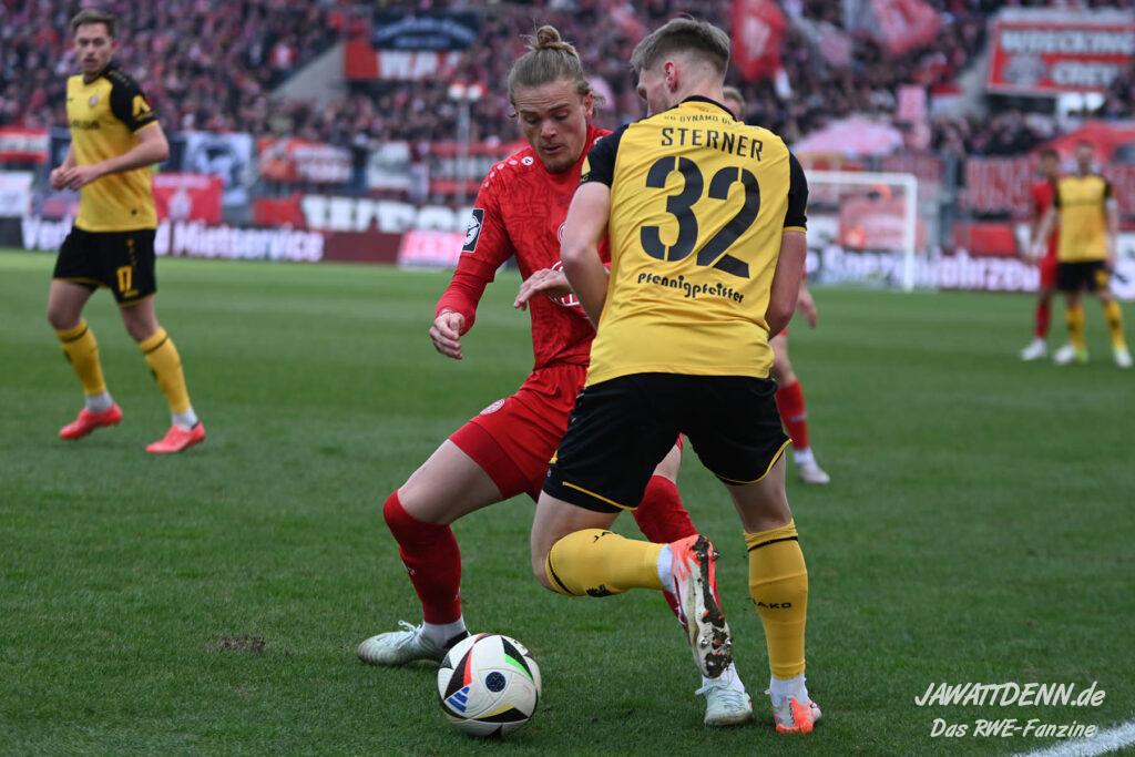 Ein Paradebeispiel dafür gab es noch in der Nachspielzeit, als Owusu und Müsel sich nicht einig zeigten über Pass- und Laufweg. RWE bekam so nicht die Großchance auf den Sieg, sondern musste einen gefährlichen Konter schlucken, der Dresden noch einmal eine gute Freistoßposition bescheren sollte. Aber auch den Gästen fehlte die Konsequenz. In der ersten Hälfte sah man Uwe Koschinat am Spielfeldrand toben. Etwa 20 Minuten lang gelang RWE wenig Entlastung und der Trainer schlug sich symbolisch auf die Brust, die er bei seiner Mannschaft raus sehen wollte. Am Ende einer englischen Woche war der vermehrte Druck der Dynamos zum Spielende hin, der sich aber vor allem auf Eckstöße erstreckte, auch angesichts der Qualität des Gegners wohl eher folgerichtig.