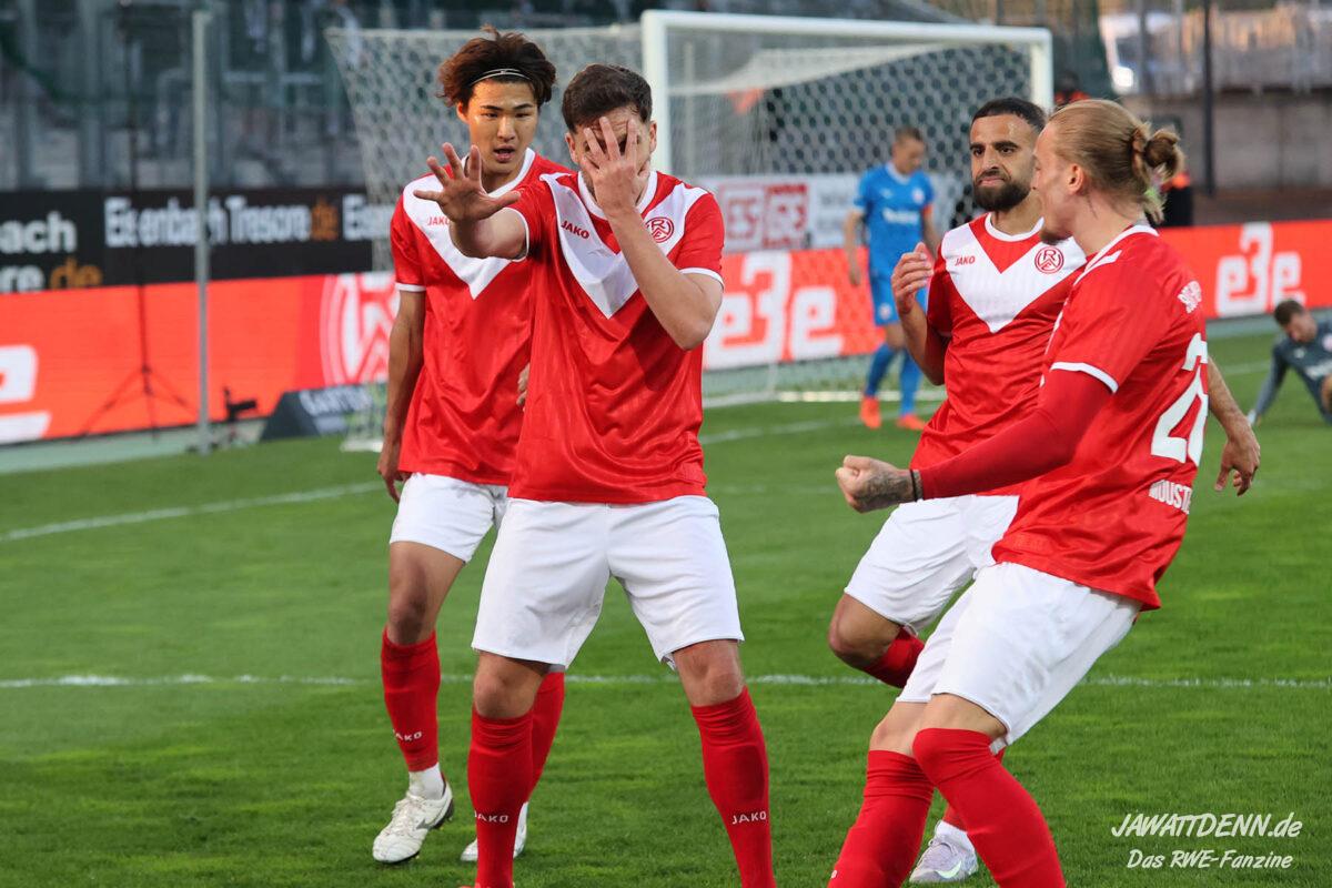 Nach einer schwierigen Anfangsphase fällt das 1:1 durch Arslan quasi aus dem Nichts. Sein Treffer war aber vor allem dadurch sehenswert, weil der Spielmacher hier unbedingten Willen zeigte und den Rostocker Rossipal vor dem Treffer toll aussteigen ließ. Mit der roten Karte für Rossipal wenig später übernahm RWE immer mehr das Kommando. Uwe Koschinat wollte, dass sein Team nicht hektisch agierte und bis zum Schluss die Ruhe bewahren sollte.