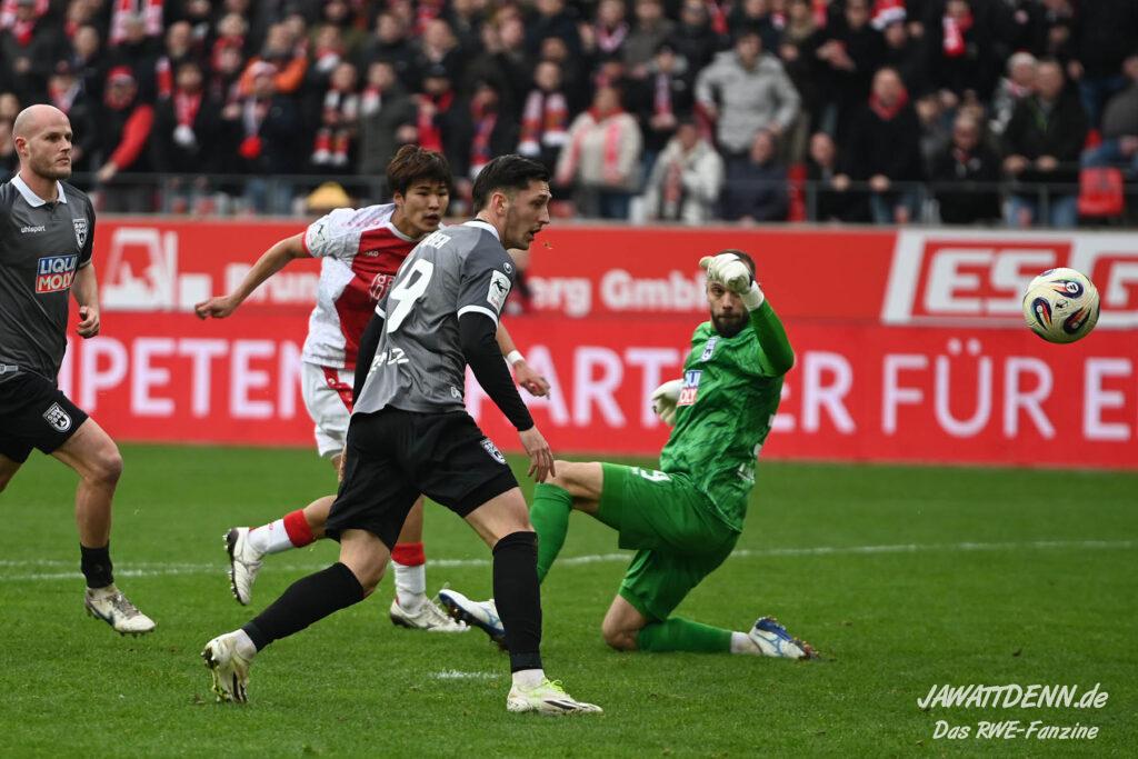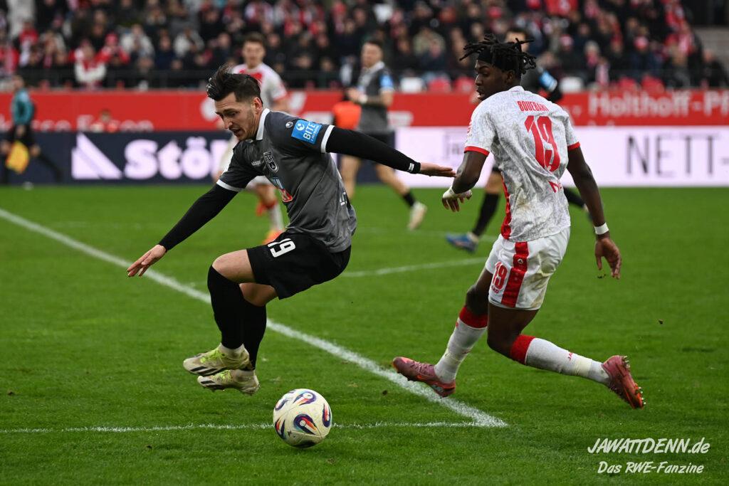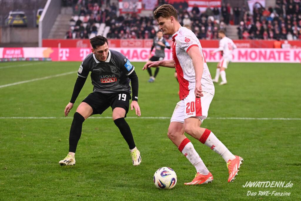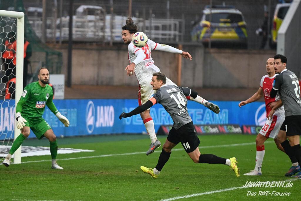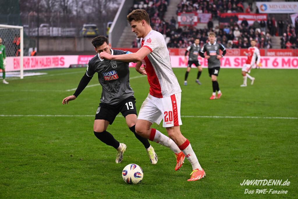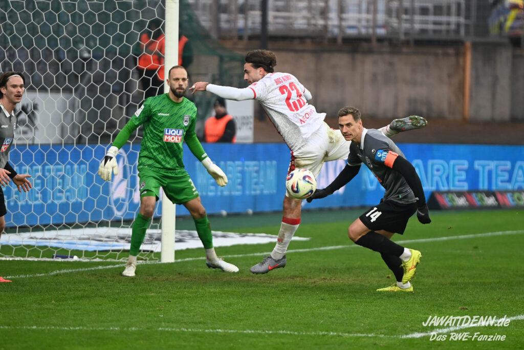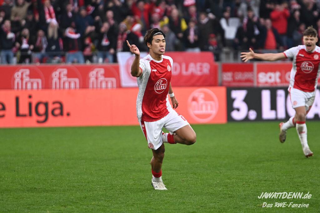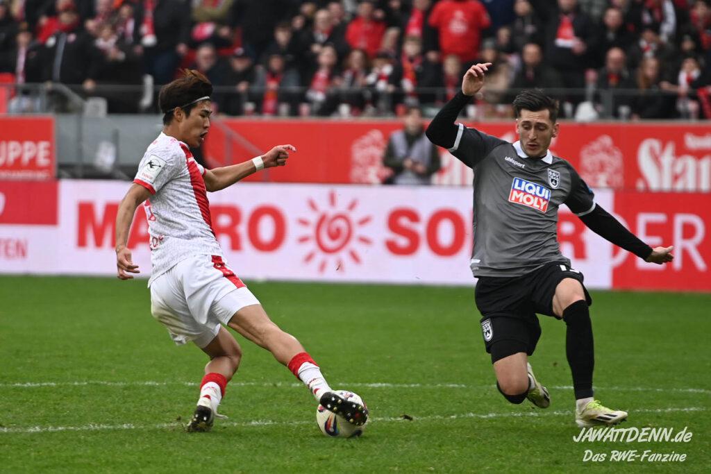 Aber zum Glück hat RWE lange Einwürfe von Tom Moustier und einen Kaito Mizuta in Top-Form, denn nur acht Minuten später landete eine abgewehrte Einwurfflanke an der Strafraumgrenze und wurde vom Japaner mit einer sehenswerten Direktabnahme zum 3:2-Siegtreffer versenkt. Dass noch gezittert werden musste lag auch daran, dass Ramien Safi in aussichtsreicher Start-Position an der Mittellinie fälschlicherweise ein Handspiel unterstellt wurde und er wenig später in noch aussichtsreicherer Situation den Ball mal wieder nicht im Kasten unterbrachte.
