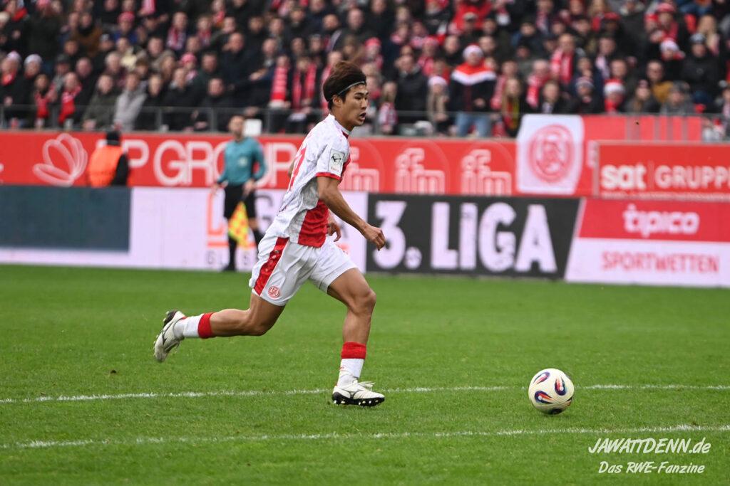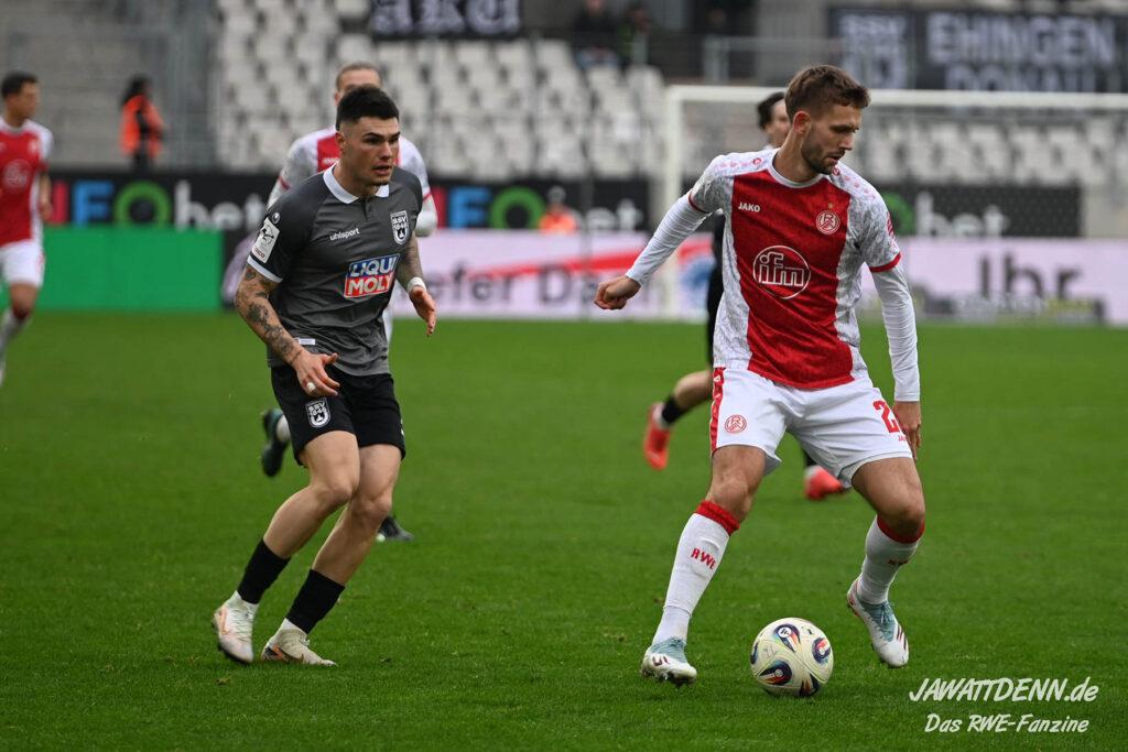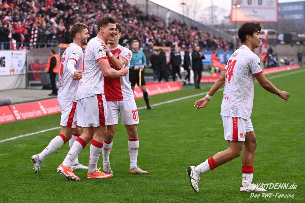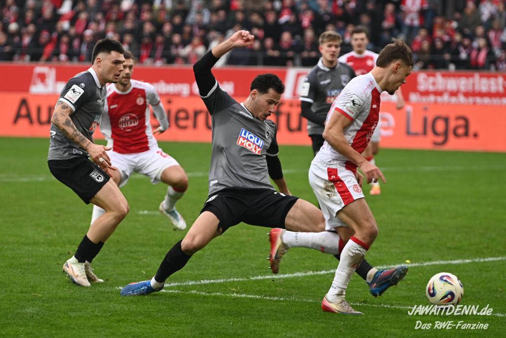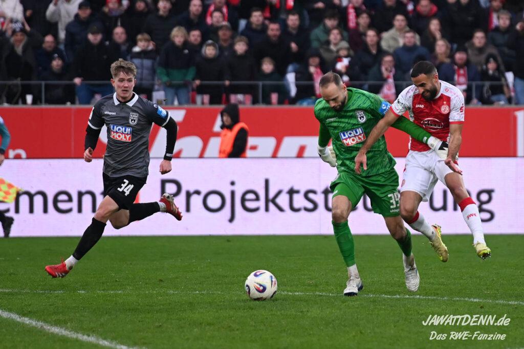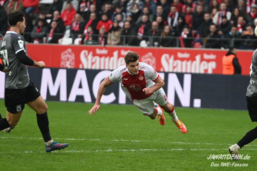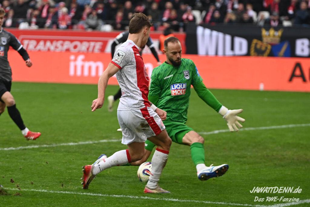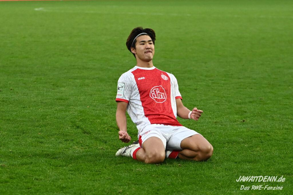 Aber zum Glück hat RWE lange Einwürfe von Tom Moustier und einen Kaito Mizuta in Top-Form, denn nur acht Minuten später landete eine abgewehrte Einwurfflanke an der Strafraumgrenze und wurde vom Japaner mit einer sehenswerten Direktabnahme zum 3:2-Siegtreffer versenkt. Dass noch gezittert werden musste lag auch daran, dass Ramien Safi in aussichtsreicher Start-Position an der Mittellinie fälschlicherweise ein Handspiel unterstellt wurde und er wenig später in noch aussichtsreicherer Situation den Ball mal wieder nicht im Kasten unterbrachte.
