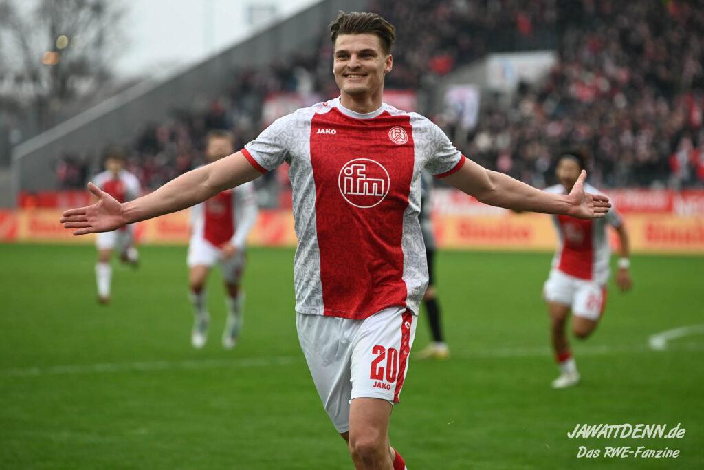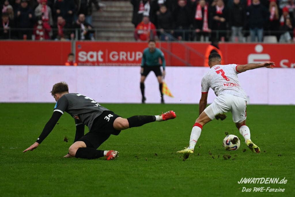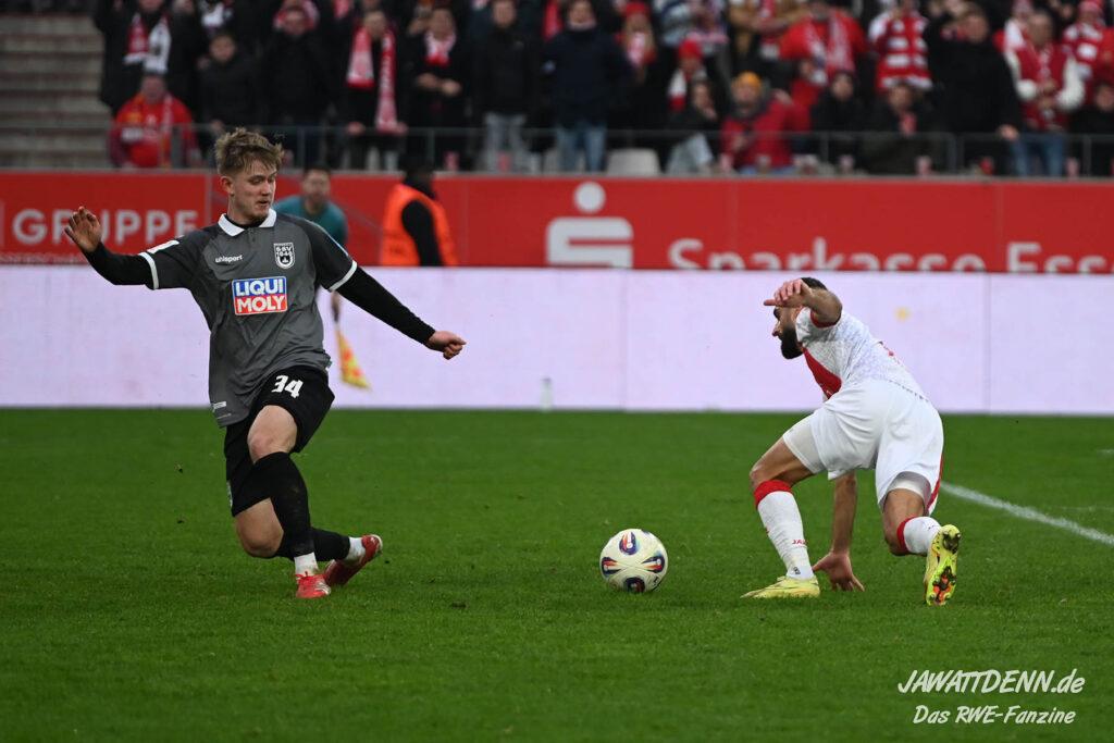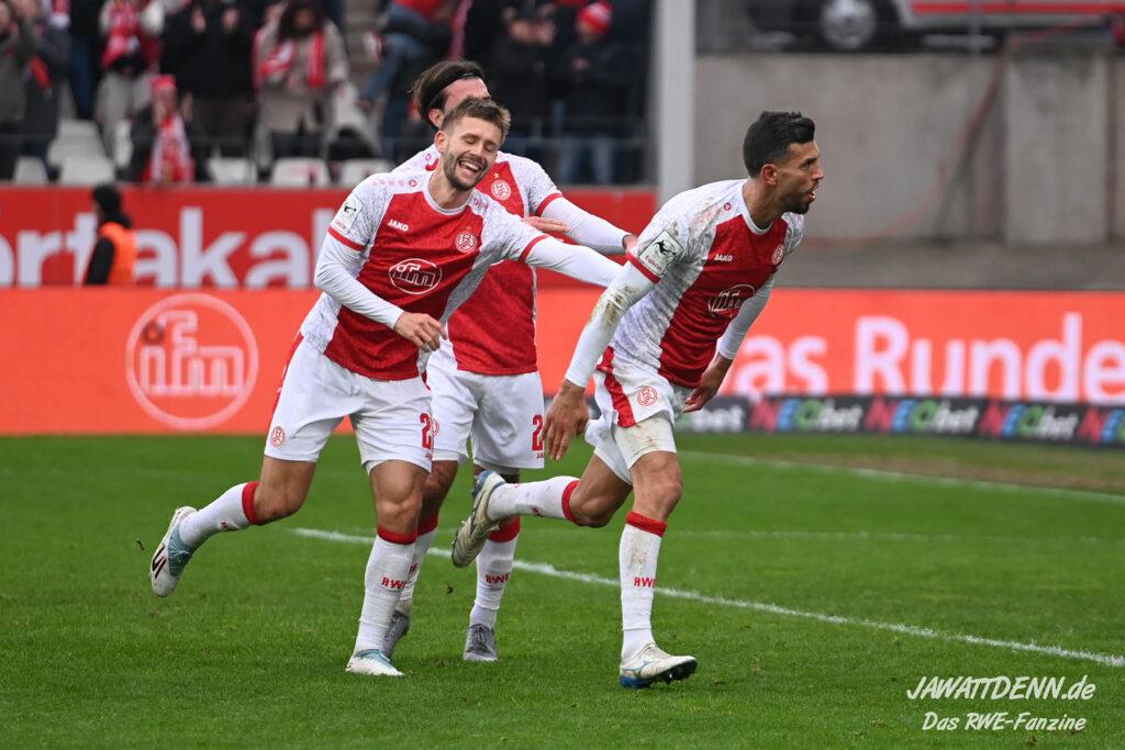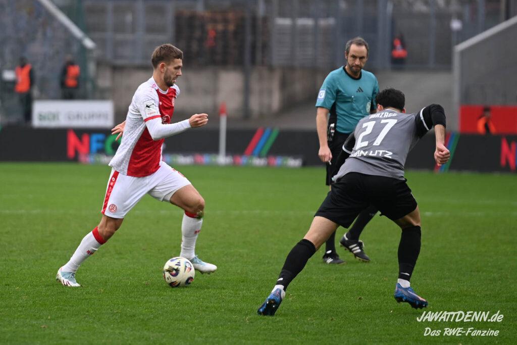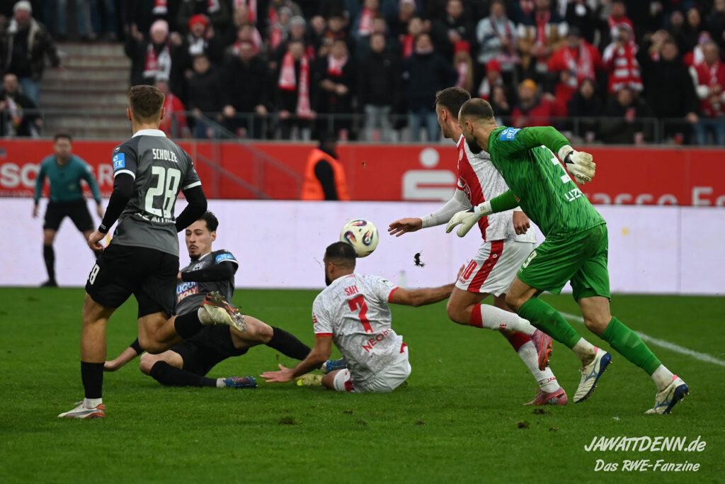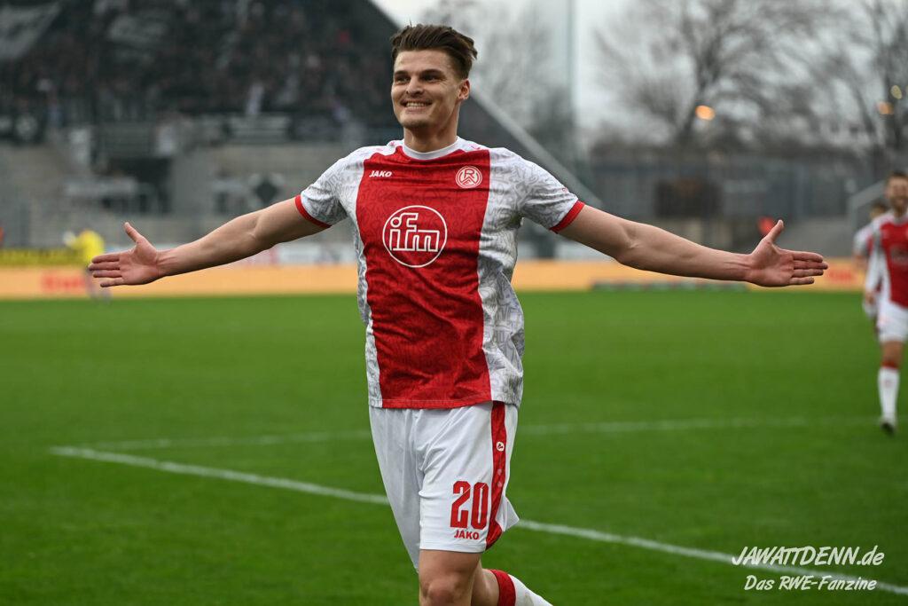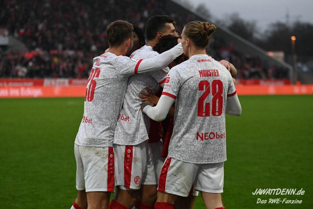 Aber zum Glück hat RWE lange Einwürfe von Tom Moustier und einen Kaito Mizuta in Top-Form, denn nur acht Minuten später landete eine abgewehrte Einwurfflanke an der Strafraumgrenze und wurde vom Japaner mit einer sehenswerten Direktabnahme zum 3:2-Siegtreffer versenkt. Dass noch gezittert werden musste lag auch daran, dass Ramien Safi in aussichtsreicher Start-Position an der Mittellinie fälschlicherweise ein Handspiel unterstellt wurde und er wenig später in noch aussichtsreicherer Situation den Ball mal wieder nicht im Kasten unterbrachte.