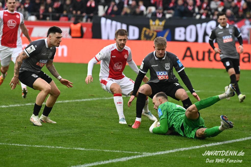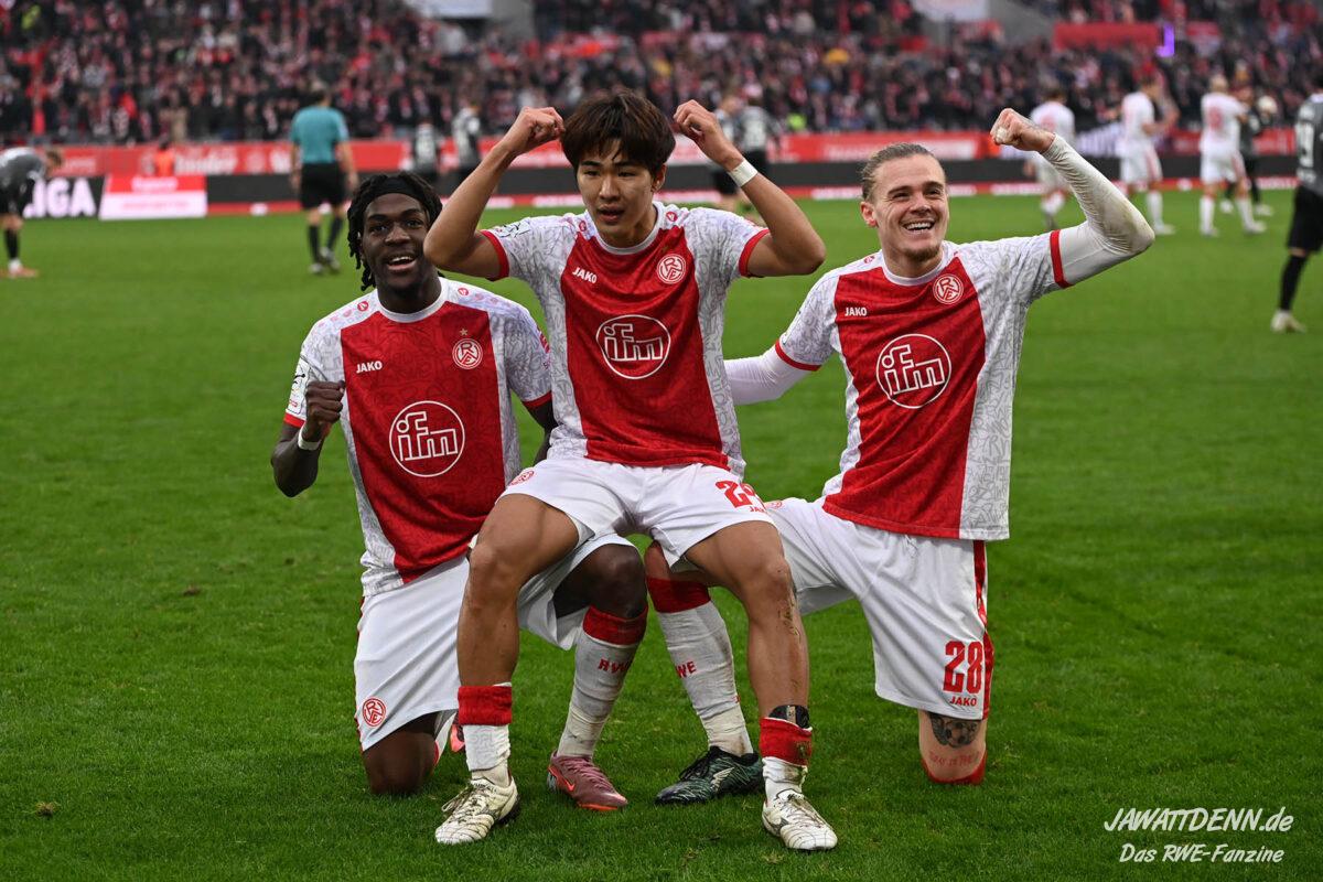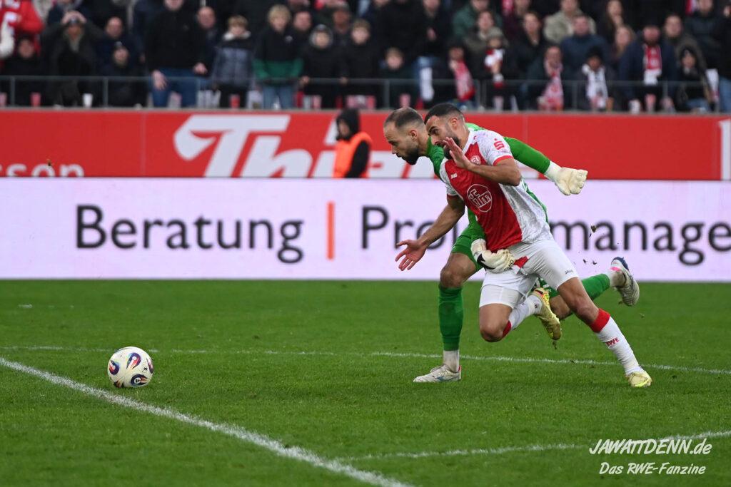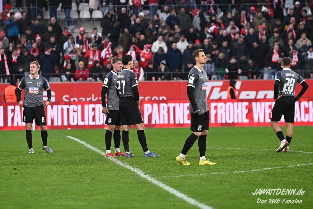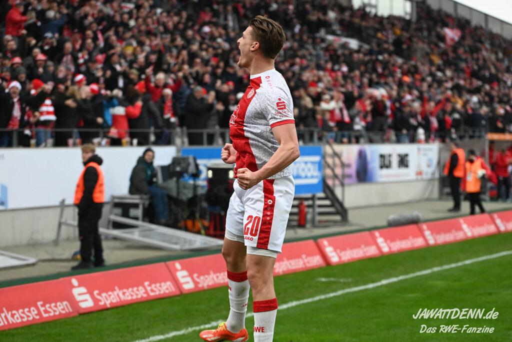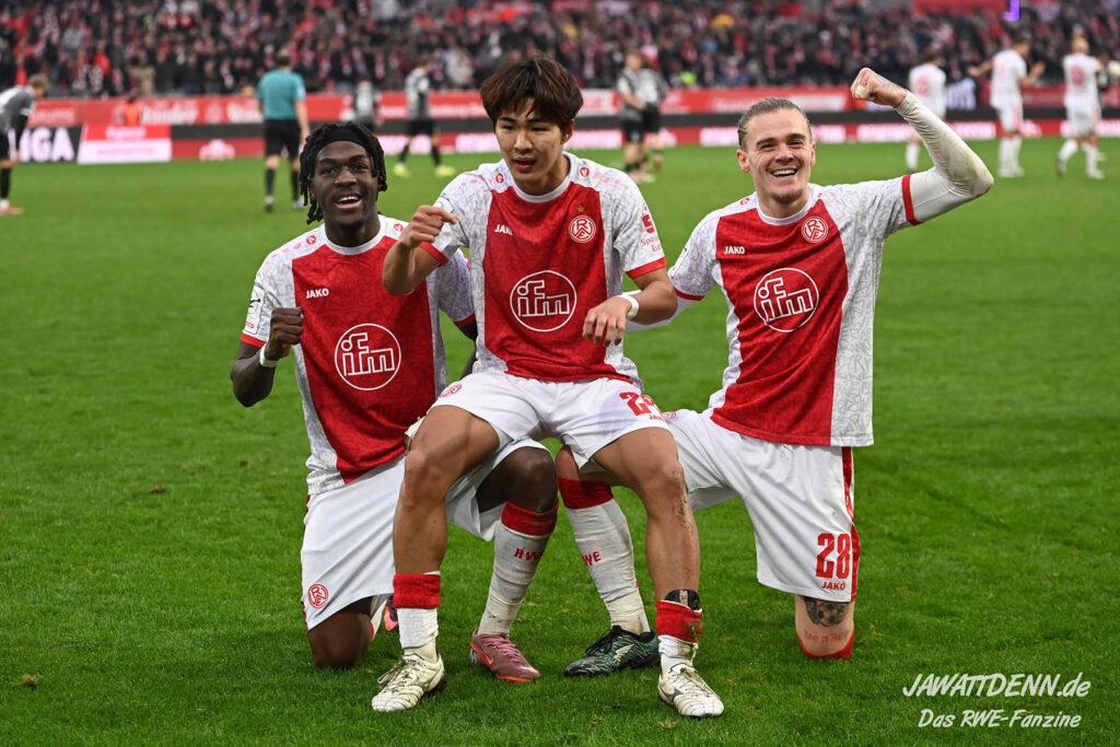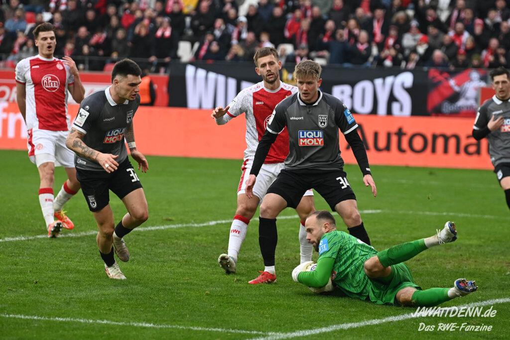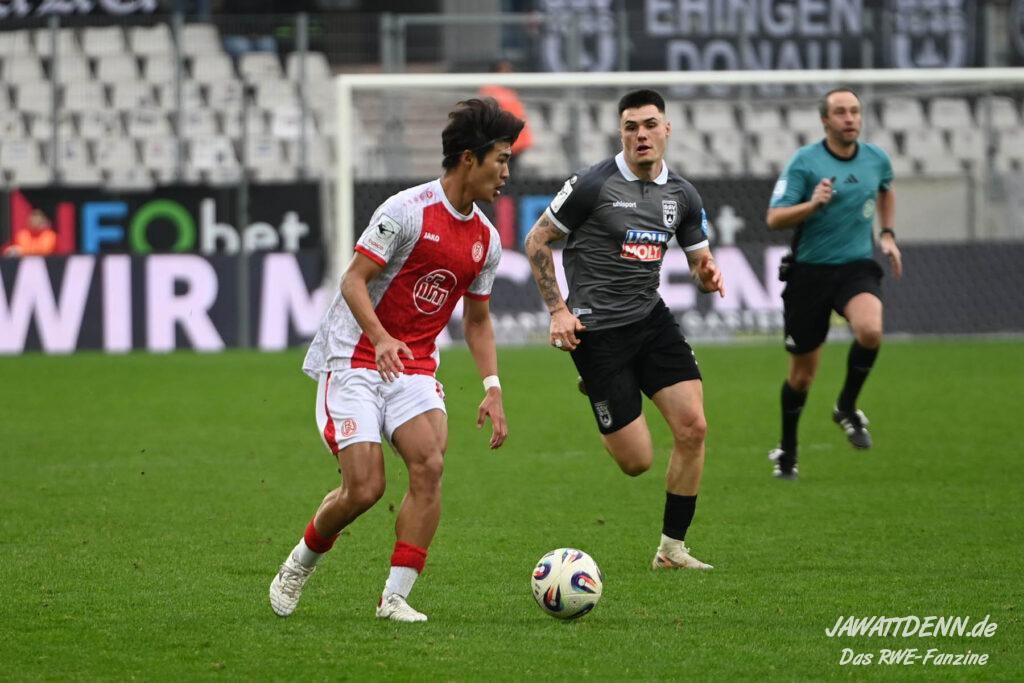 Aber zum Glück hat RWE lange Einwürfe von Tom Moustier und einen Kaito Mizuta in Top-Form, denn nur acht Minuten später landete eine abgewehrte Einwurfflanke an der Strafraumgrenze und wurde vom Japaner mit einer sehenswerten Direktabnahme zum 3:2-Siegtreffer versenkt. Dass noch gezittert werden musste lag auch daran, dass Ramien Safi in aussichtsreicher Start-Position an der Mittellinie fälschlicherweise ein Handspiel unterstellt wurde und er wenig später in noch aussichtsreicherer Situation den Ball mal wieder nicht im Kasten unterbrachte.