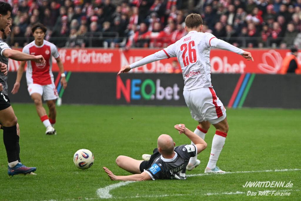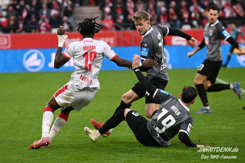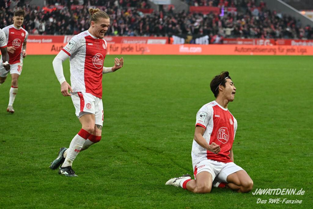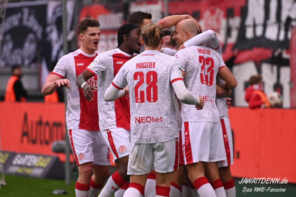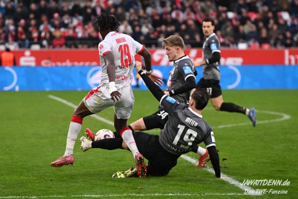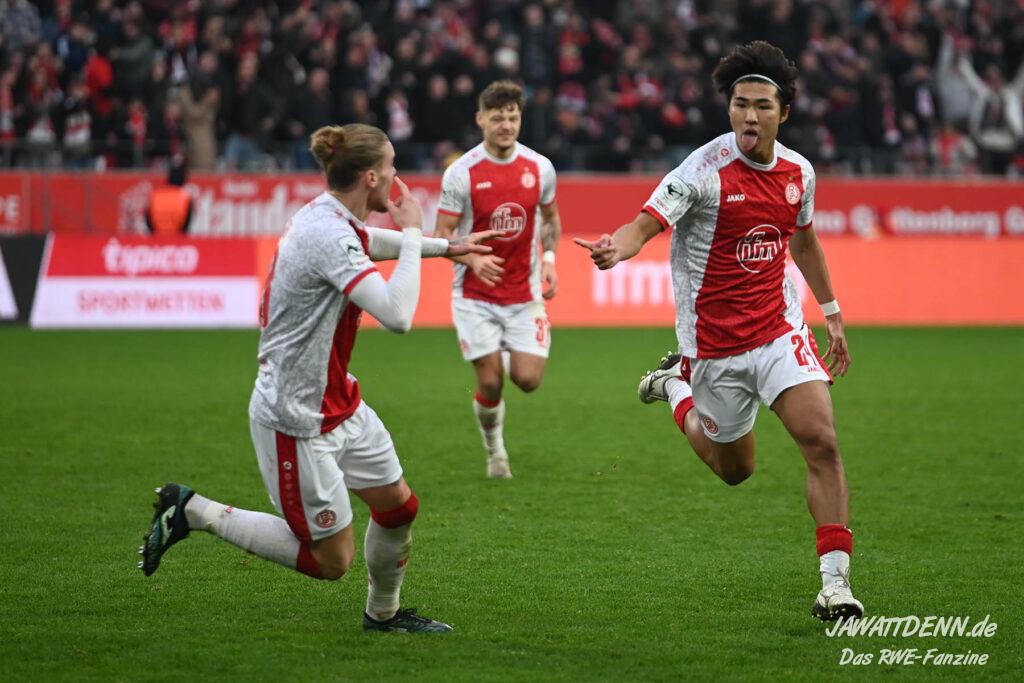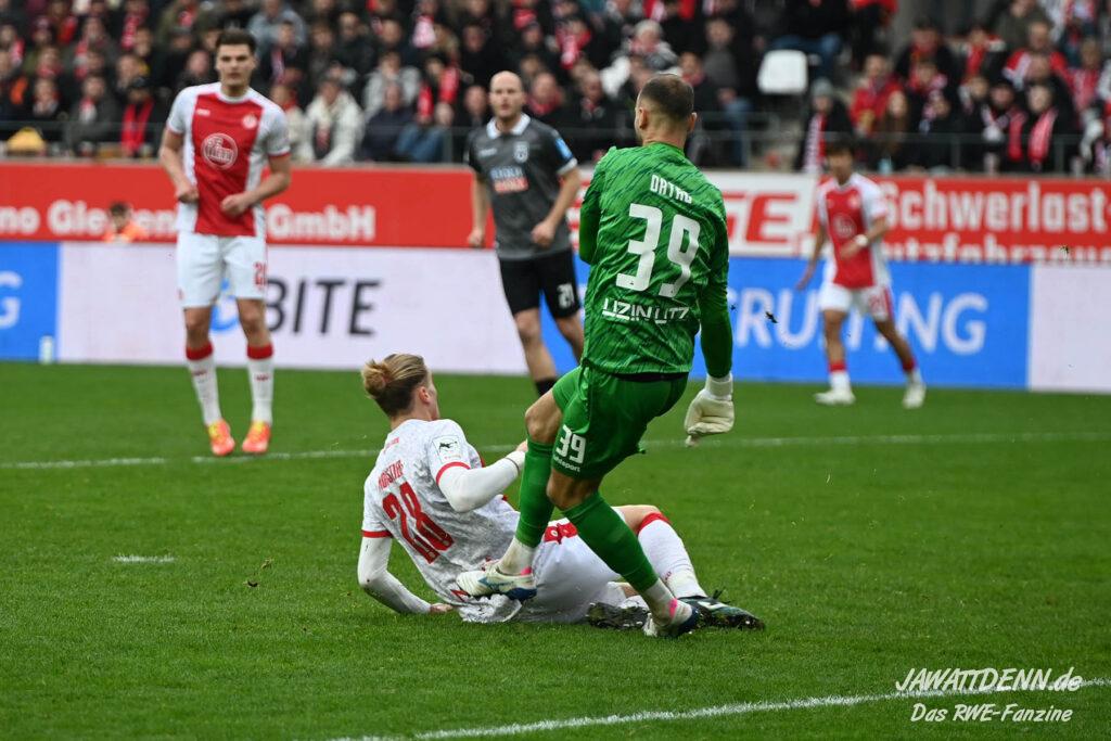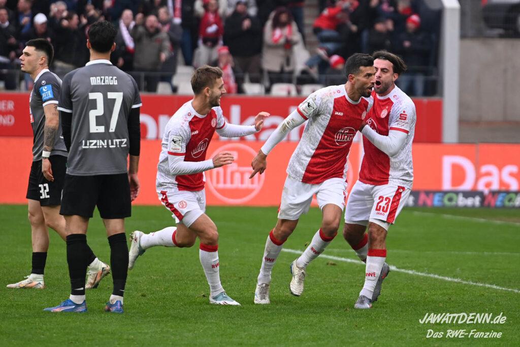 Aber zum Glück hat RWE lange Einwürfe von Tom Moustier und einen Kaito Mizuta in Top-Form, denn nur acht Minuten später landete eine abgewehrte Einwurfflanke an der Strafraumgrenze und wurde vom Japaner mit einer sehenswerten Direktabnahme zum 3:2-Siegtreffer versenkt. Dass noch gezittert werden musste lag auch daran, dass Ramien Safi in aussichtsreicher Start-Position an der Mittellinie fälschlicherweise ein Handspiel unterstellt wurde und er wenig später in noch aussichtsreicherer Situation den Ball mal wieder nicht im Kasten unterbrachte.
