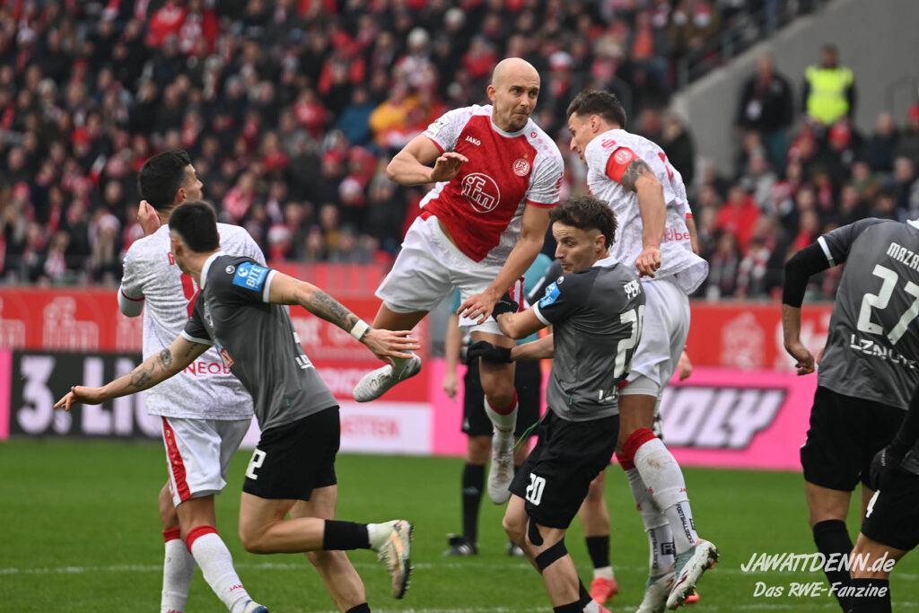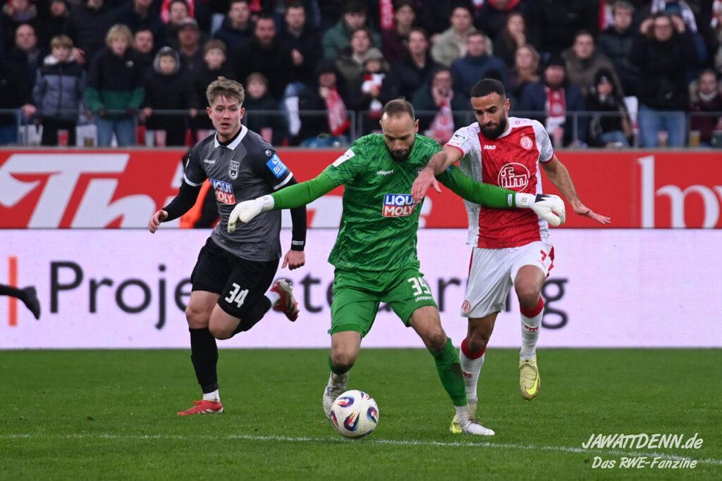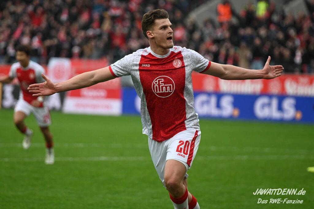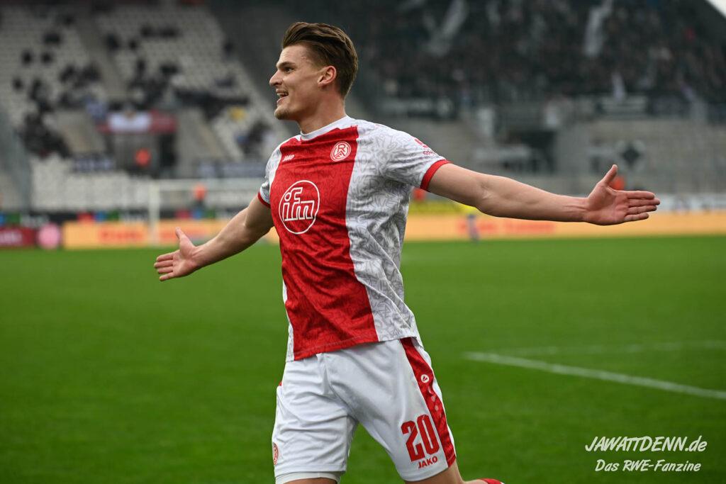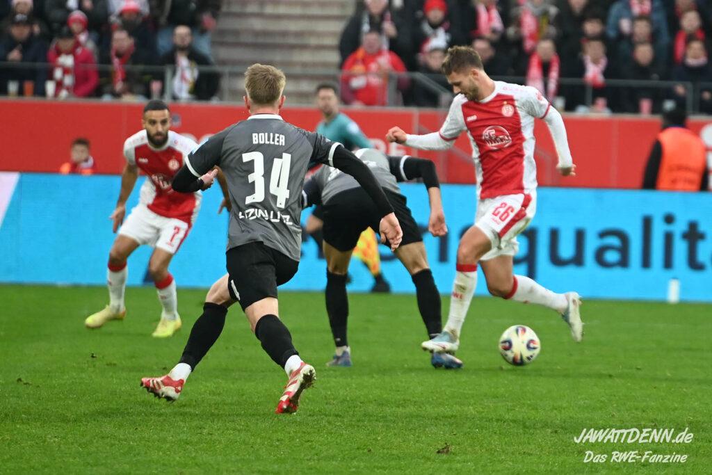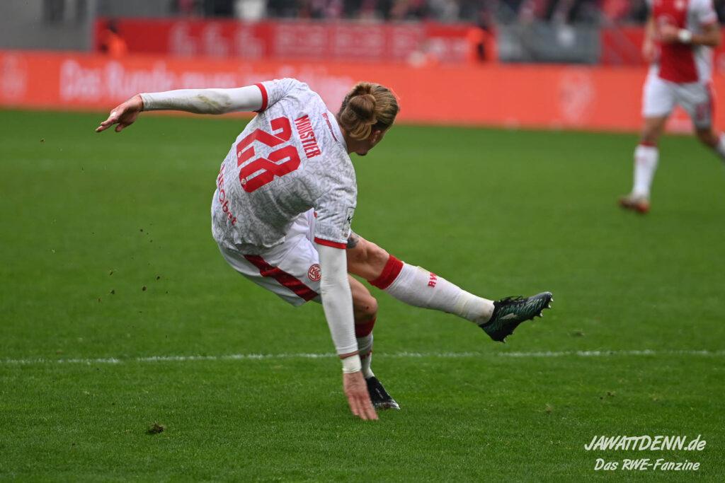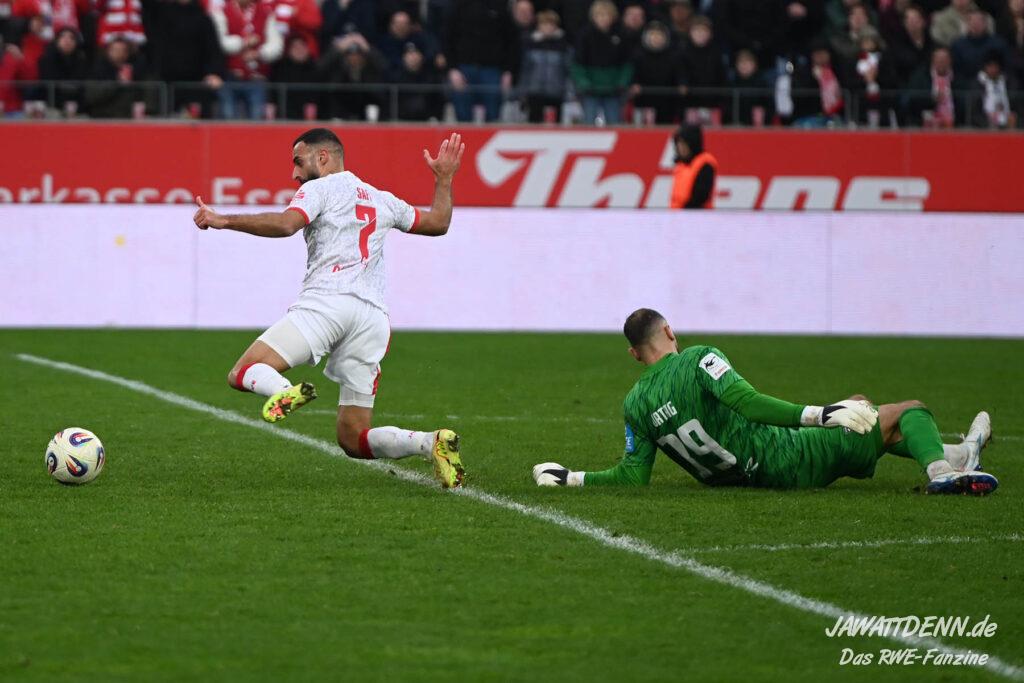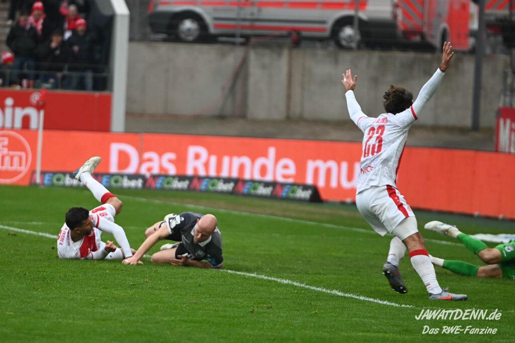 Aber zum Glück hat RWE lange Einwürfe von Tom Moustier und einen Kaito Mizuta in Top-Form, denn nur acht Minuten später landete eine abgewehrte Einwurfflanke an der Strafraumgrenze und wurde vom Japaner mit einer sehenswerten Direktabnahme zum 3:2-Siegtreffer versenkt. Dass noch gezittert werden musste lag auch daran, dass Ramien Safi in aussichtsreicher Start-Position an der Mittellinie fälschlicherweise ein Handspiel unterstellt wurde und er wenig später in noch aussichtsreicherer Situation den Ball mal wieder nicht im Kasten unterbrachte.