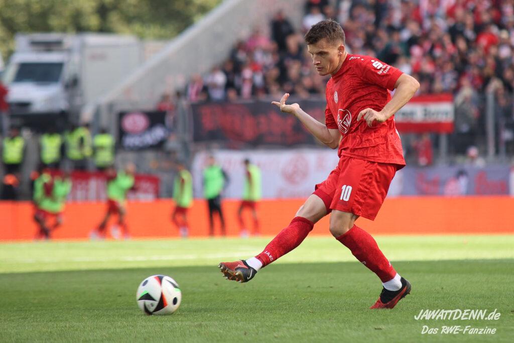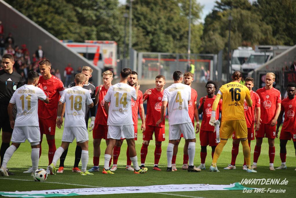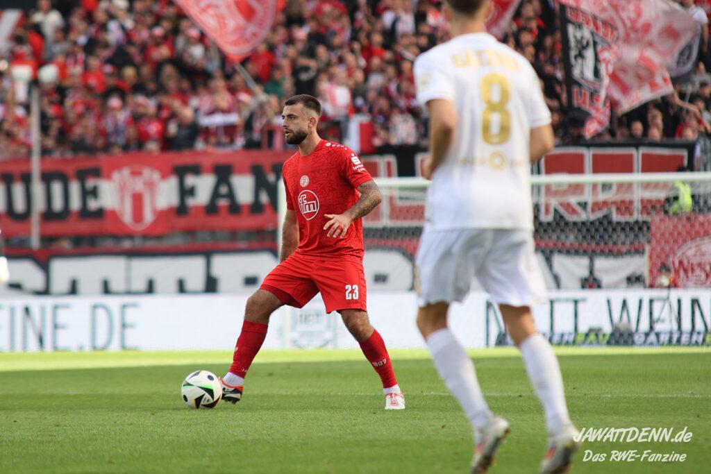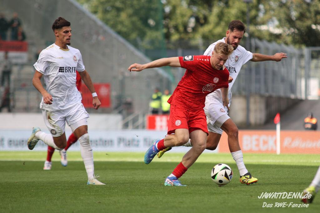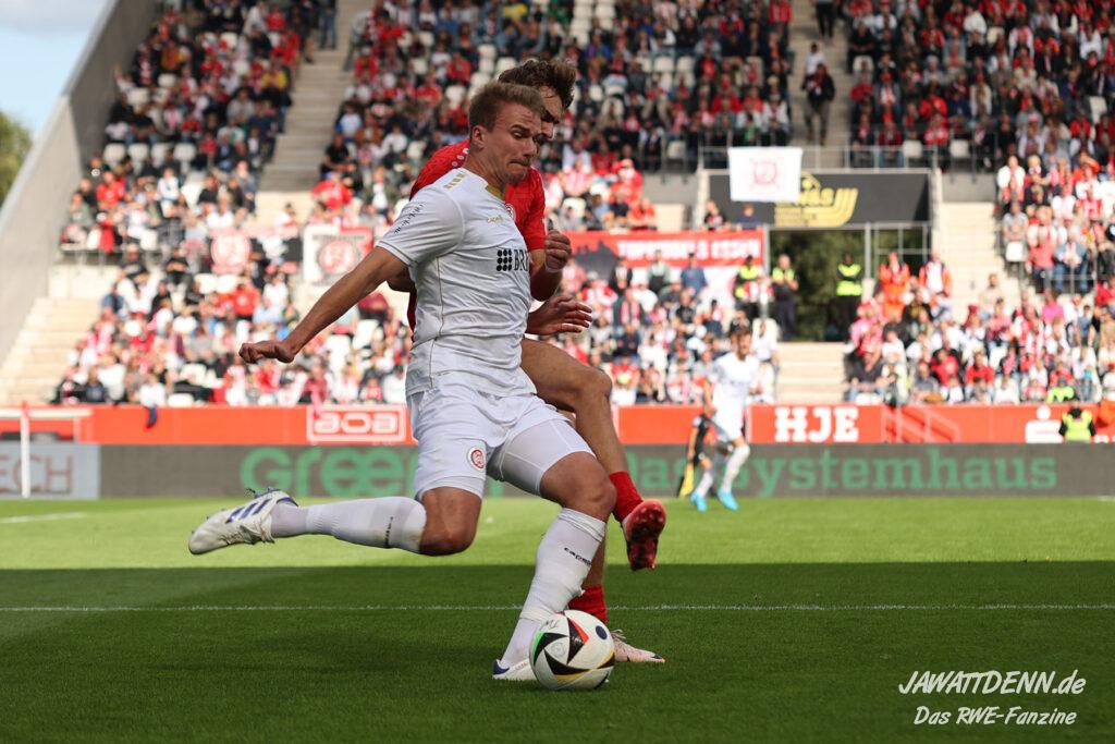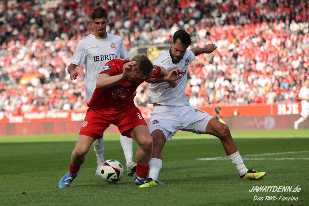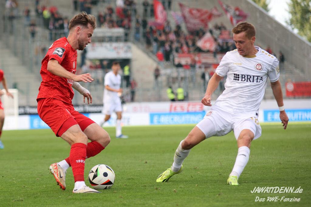 Der fehlenden defensiven Eingespieltheit zum Trotz darf man allerdings erwarten, dass die Zweikampfführung wieder auf Vorjahresniveau erfolgt. Bereits beim Saisonauftakt gegen Aachen hatte man den Eindruck, dass der Gegner nach zehn Jahren Profifußballabstinenz sein Spiel des Lebens ausgerufen hatte, während RWE noch gedanklich in der Sommervorbereitung steckte. Die Anfangsminuten gegen Hannover verliefen ebenfalls vogelwild und nach einer stabilisierten Leistung gegen Bielefeld war das Duell in Unterhaching bereits eine Blaupause für die Niederlage gegen Wiesbaden, da aus optischer Feldüberlegenheit nichts Zählbares erzwungen werden konnte und RWE von einem Gegner geschlagen wurde, der in beiden Strafräumen mit erheblich mehr Konsequenz zu Werke ging.