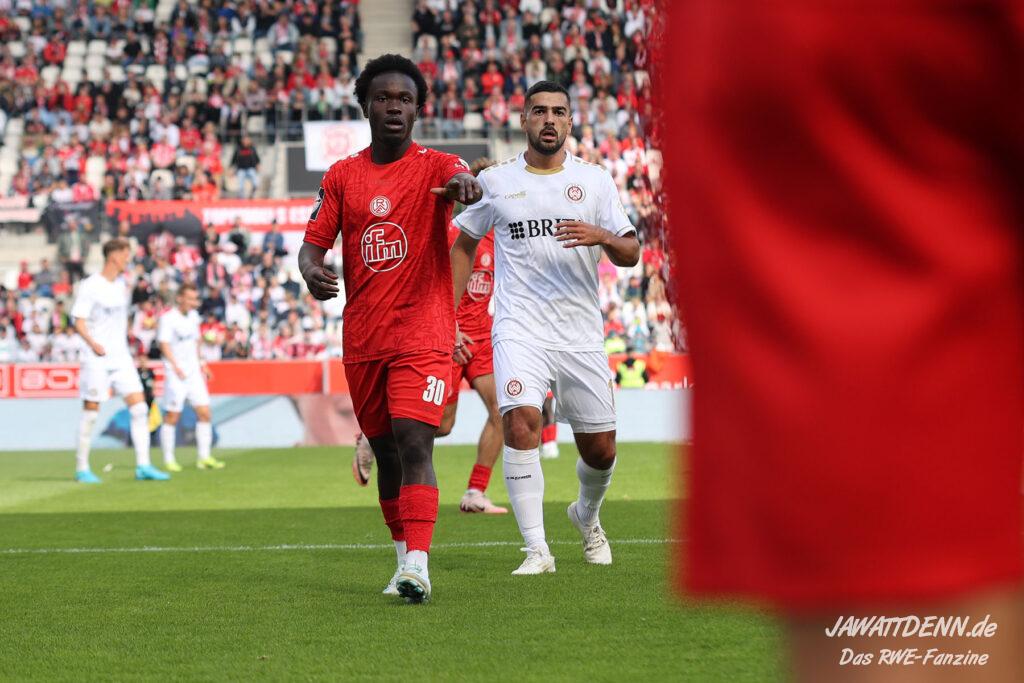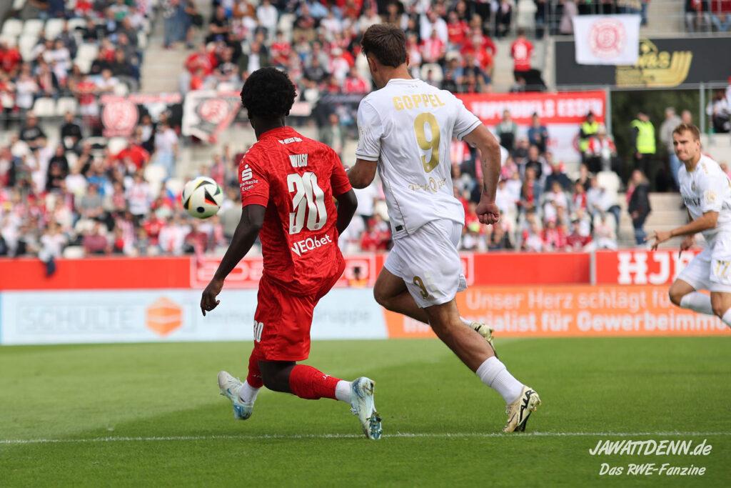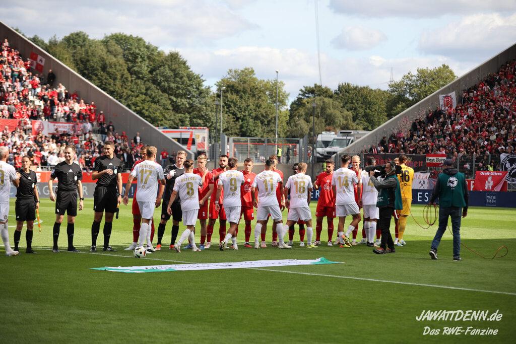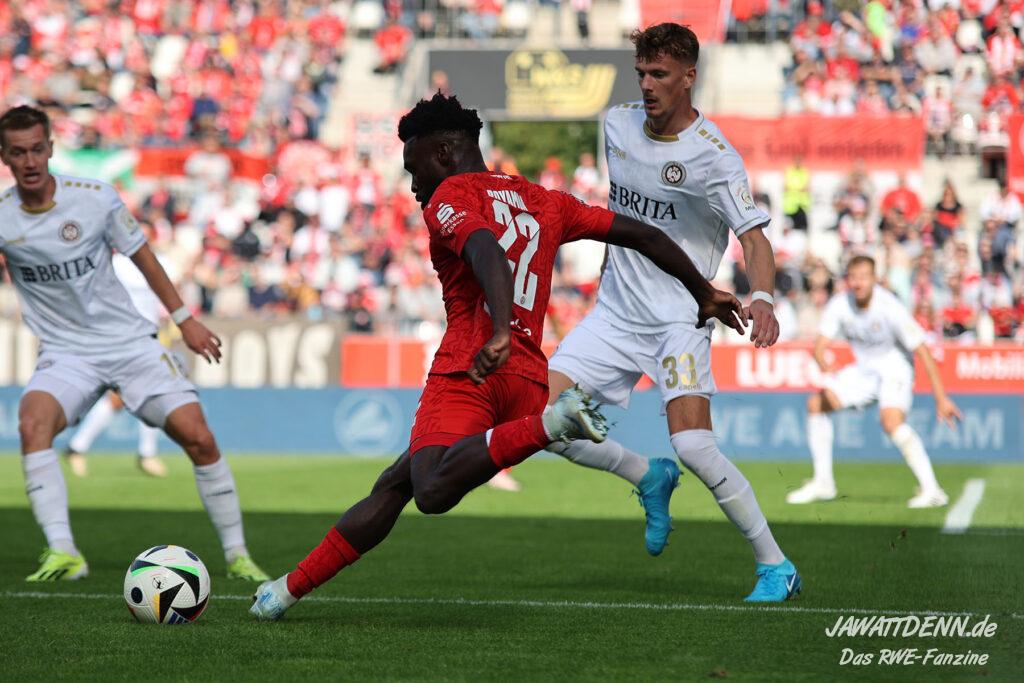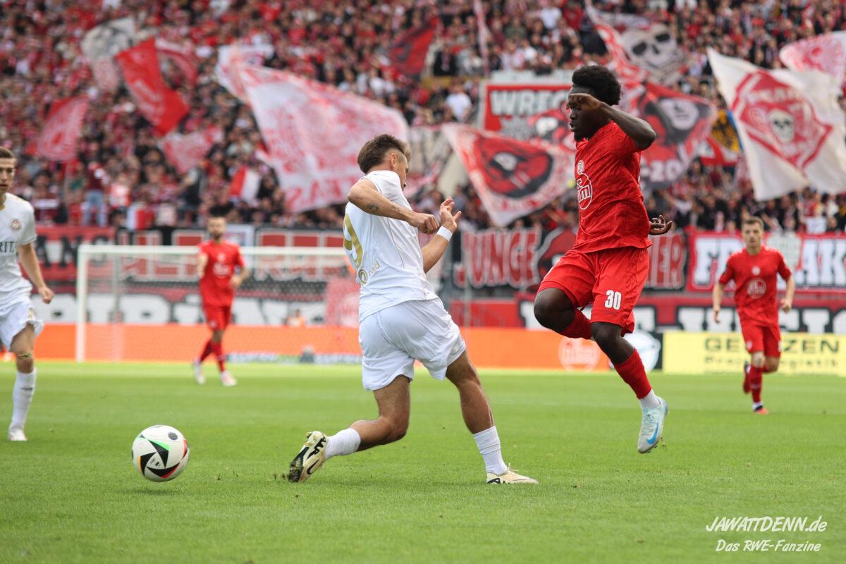 RWE legte gut los und zeigte sich fest entschlossen, die Spielkontrolle zu übernehmen, was bis zum Sechzehnmeterraum der Gäste auch ganz ansehnlich aussah. Meisel und Boyamba deuteten ihre Stärken im Eins-gegen-Eins an und könnten sich noch als Verstärkungen erweisen.