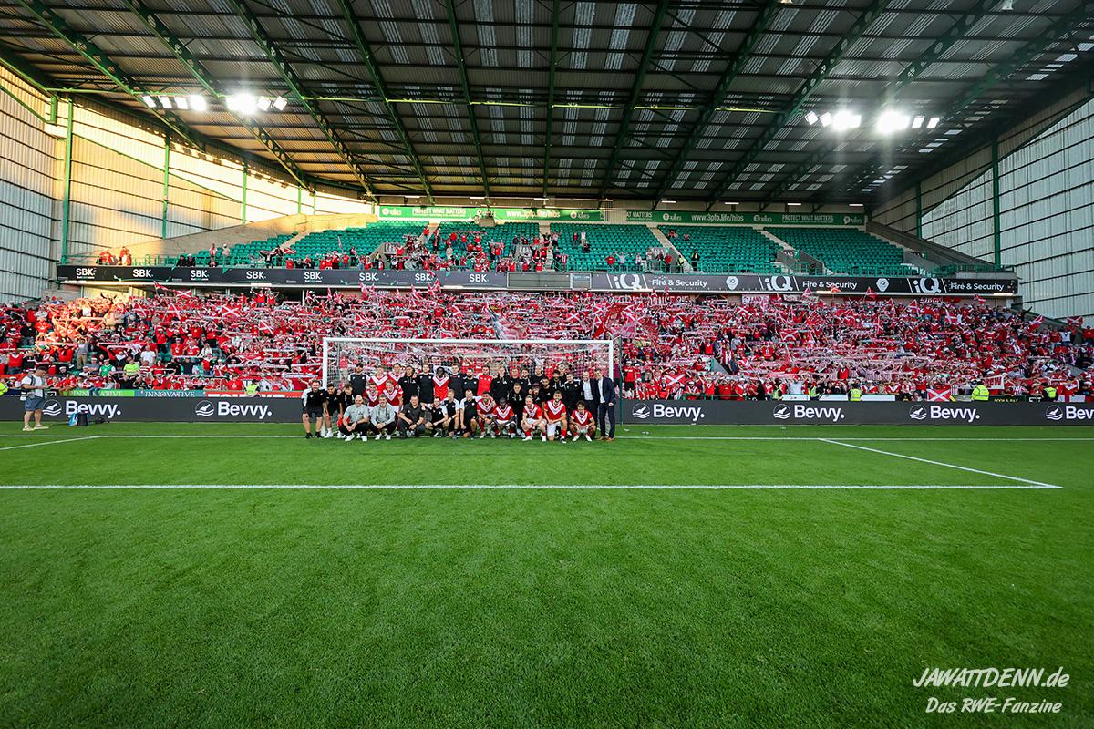 Während die Hibs auf dem Platz noch feierlich eine Tribüne der Easter Road nach Vereinslegende Pat Stanton benannten, wähnten sich die mitgereisten Essener immer noch in einem Traum. „Ganz normaler Mittwoch“ schallte es ungläubig und mit der nötigen Ironie tausendfach durch das Stadion bis ins Hafengebiet von Leith. Auch der schnelle 2:0-Rückstand konnte den Gästeanhang nicht bremsen, der allem voran in der 1. Halbzeit einen bombastischen Support leistete und immer wieder die Blicke und Kameras der schottischen Fans auf sich zog.