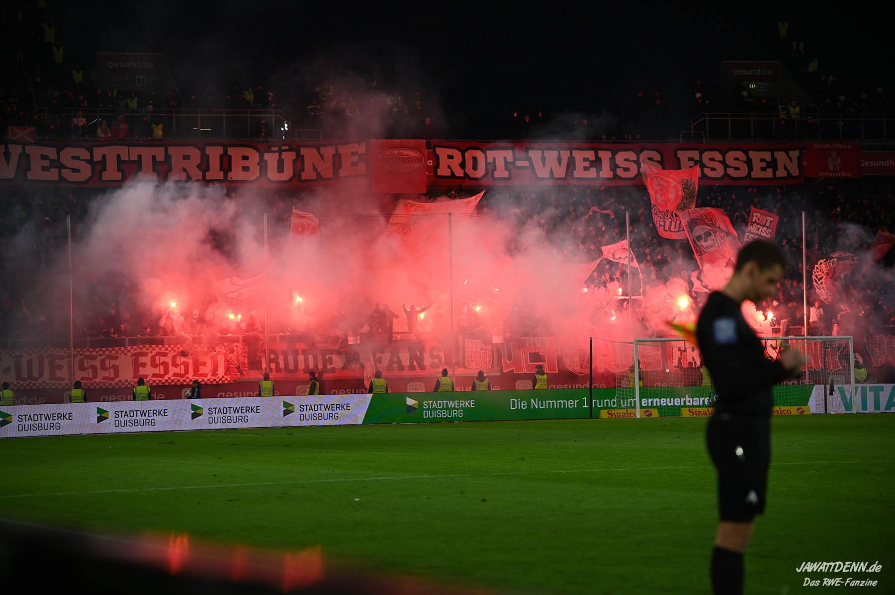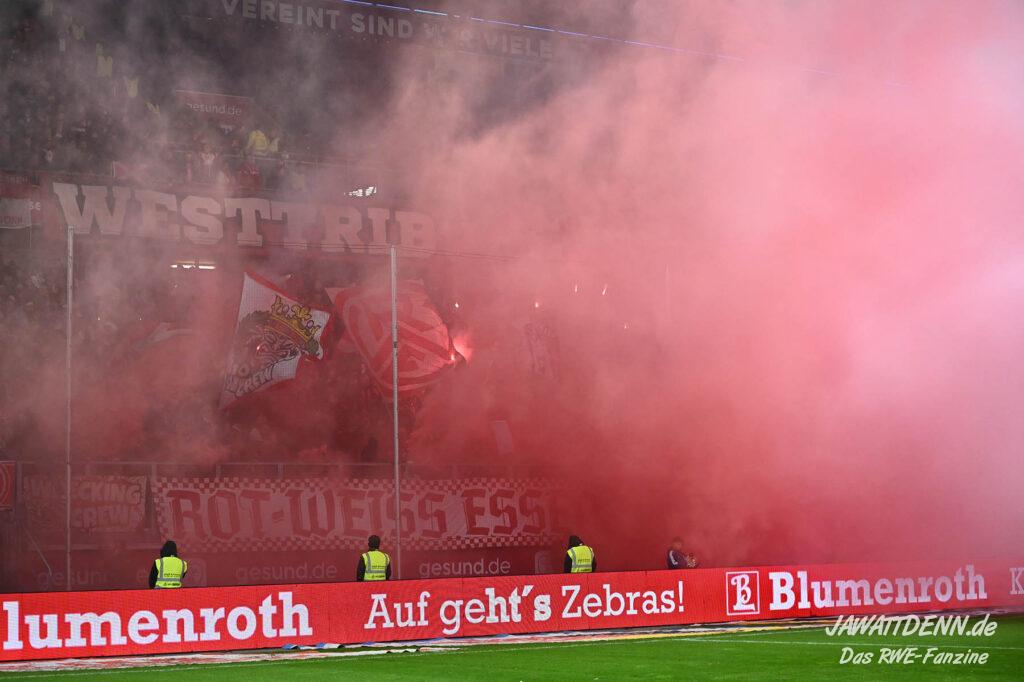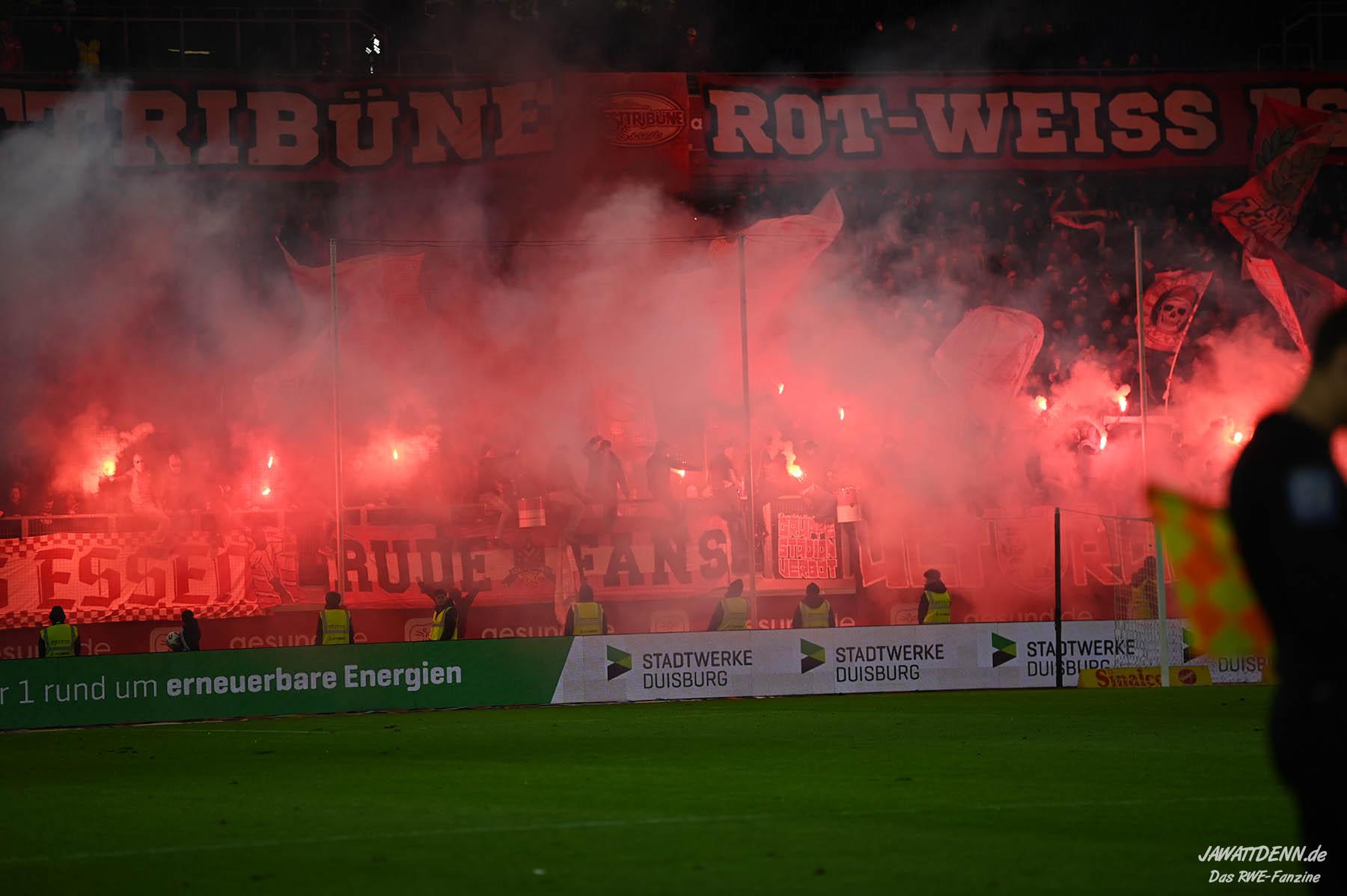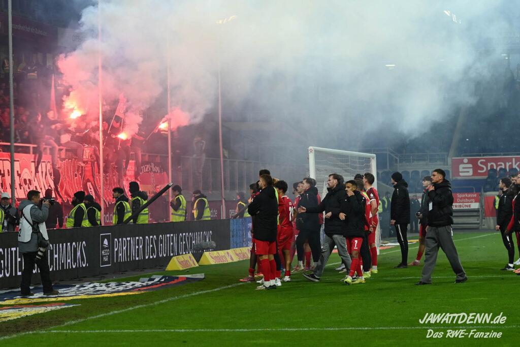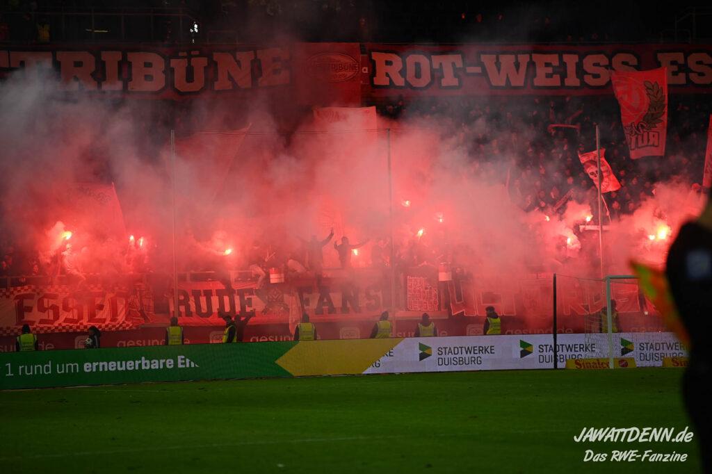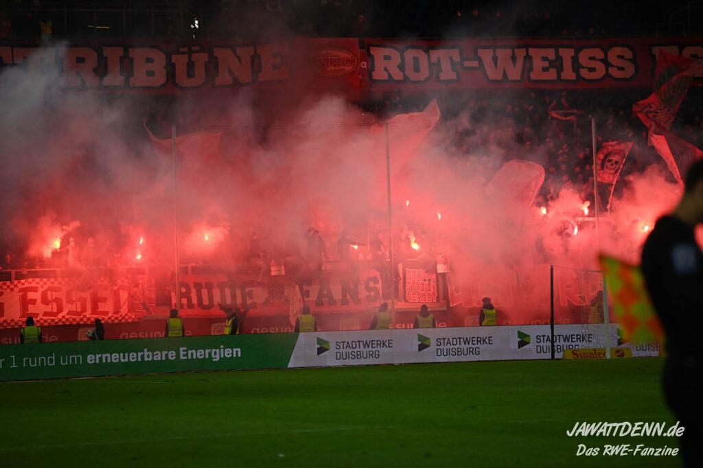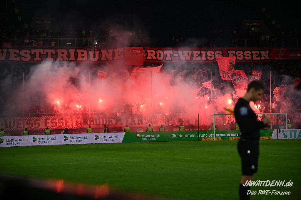 Bei den eigenen Reihen soll es dann auch weitergehen. Im Vorprogramm wurde ein Gespräch mit einem 15-jährigen Mädchen geführt, die dem MSV die Daumen hält und die einen Kampf gegen ihre Krebserkrankung führt. In diesem Fall waren es einige RWE-Anhänger, die hier ernsthaft den Gesang „Halt dein Maul!“ anstimmten. Wer sehen wollte, wie weit die Abstumpfung mancher Menschen geht, der hat das Extrem in dem Moment vorgeführt bekommen. Auch wenn vielleicht nicht jeder mitbekommen haben sollte, warum das Interview geführt wurde, machte es die Sache kaum besser. Wenn der Hass selbst vor Kindern nicht mehr halt macht, dann befindet man sich definitiv weit außerhalb des akzeptablen Bereichs.