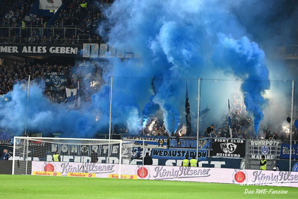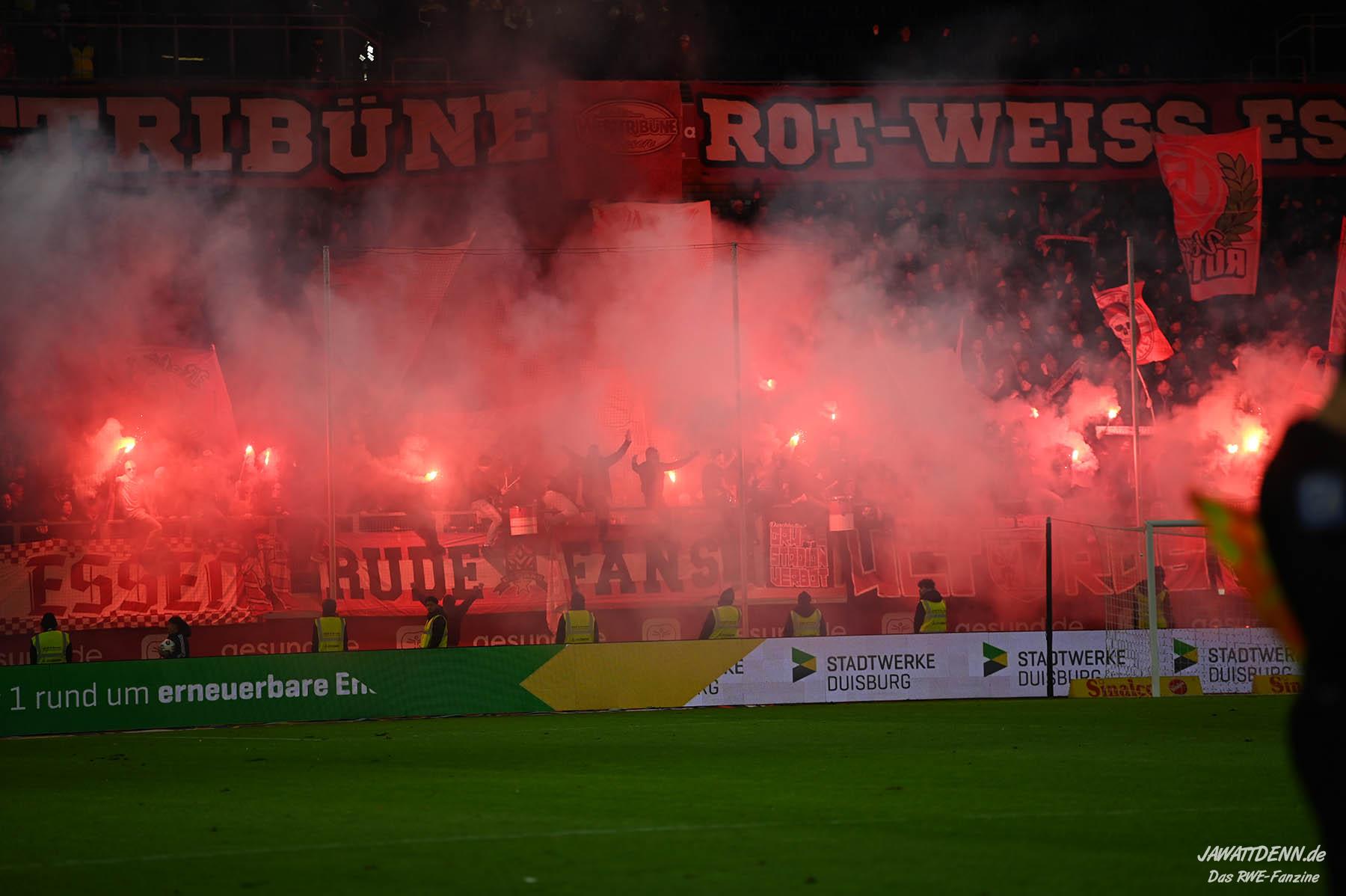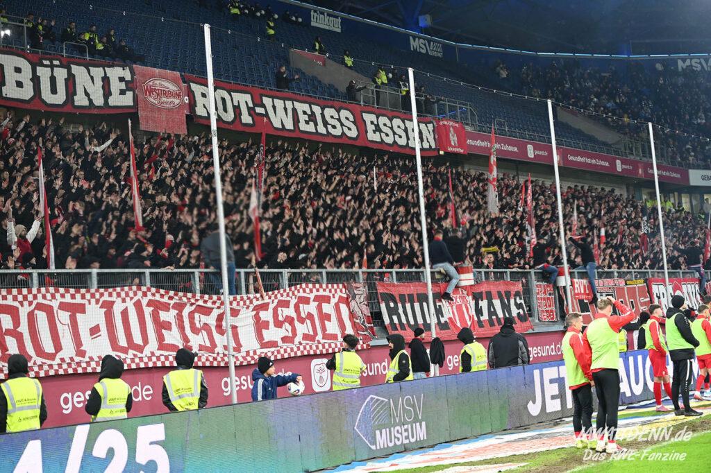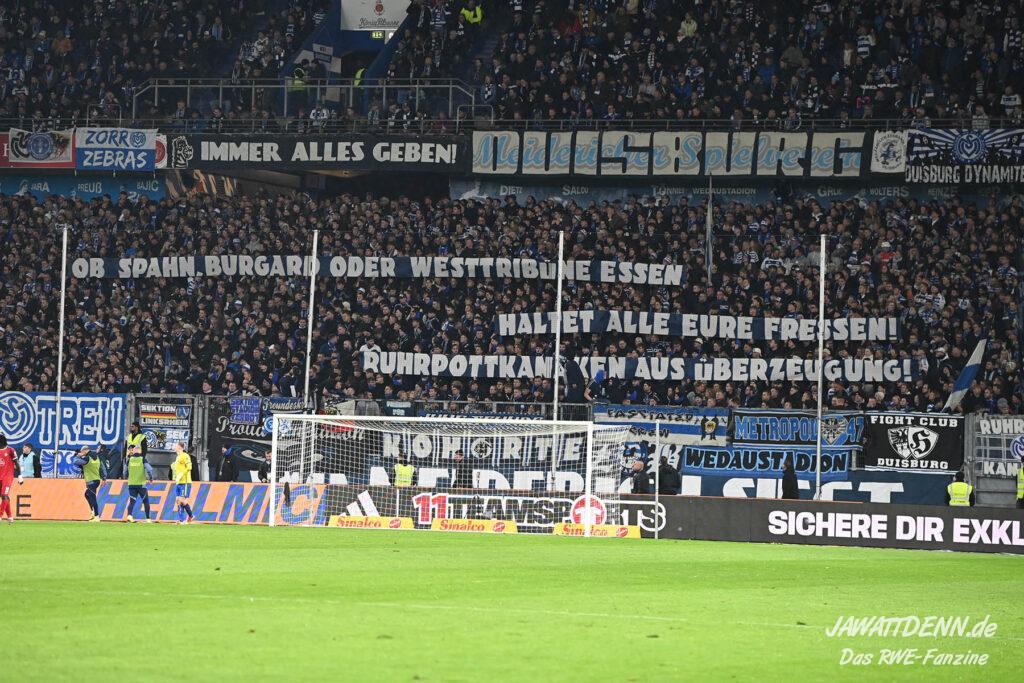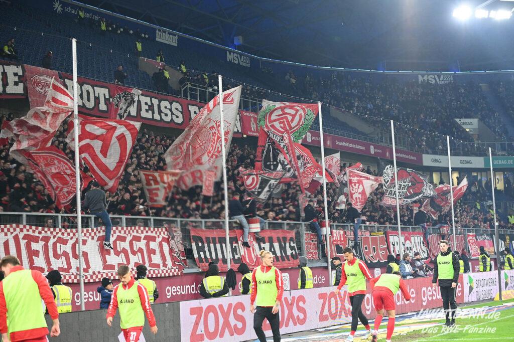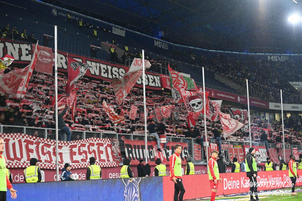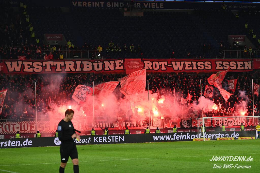 Bei den eigenen Reihen soll es dann auch weitergehen. Im Vorprogramm wurde ein Gespräch mit einem 15-jährigen Mädchen geführt, die dem MSV die Daumen hält und die einen Kampf gegen ihre Krebserkrankung führt. In diesem Fall waren es einige RWE-Anhänger, die hier ernsthaft den Gesang „Halt dein Maul!“ anstimmten. Wer sehen wollte, wie weit die Abstumpfung mancher Menschen geht, der hat das Extrem in dem Moment vorgeführt bekommen. Auch wenn vielleicht nicht jeder mitbekommen haben sollte, warum das Interview geführt wurde, machte es die Sache kaum besser. Wenn der Hass selbst vor Kindern nicht mehr halt macht, dann befindet man sich definitiv weit außerhalb des akzeptablen Bereichs.
