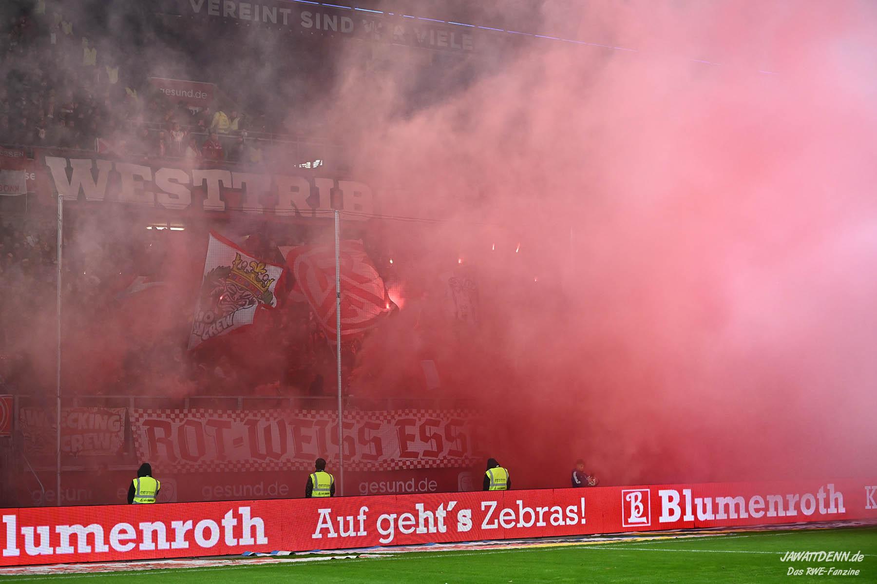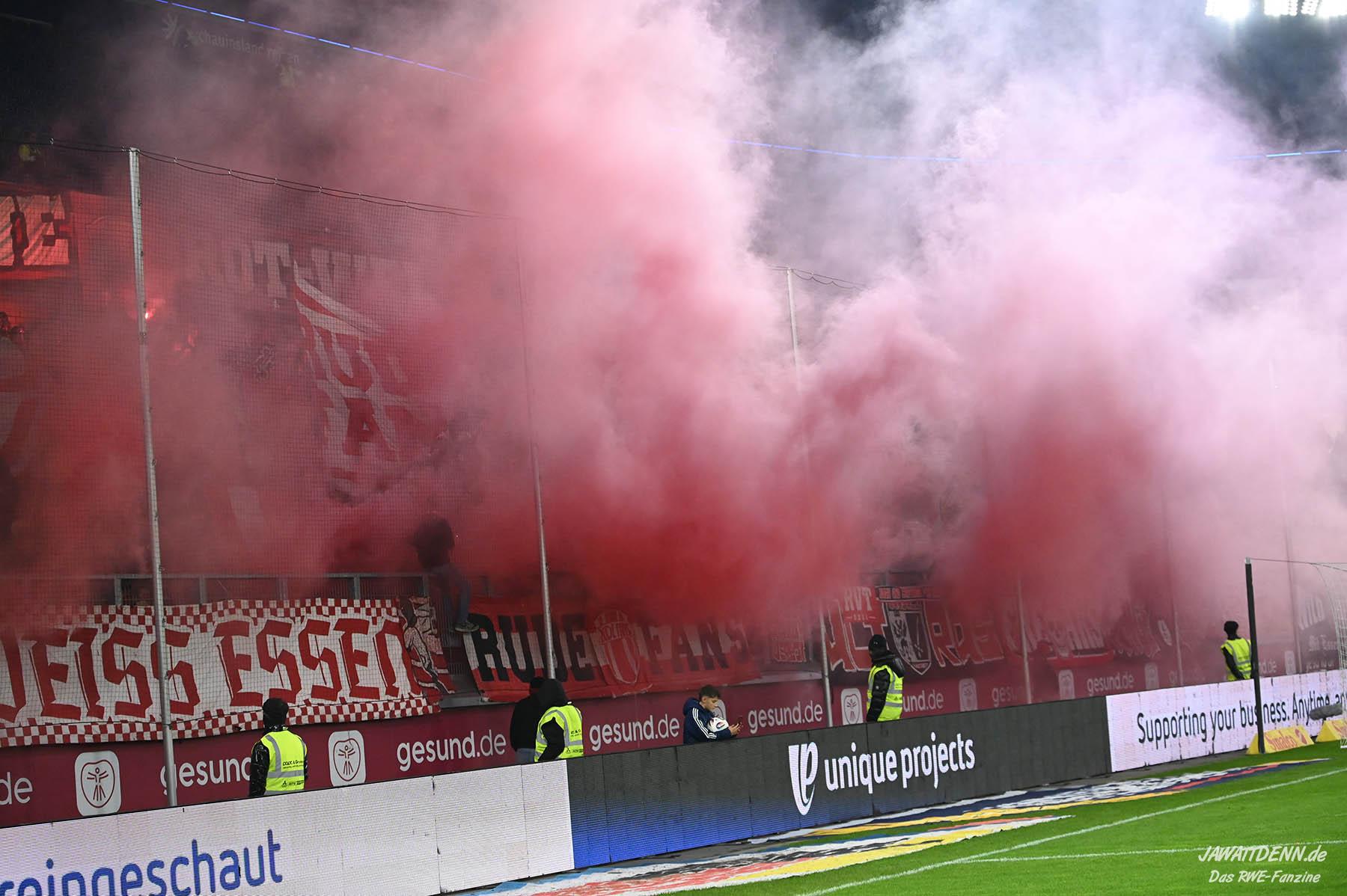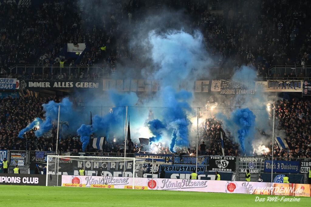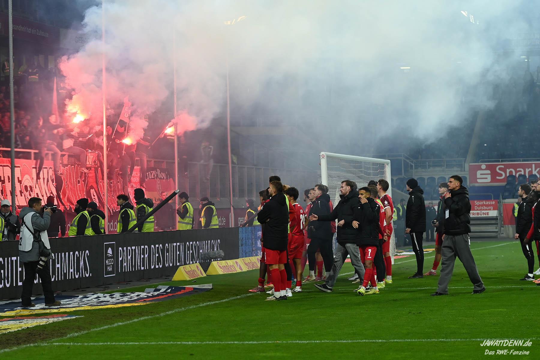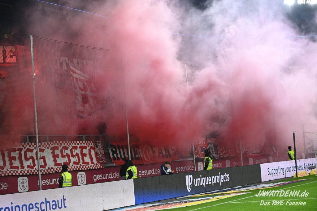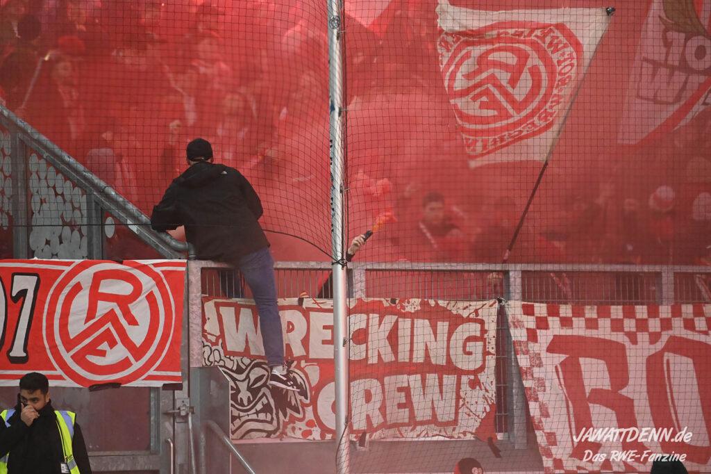 Bei den eigenen Reihen soll es dann auch weitergehen. Im Vorprogramm wurde ein Gespräch mit einem 15-jährigen Mädchen geführt, die dem MSV die Daumen hält und die einen Kampf gegen ihre Krebserkrankung führt. In diesem Fall waren es einige RWE-Anhänger, die hier ernsthaft den Gesang „Halt dein Maul!“ anstimmten. Wer sehen wollte, wie weit die Abstumpfung mancher Menschen geht, der hat das Extrem in dem Moment vorgeführt bekommen. Auch wenn vielleicht nicht jeder mitbekommen haben sollte, warum das Interview geführt wurde, machte es die Sache kaum besser. Wenn der Hass selbst vor Kindern nicht mehr halt macht, dann befindet man sich definitiv weit außerhalb des akzeptablen Bereichs.