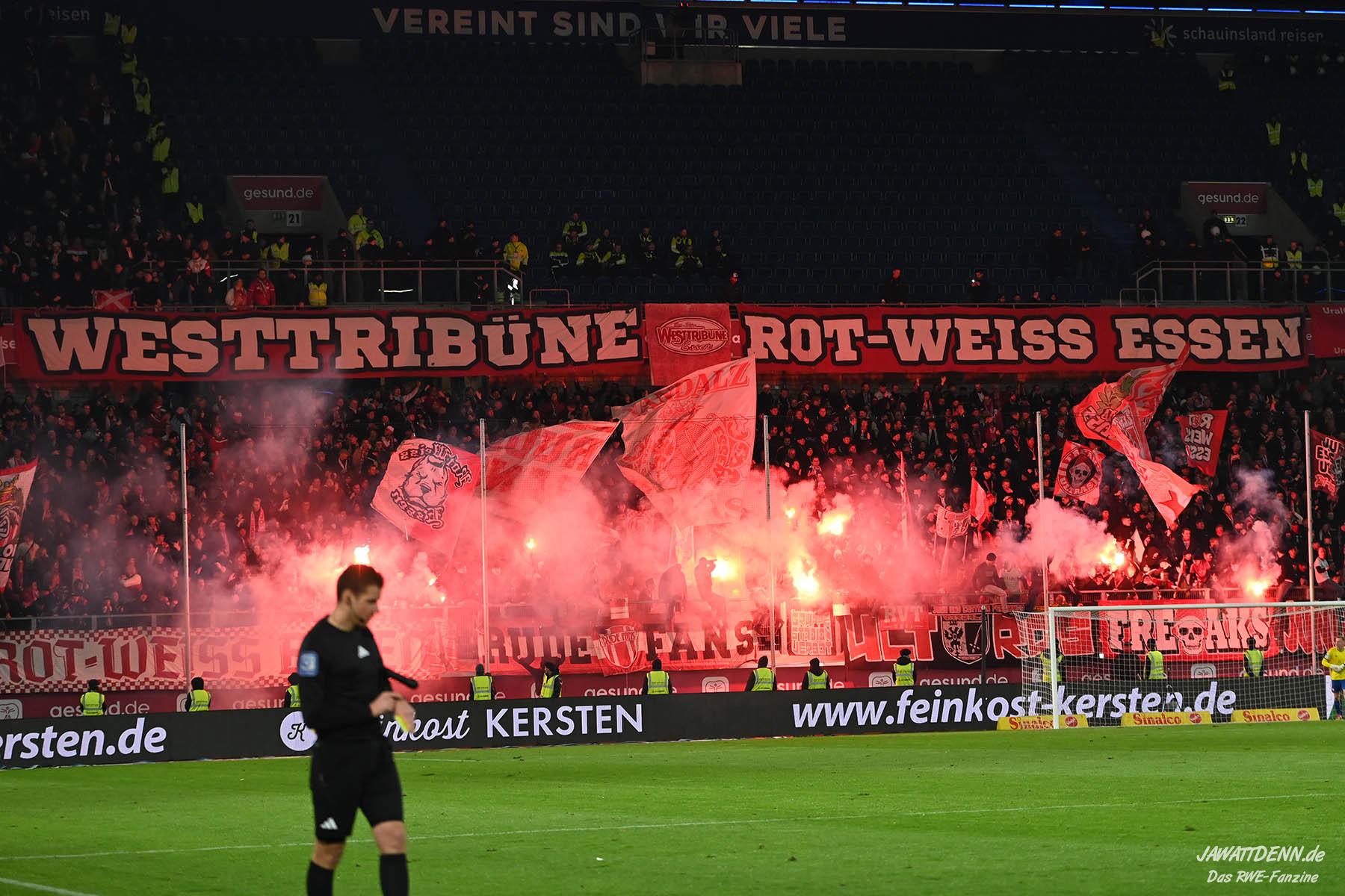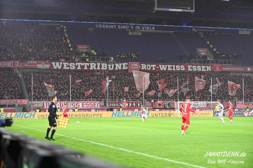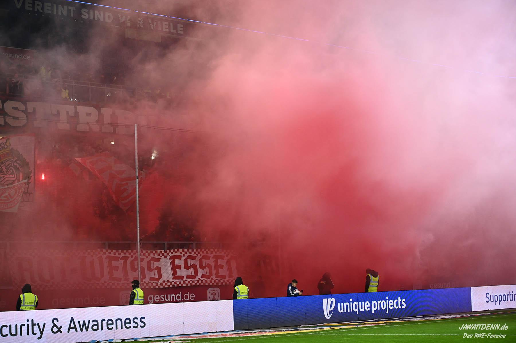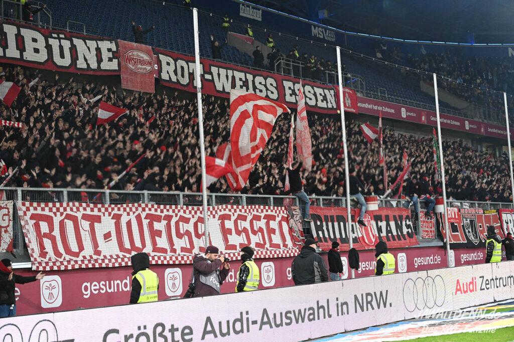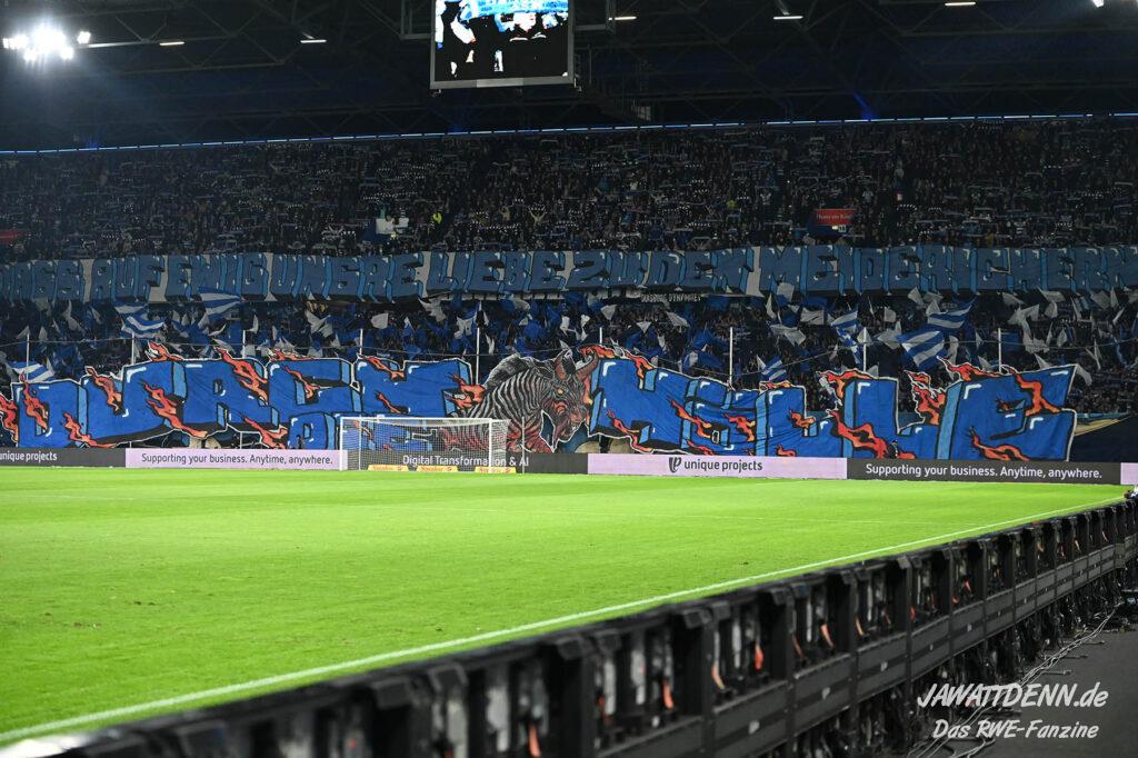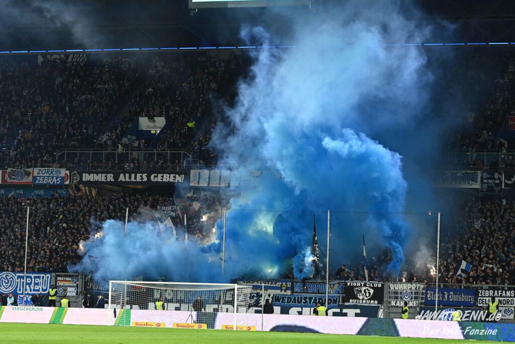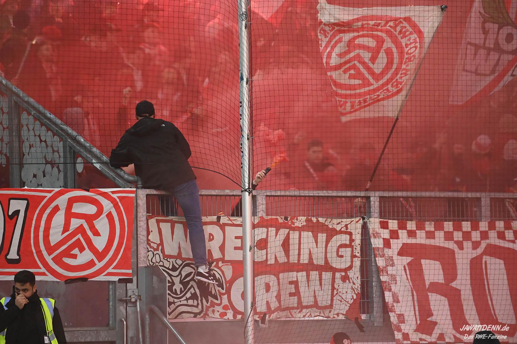 Bei den eigenen Reihen soll es dann auch weitergehen. Im Vorprogramm wurde ein Gespräch mit einem 15-jährigen Mädchen geführt, die dem MSV die Daumen hält und die einen Kampf gegen ihre Krebserkrankung führt. In diesem Fall waren es einige RWE-Anhänger, die hier ernsthaft den Gesang „Halt dein Maul!“ anstimmten. Wer sehen wollte, wie weit die Abstumpfung mancher Menschen geht, der hat das Extrem in dem Moment vorgeführt bekommen. Auch wenn vielleicht nicht jeder mitbekommen haben sollte, warum das Interview geführt wurde, machte es die Sache kaum besser. Wenn der Hass selbst vor Kindern nicht mehr halt macht, dann befindet man sich definitiv weit außerhalb des akzeptablen Bereichs.