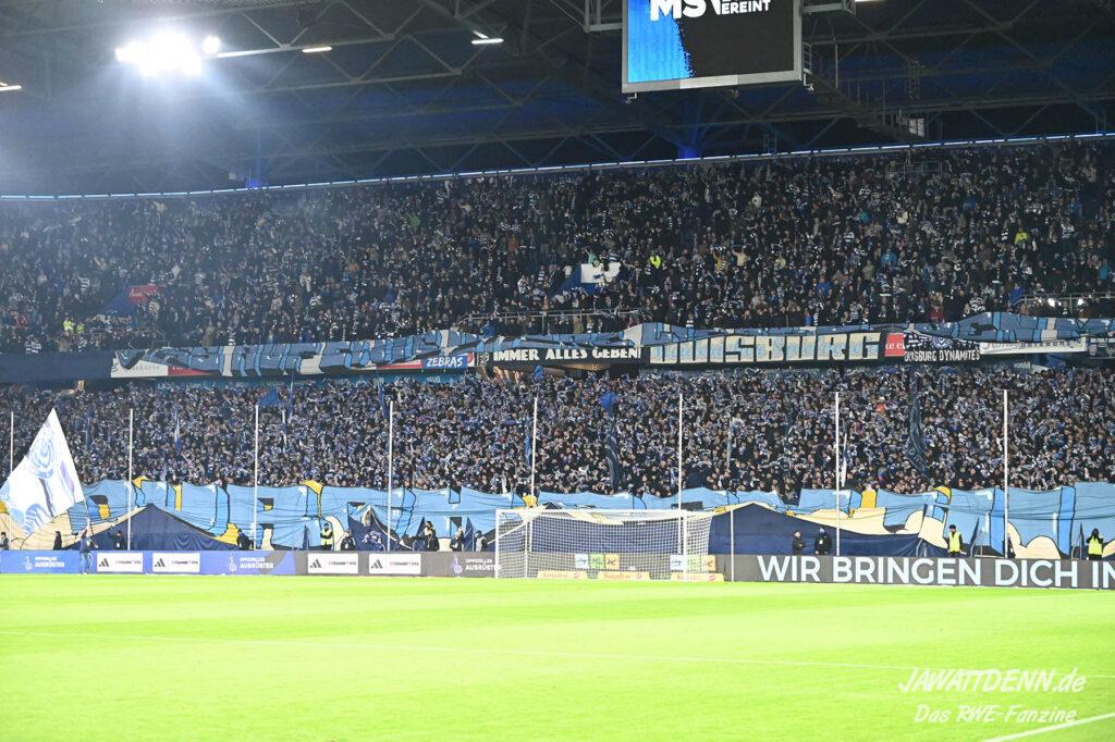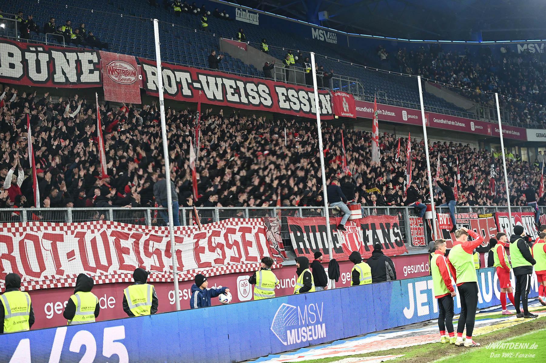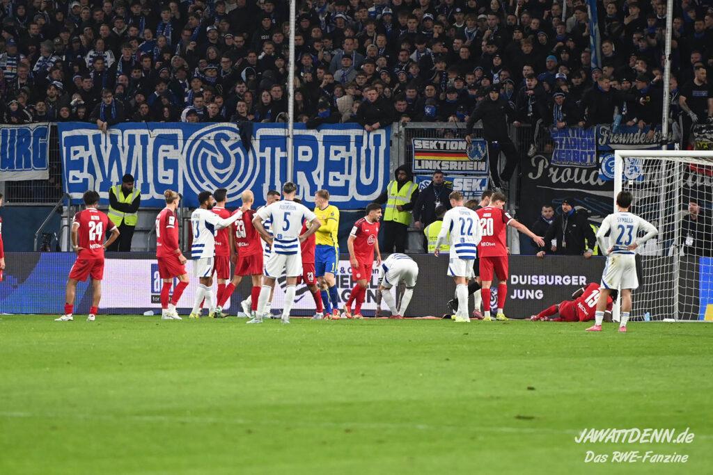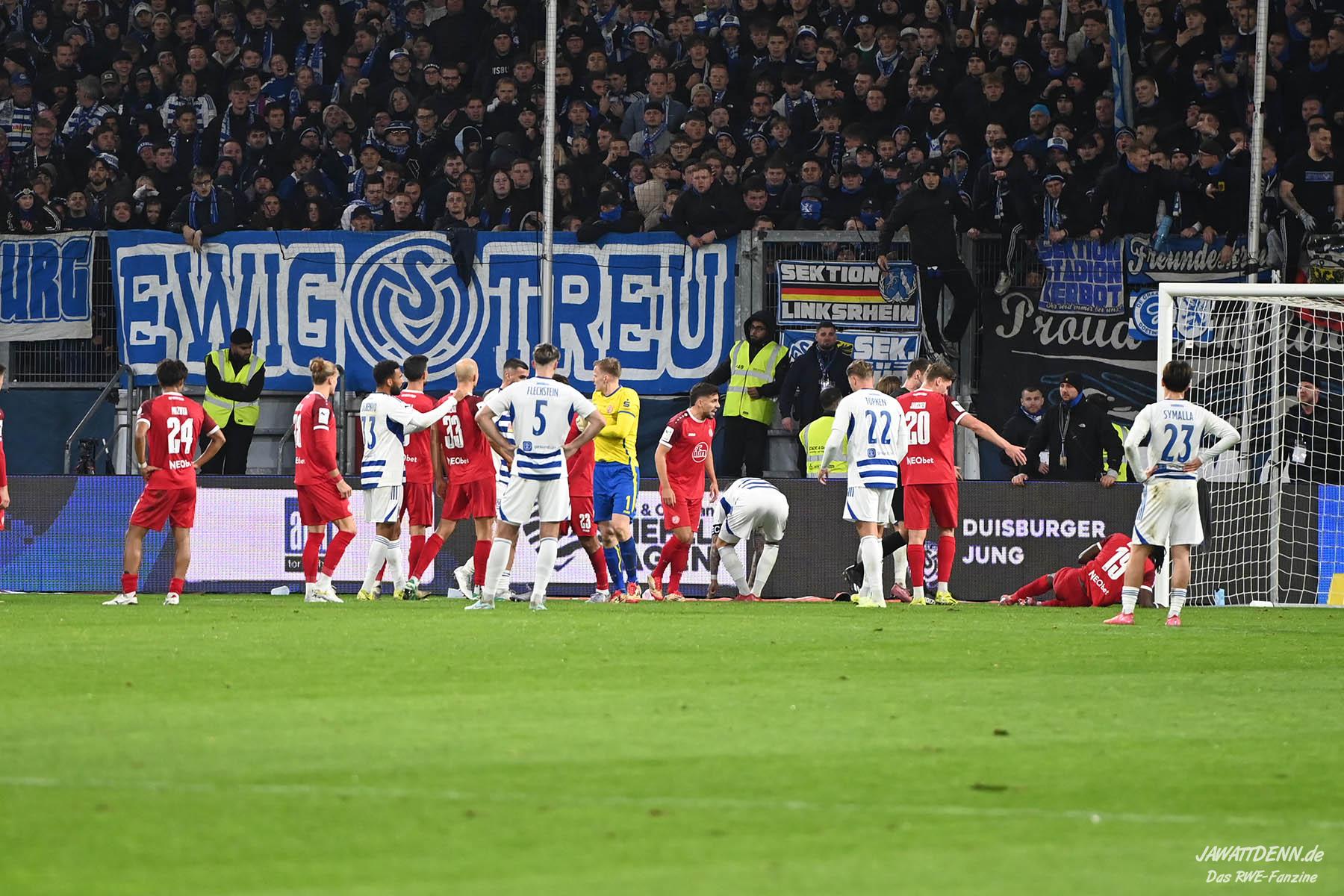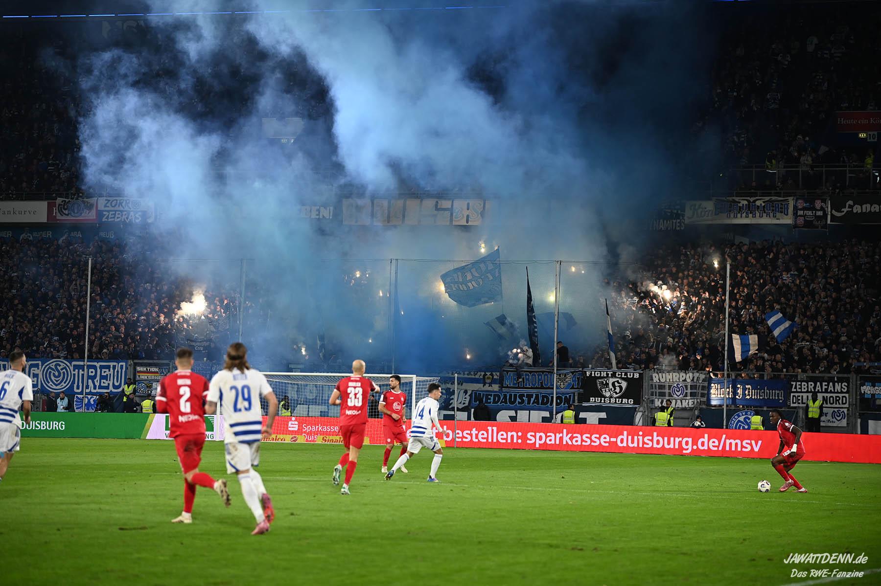 Einige MSV-Anhänger hissten in der zweiten Hälfte ein Plakat, auf dem den RWE-Fans vorgeworfen wurde, dass sie gefeiert haben, während ein Mensch um sein Leben gerungen hat. Diese Meldung wurde bereits kurz nach dem Pokalfinale als Falschmeldung entlarvt, da auch die RWE-Anhänger den Support einstellten, bis der Sanitätseinsatz beendet wurde und man nach der Stadiondurchsage den Eindruck hatte, der Anhänger sei außer Lebensgefahr. Diesen Tod Monate danach noch auf diese Weise zu instrumentalisieren, lässt einen fassungslos zurück.