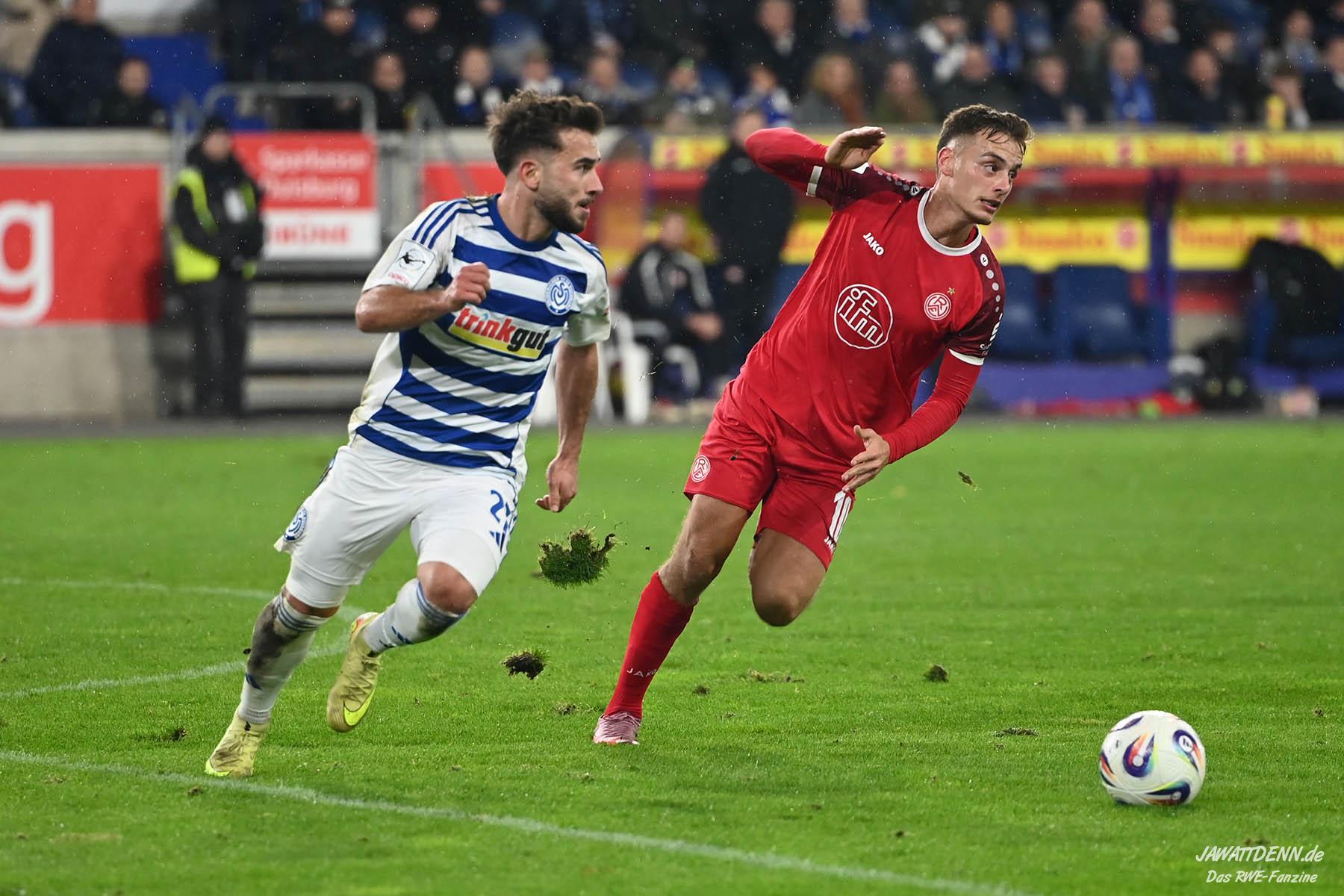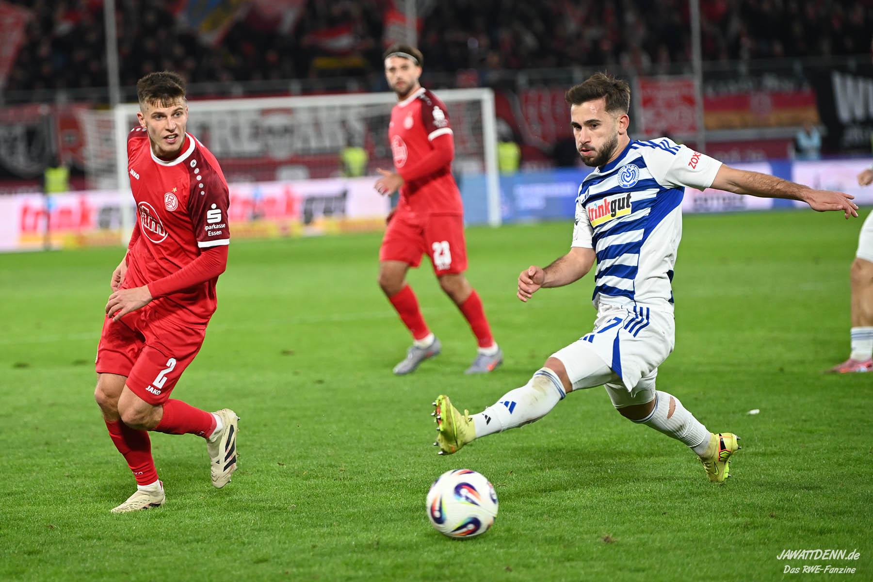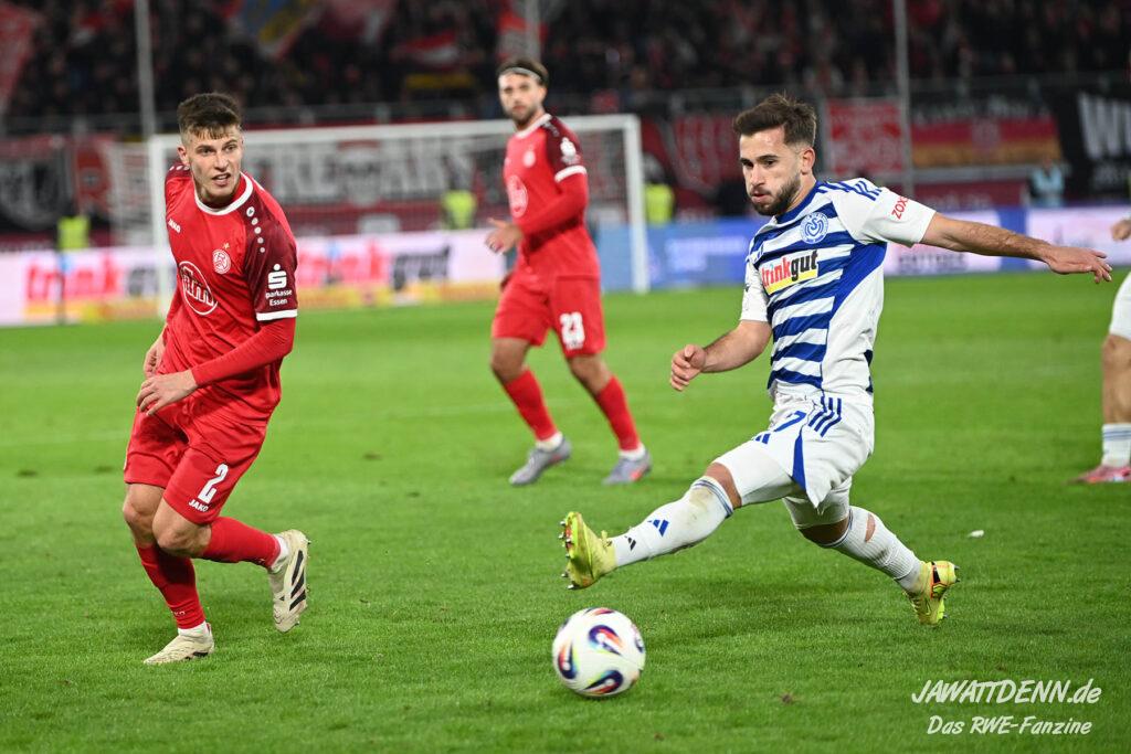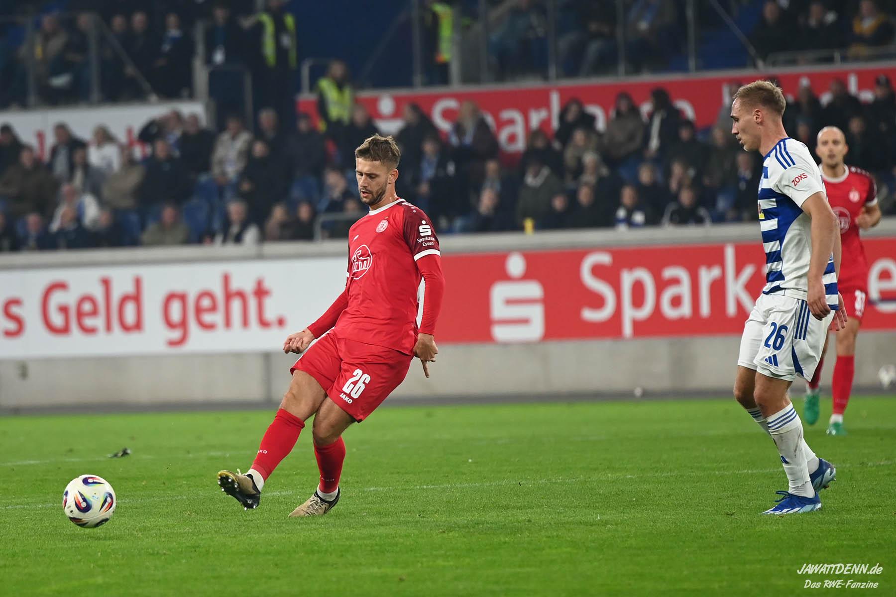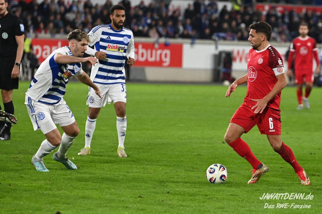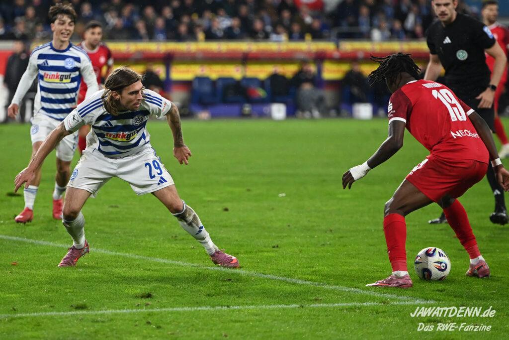 Wer befürchtet hatte, heißblütige Gastgeber würden RWE von Beginn an stark stressen und unter Druck setzen, sah sich angenehm getäuscht. Die Rot-Weissen bewahrten kühlen Kopf, ließen Ball und Gegner laufen, der MSV kam kaum einmal in Pressingmomente, weil RWE mit gutem Positionsspiel und starkem Spielaufbau aus der eigenen Deckung heraus immer wieder spielerische Lösungen fand.