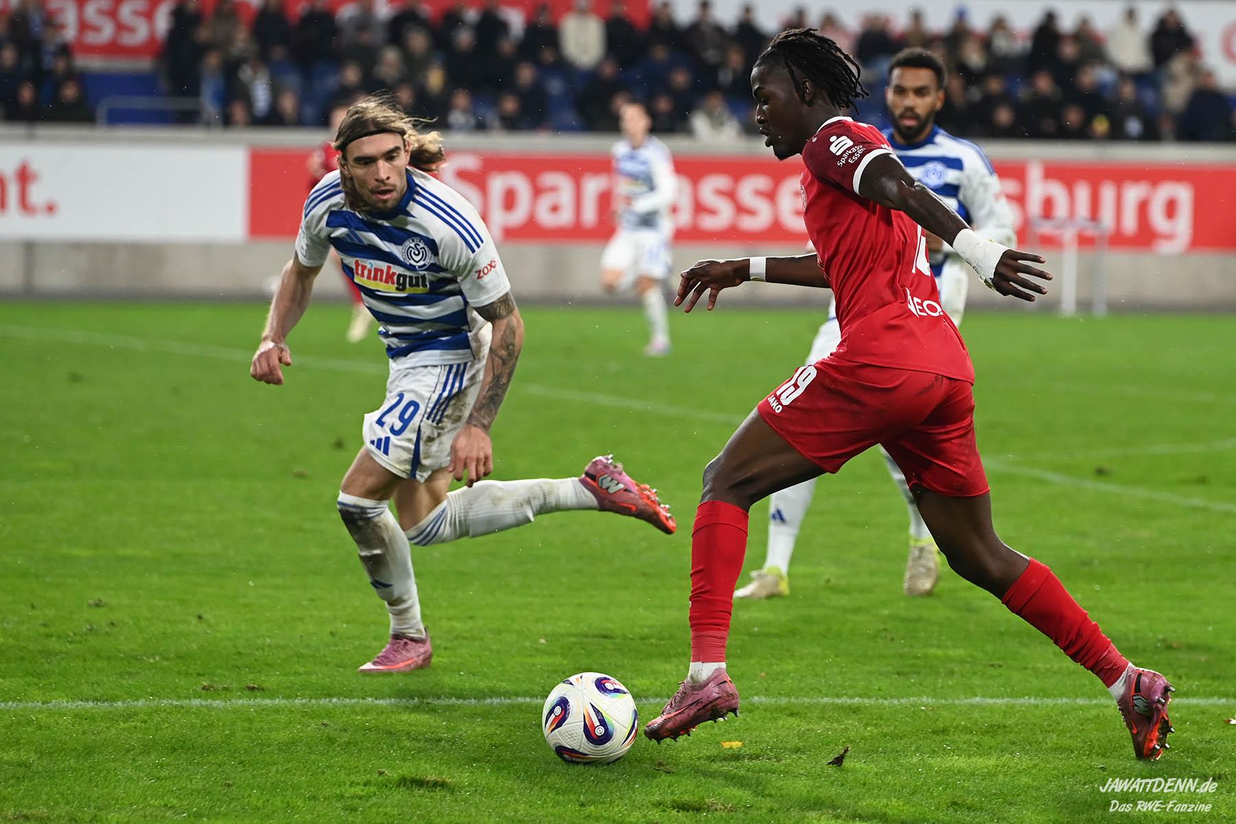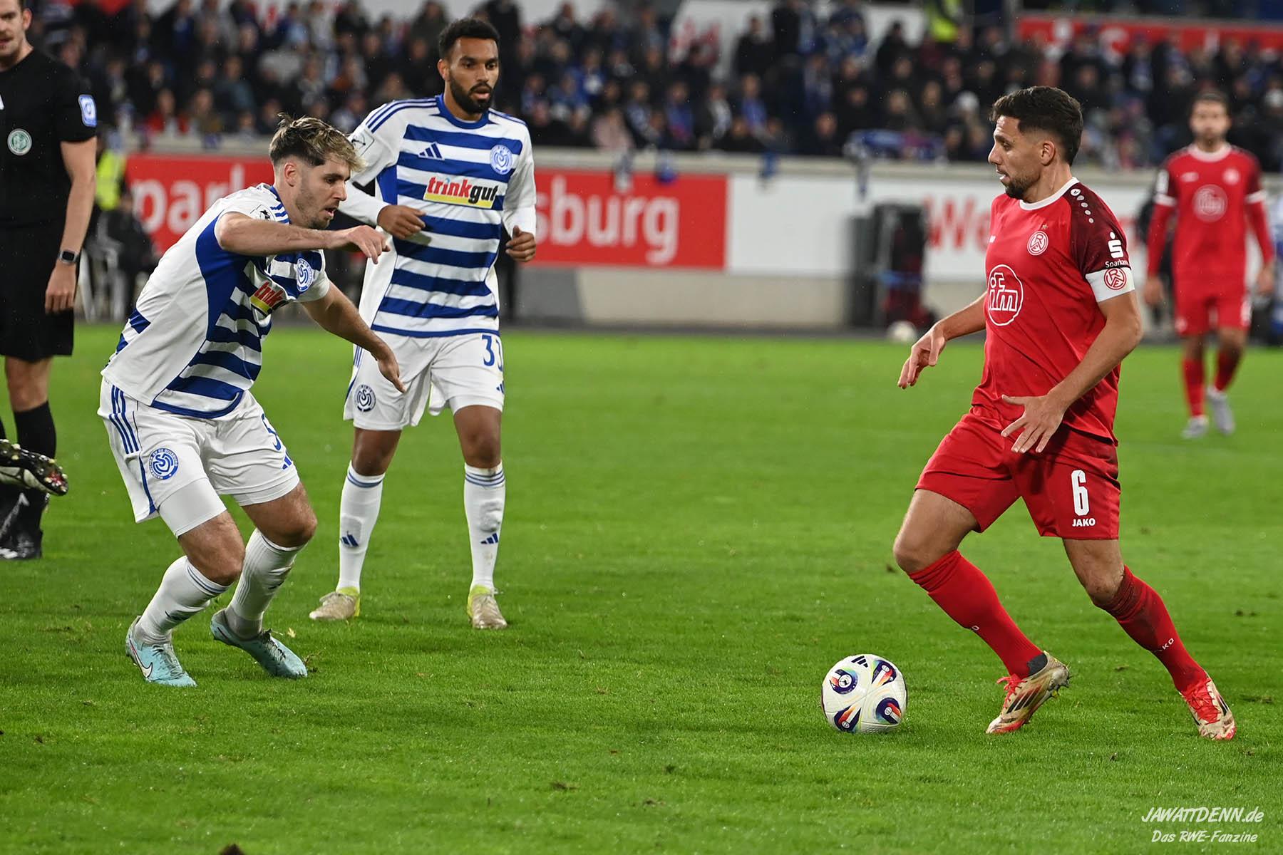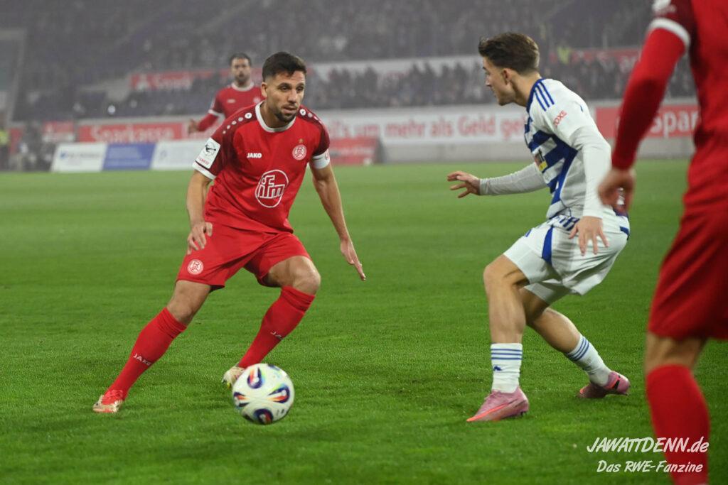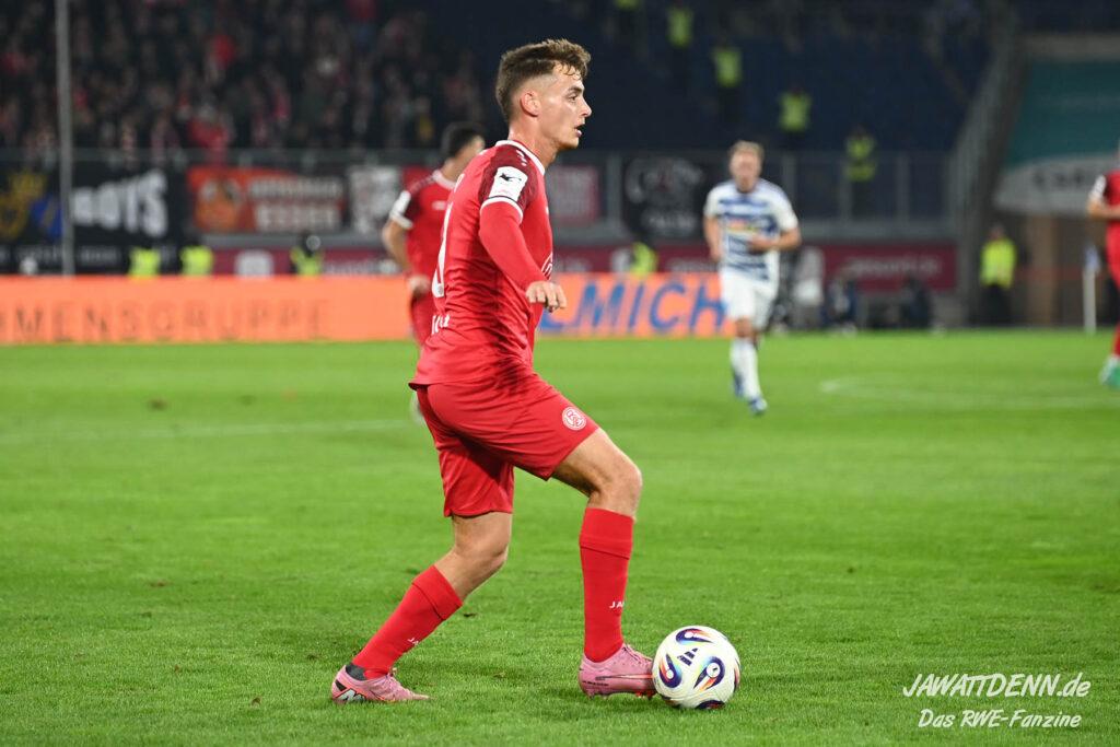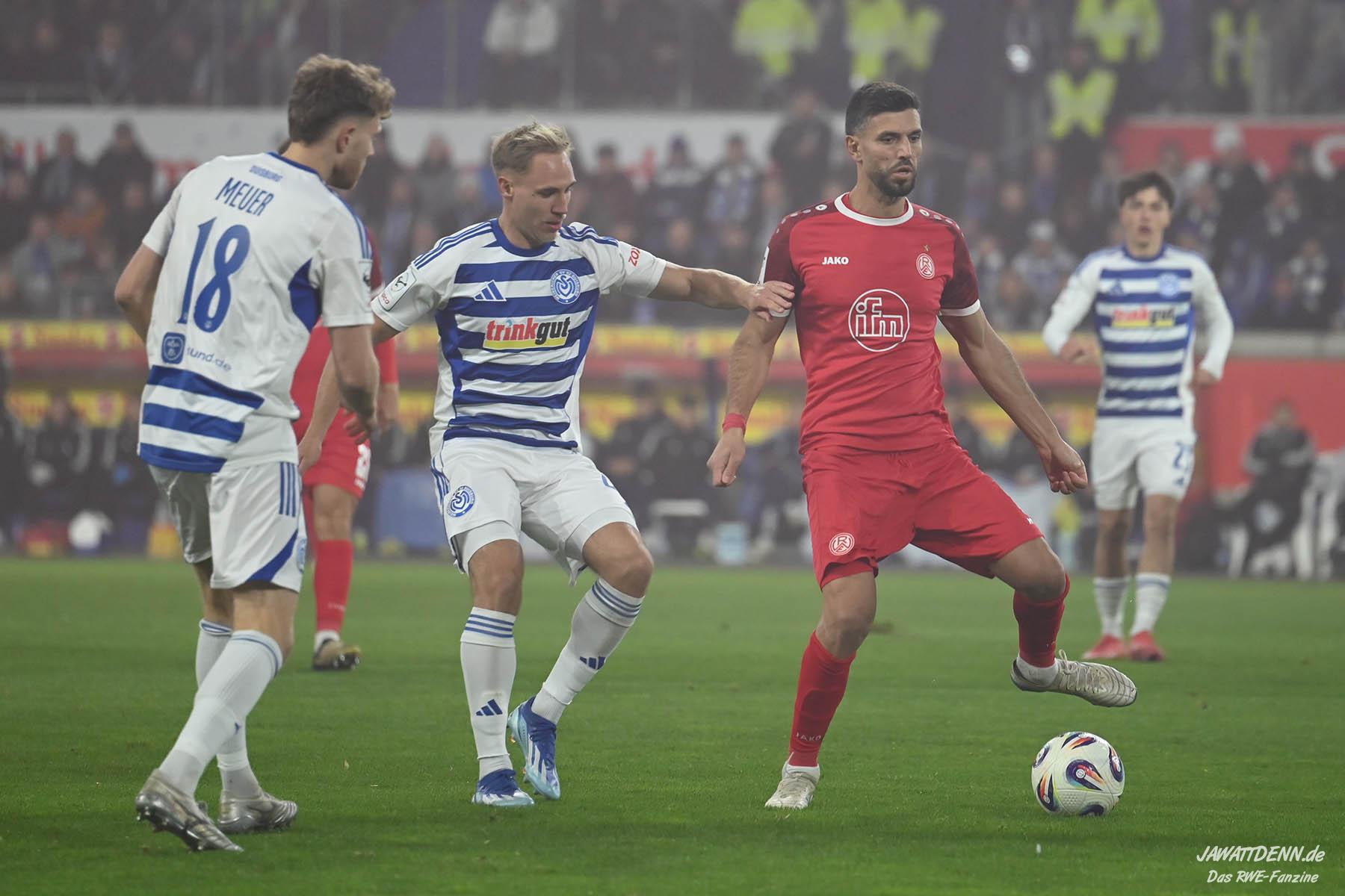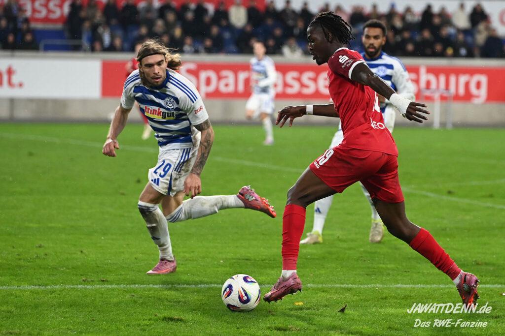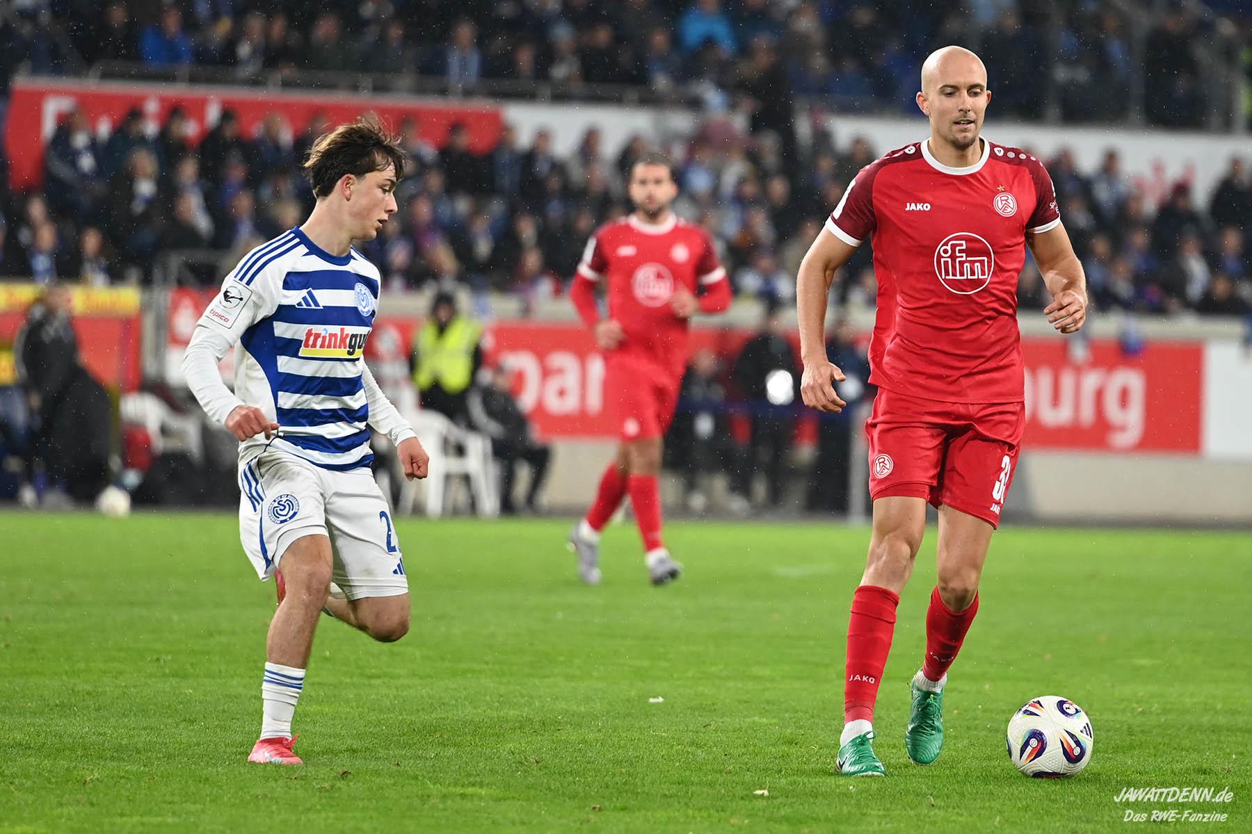 Wer befürchtet hatte, heißblütige Gastgeber würden RWE von Beginn an stark stressen und unter Druck setzen, sah sich angenehm getäuscht. Die Rot-Weissen bewahrten kühlen Kopf, ließen Ball und Gegner laufen, der MSV kam kaum einmal in Pressingmomente, weil RWE mit gutem Positionsspiel und starkem Spielaufbau aus der eigenen Deckung heraus immer wieder spielerische Lösungen fand.