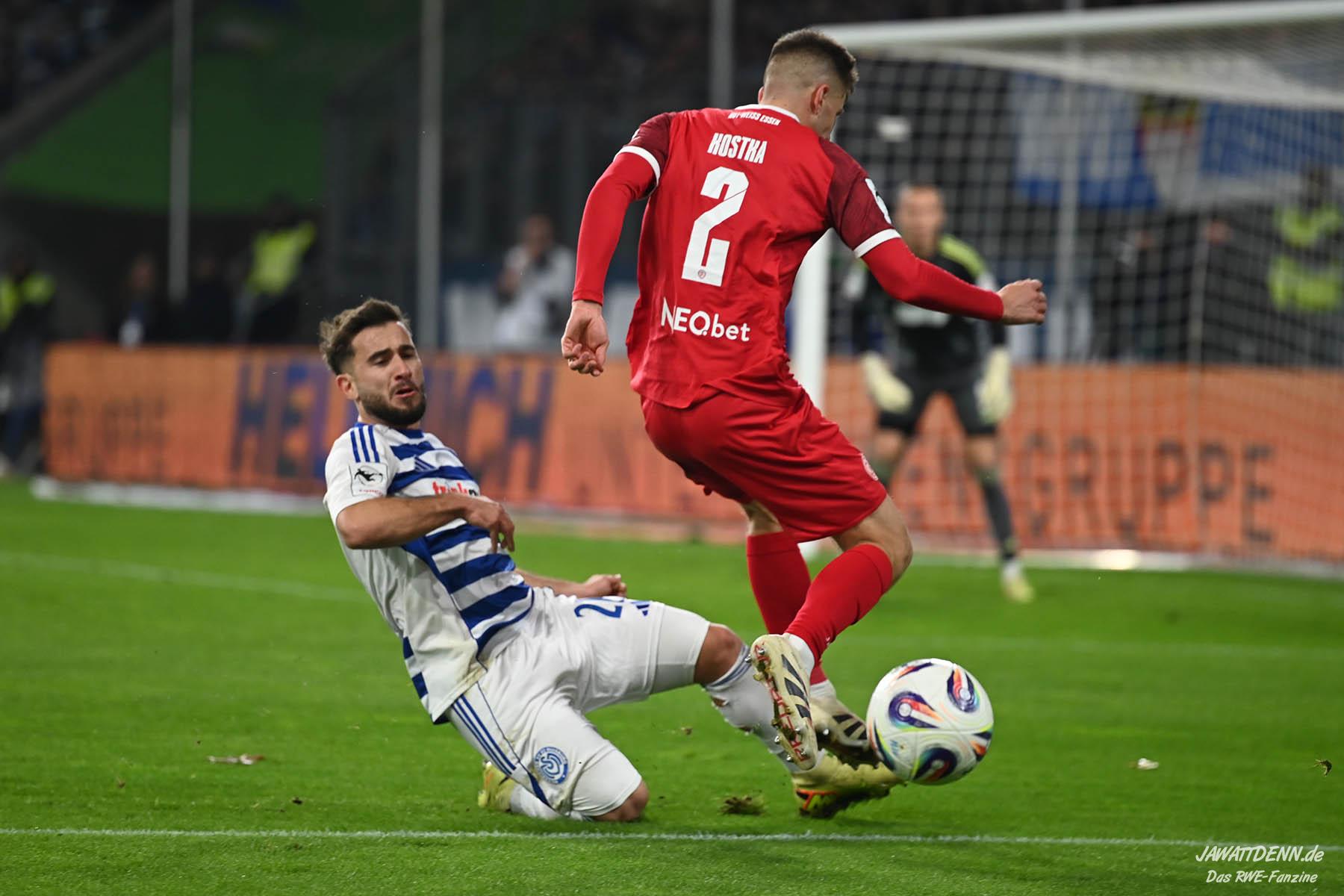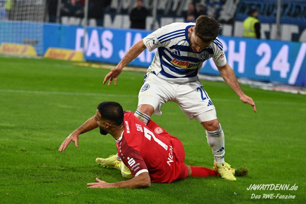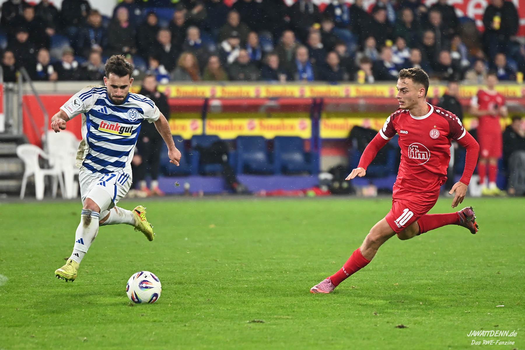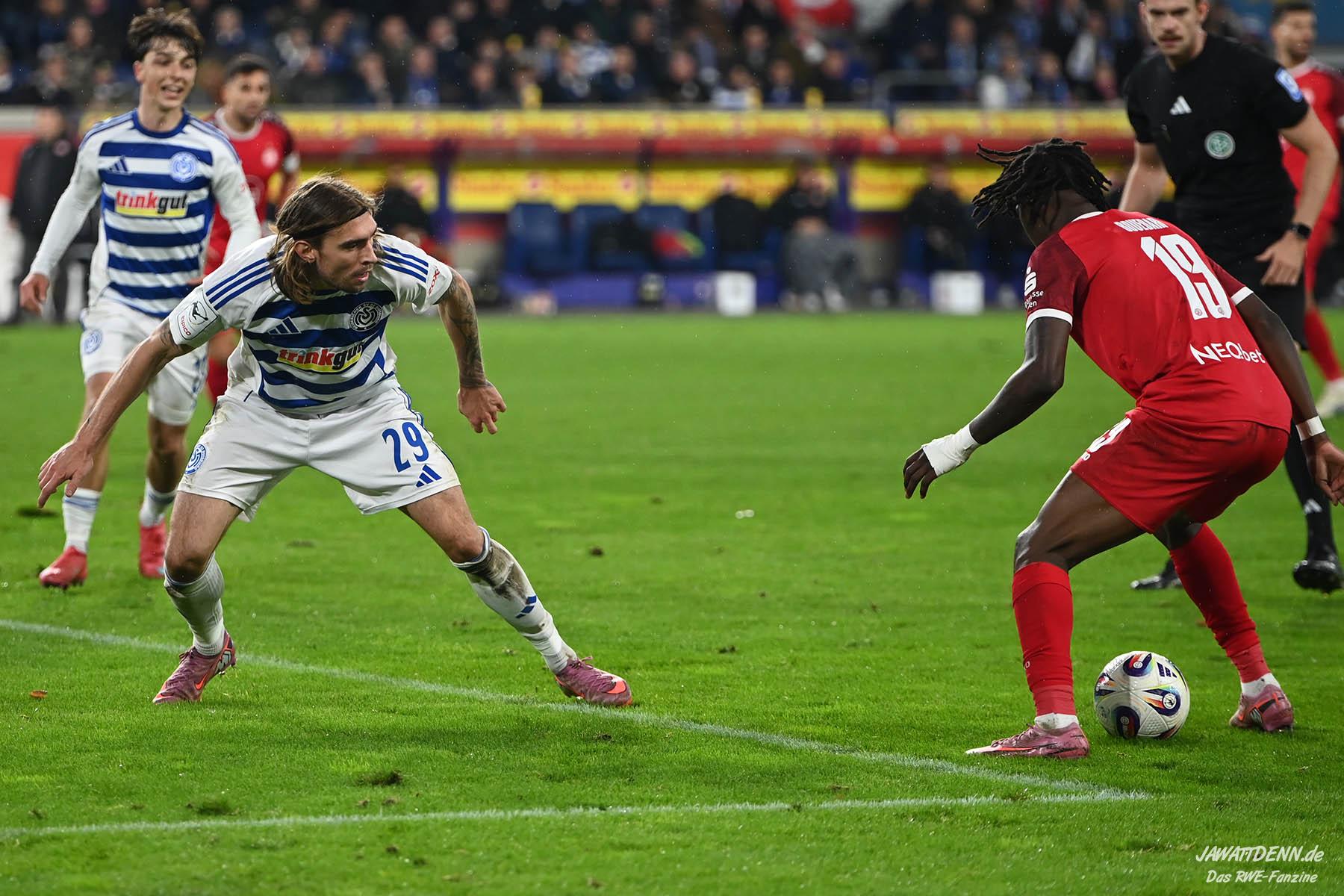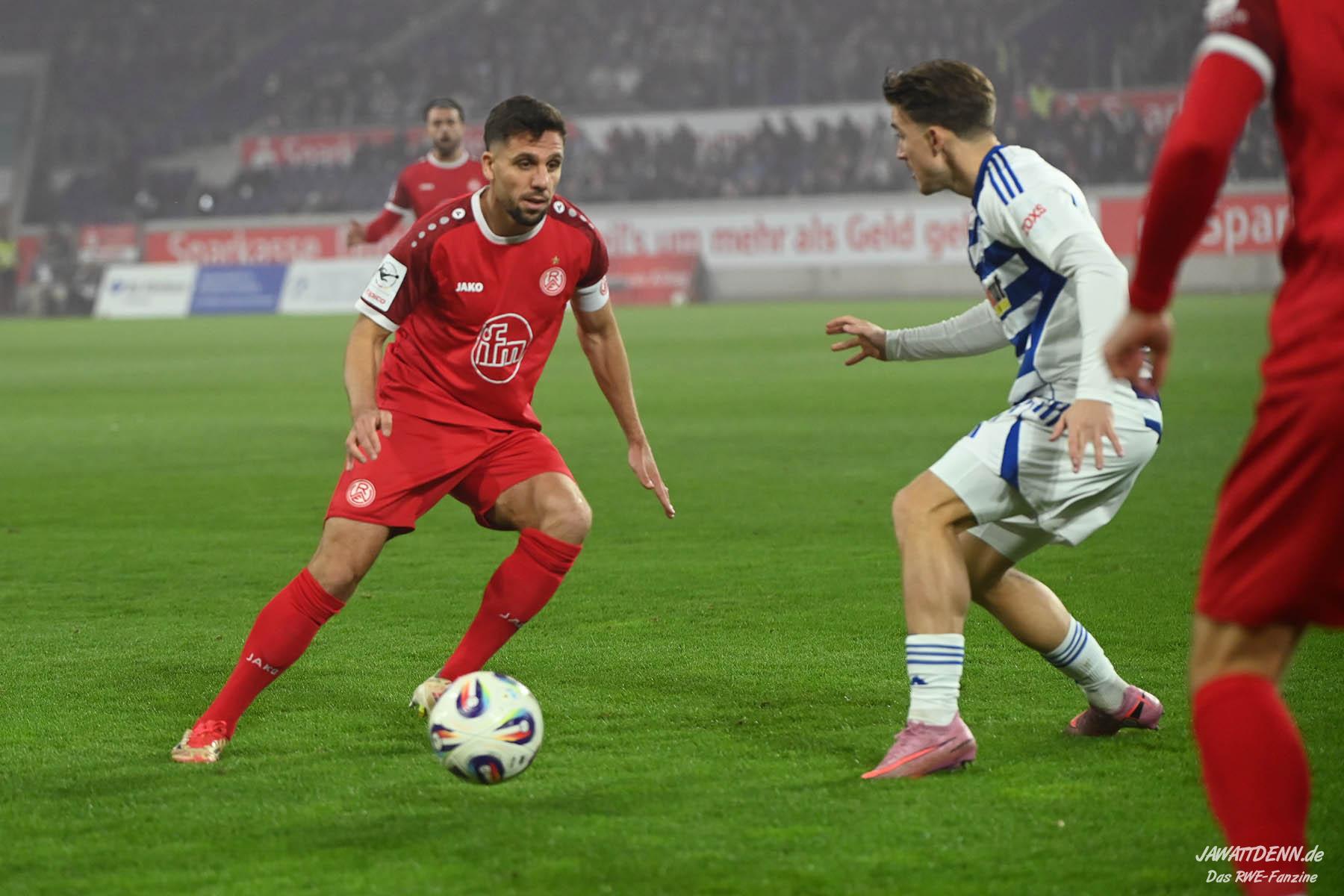 Wer befürchtet hatte, heißblütige Gastgeber würden RWE von Beginn an stark stressen und unter Druck setzen, sah sich angenehm getäuscht. Die Rot-Weissen bewahrten kühlen Kopf, ließen Ball und Gegner laufen, der MSV kam kaum einmal in Pressingmomente, weil RWE mit gutem Positionsspiel und starkem Spielaufbau aus der eigenen Deckung heraus immer wieder spielerische Lösungen fand.