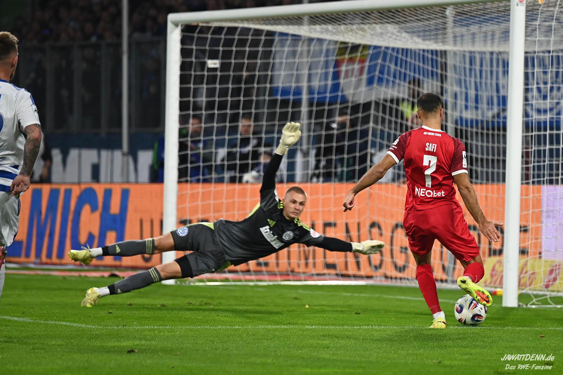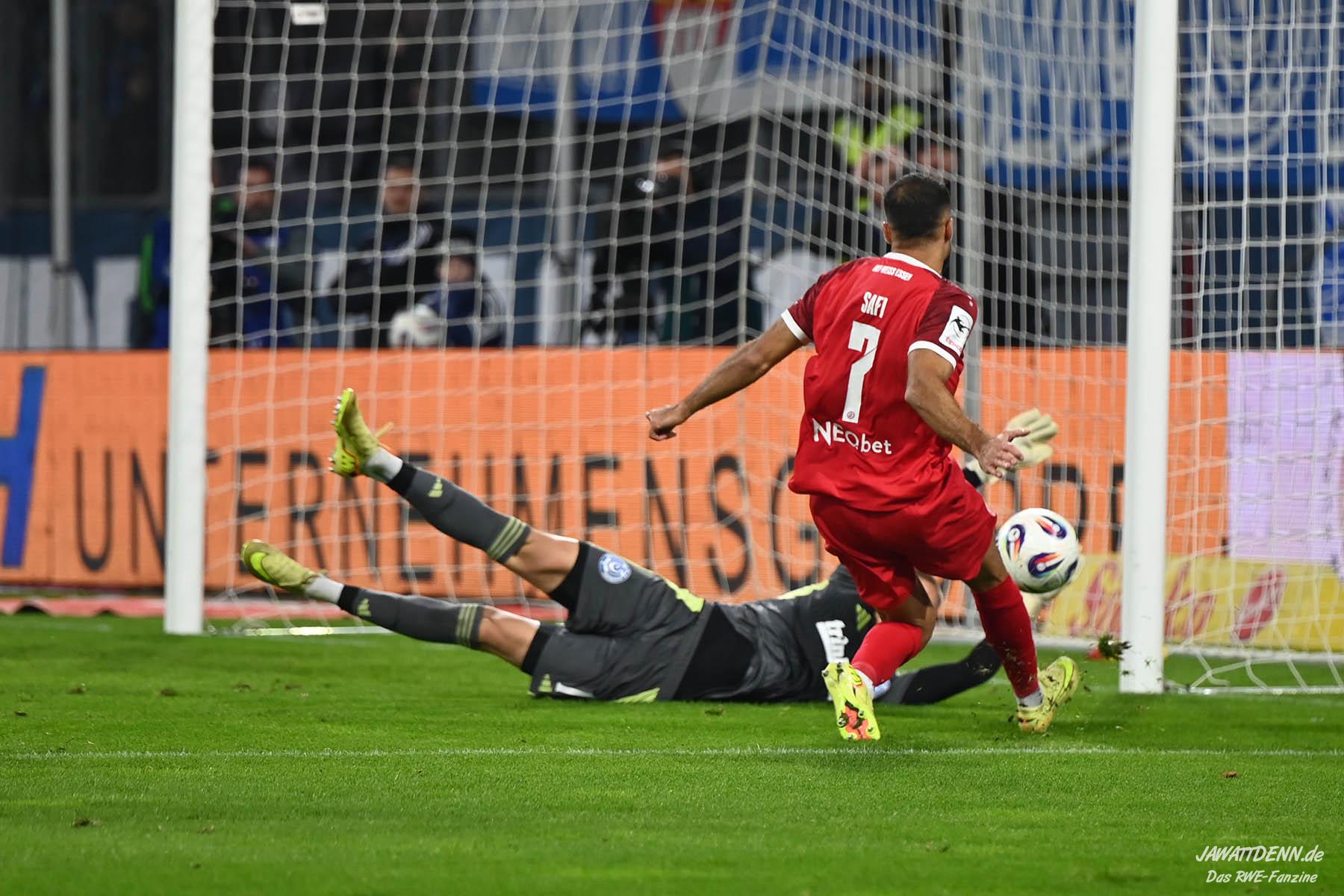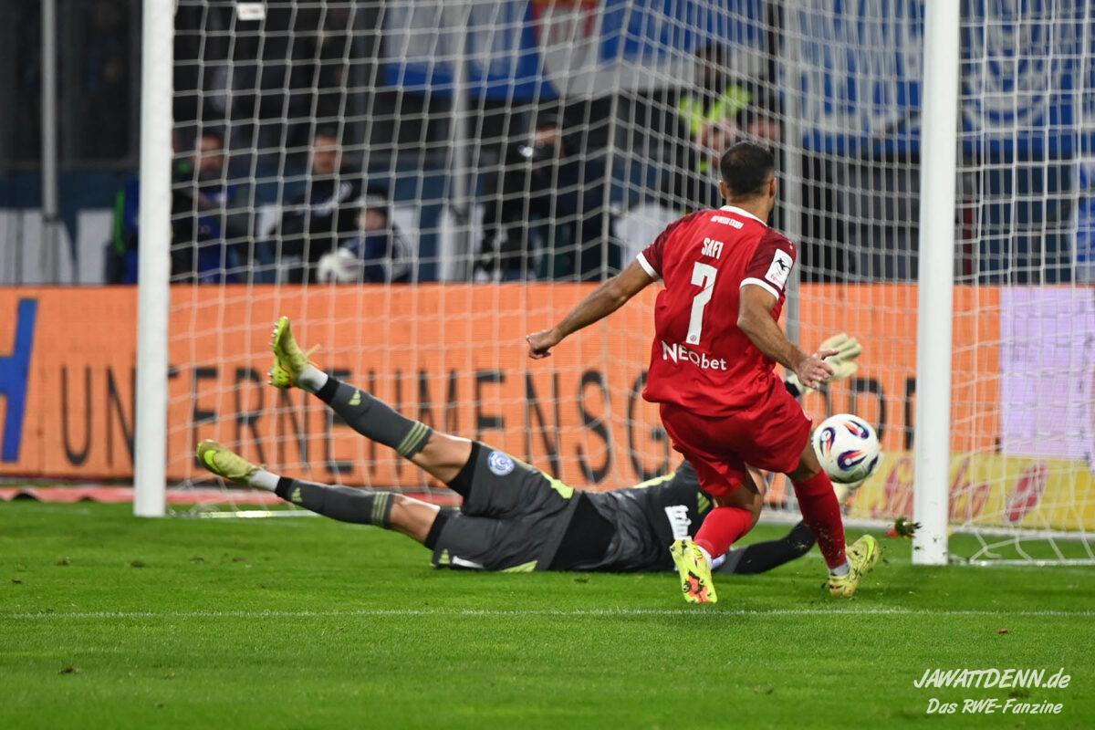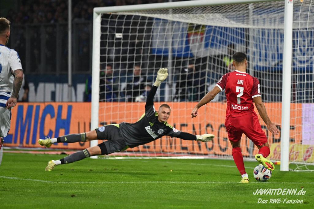 Vor Kraule waren die Ruhe, Übersicht und Zweikampfstärke von Klaus Gjasula im Zentrum herausragend. Im Zusammenspiel mit der Ballsicherheit von Torben Müsel garantierte Essen das lange Ballpassagen. Zudem spielten die Rot-Weissen in Hälfte eins ein sehr ansehnliches Pressing und zwangen den MSV immer wieder zu einfallslosen langen Schlägen über Keeper Braune, die leichte Beute der Essener wurden. Nach dem Rückstand, der sich nicht unbedingt angedeutet hatte, zeigte RWE die sofortige Reaktion, auch wenn Ramien Safi das Präsent vom MSV-Keeper Braune schlichtweg annehmen musste.
