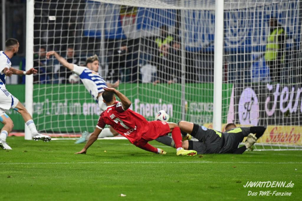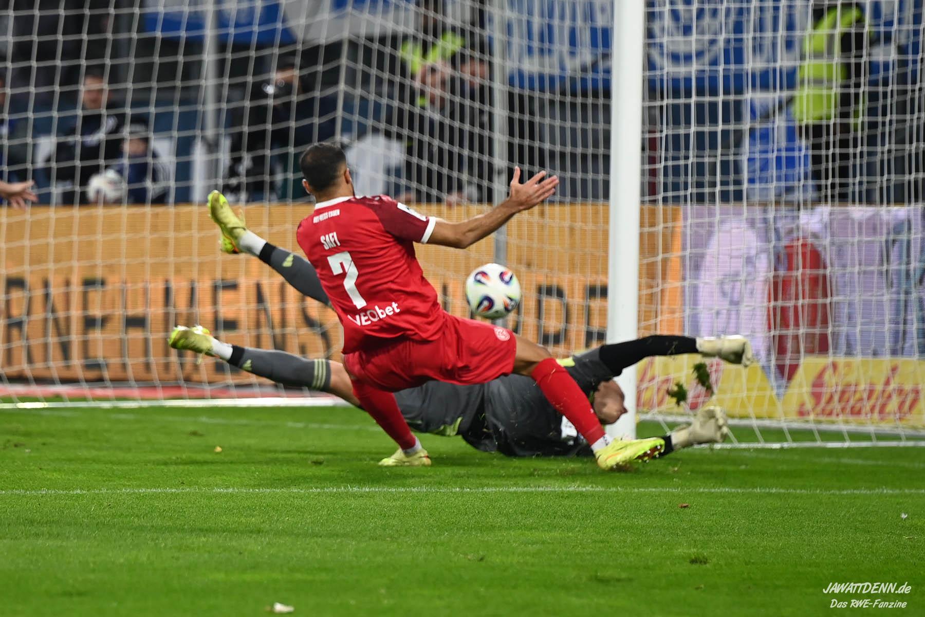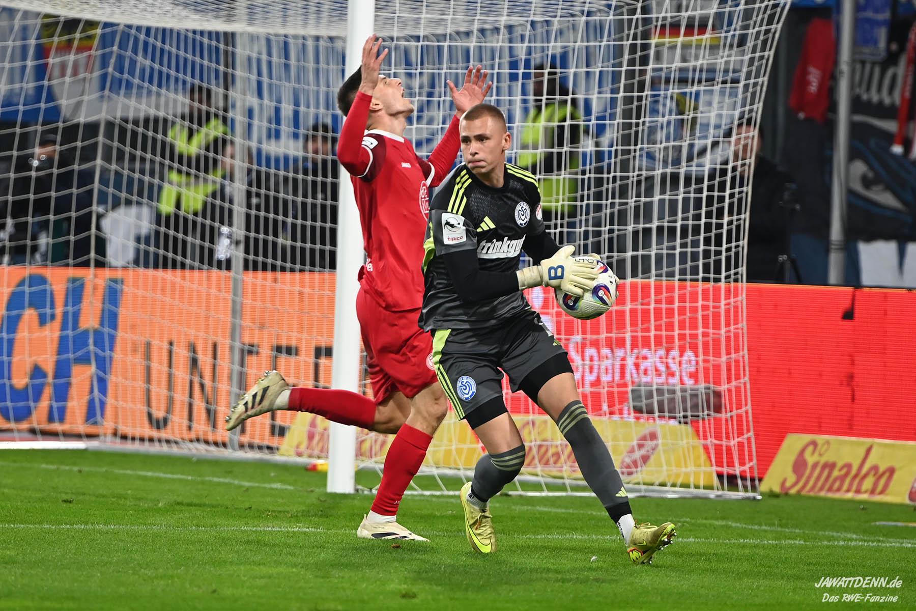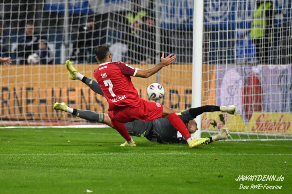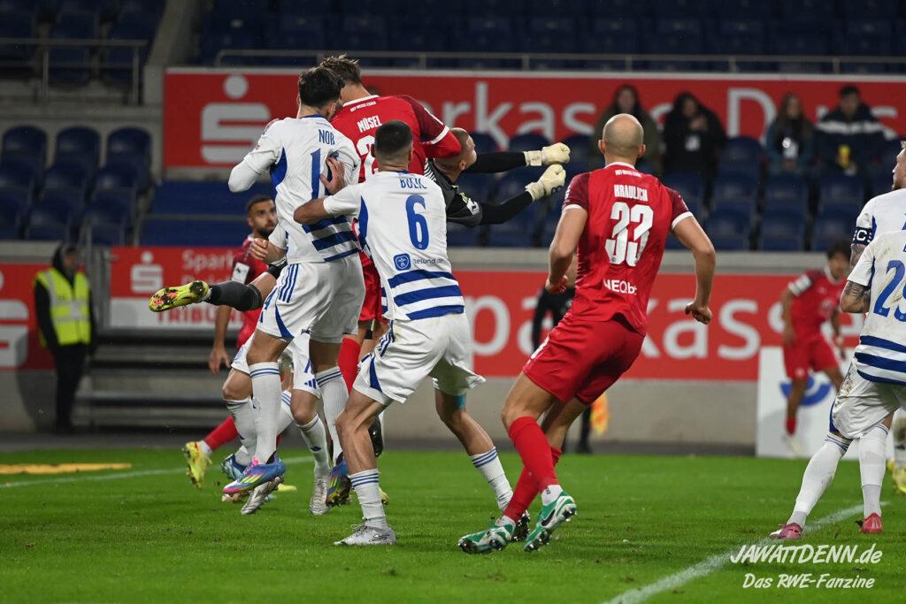 Auch der Beginn der zweiten Hälfte gehörte RWE, Safi luchste dem in dieser Situation indisponierten Fleckstein in der Duisburger Box das Leder ab, aber Müsel schoss die Ablage nur ins Fangnetz. Müsel hatte zuvor in Hälfte eins schon aus 30 Metern eine Fackel an die Latte des Duisburger Tores abgefeuert, der eigentlich einzige RWE-Torabschluss, der nicht durch Fehler der Duisburger begünstigt wurde. Ab Minute 67 hatte RWE nach vorne nicht mehr viel zu bestellen, die Duisburger Druckphase verteidigte die Gäste mittels seiner überragenden Innenverteidiger, neben Kraulich war auch Rios Alonso mal wieder bärenstark, einem wachsamen Jakob Golz und mannschaftlicher Geschlossenheit.