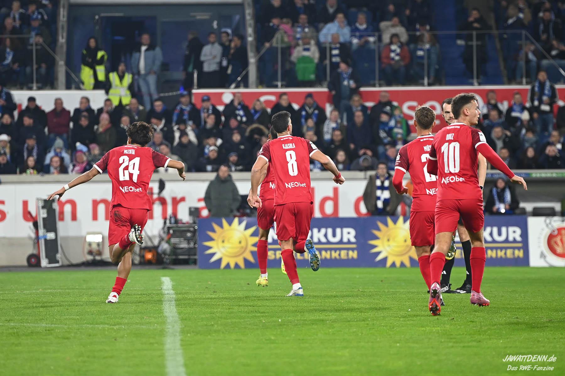 RWE begann mit der nun etablierten Viererkette und mit Tobi Kraulich sowie Rios Alonso als zentrale Verteidiger vor Keeper Jakob Golz. Die rechte Defensivseite gehörte Michael Kostka während Essen auf der anderen Seite zu einem Wechsel in der Startelf gezwungen war. Für den immer noch angeschlagenen Lucas Brumme lief Franci Bouebari auf. Klaus Gjasula kehrte nach seiner Sperre auf die Sechs zurück und erhielt mit Torben Müsel einen ballsicheren Begleiter anstelle des dynamischen Tom Moustier an die Seite gestellt. Marvin Obuz, Ahmet Arslan und Kaito Mizuta waren der defensiven Reihe vorgeschaltet, ganz vorne agierte Ramien Safi.