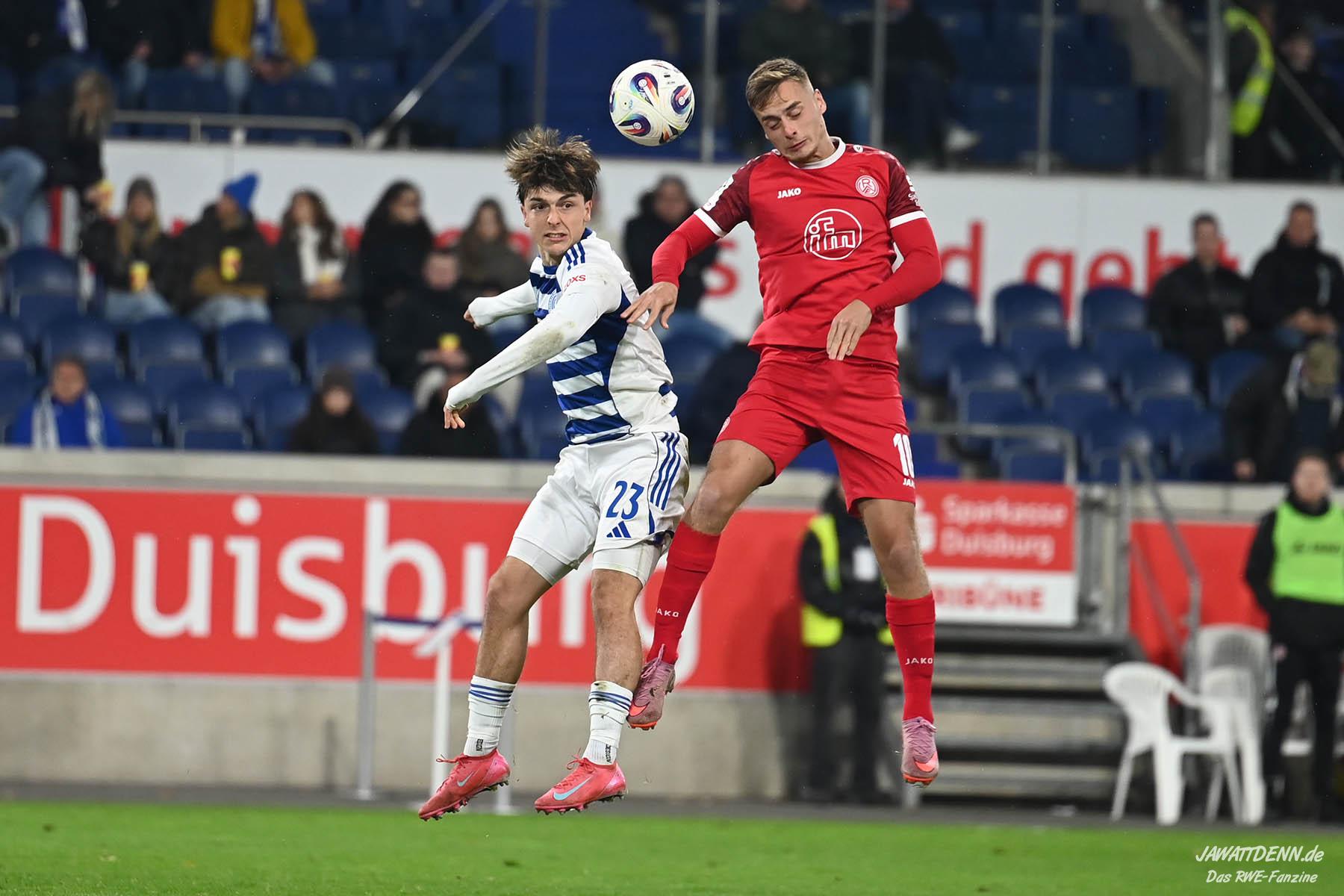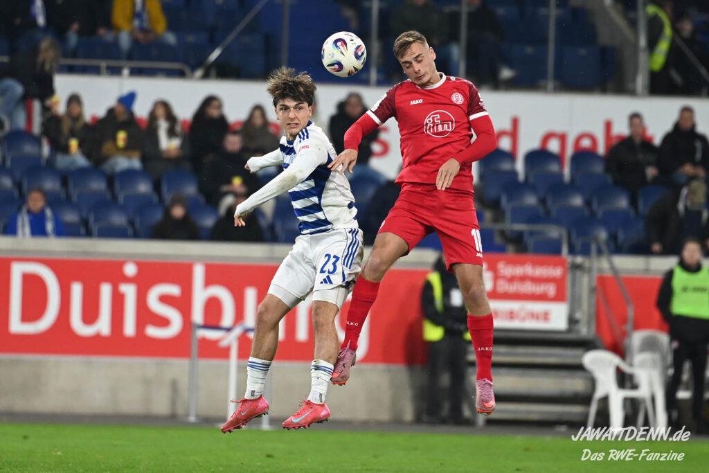 Am Ende hieß es schiedlich friedlich 1:1 und an den TV-Mikrofonen und auch auf der späteren PK hatten sich die beim Niederrheinpokalfinale im Mai noch so streitsüchtigen Coaches Dietmar Hirsch auf Duisburger sowie Uwe Koschinat auf Essener Seite lieb und überhäuften einander mit Fairness und Respekt. Ihre beiden Teams hatten sich zuvor ein rassiges Derby mit einem am Ende leistungsgerechten für RWE aber auch leicht glücklichem Remis geliefert. Essen hatte eine Stunde die bessere Spielanlage und viel Kontrolle, im letzen Drittel des Spiels drängten die Duisburger die Gäste aber fast nur noch zurück. Duisburg war zuvor nach 23 Minuten durch Krüger in Front gegangen, Ramien Safi nahm fast im Gegenzug ein Gastgeschenk von Keeper Braune dankend an, der dem Essener ohne großen Druck den Ball in die Füße spielte.
