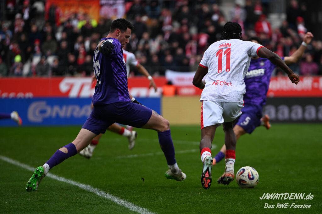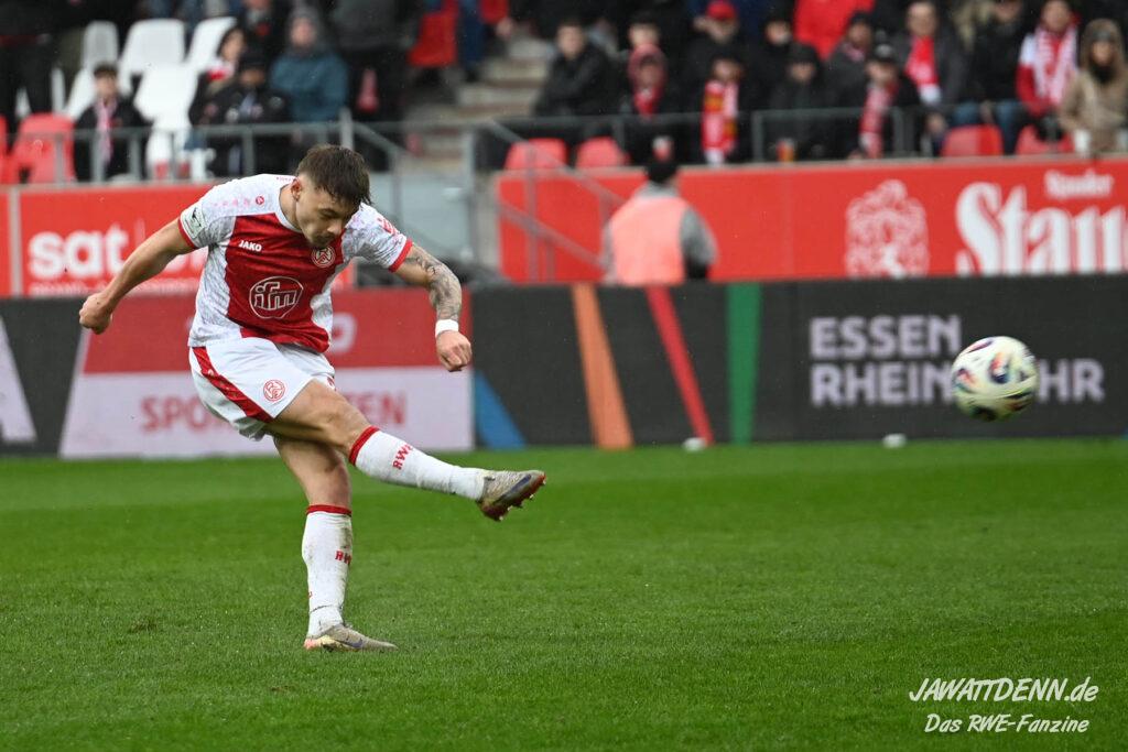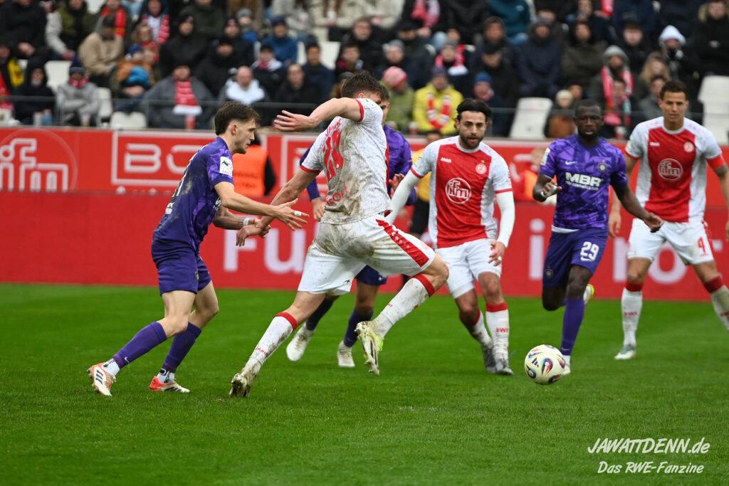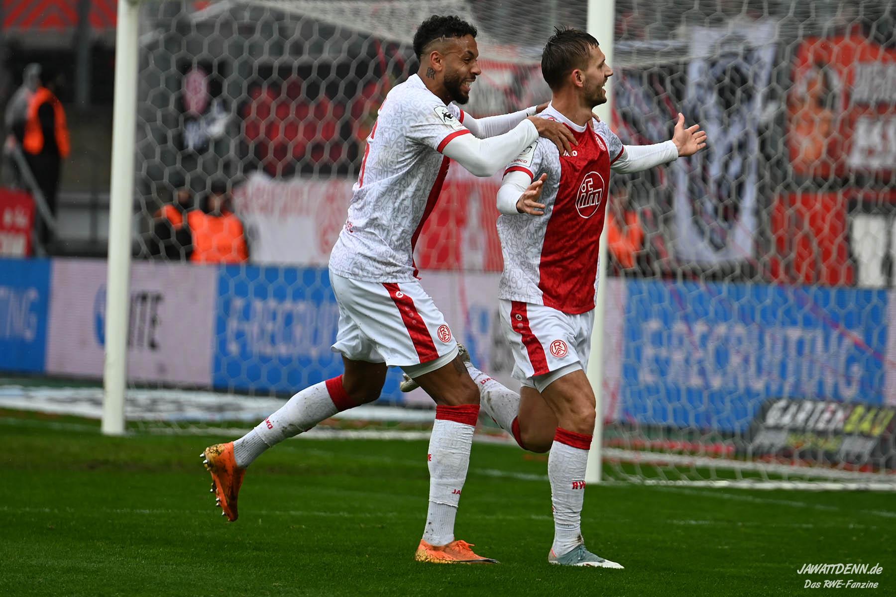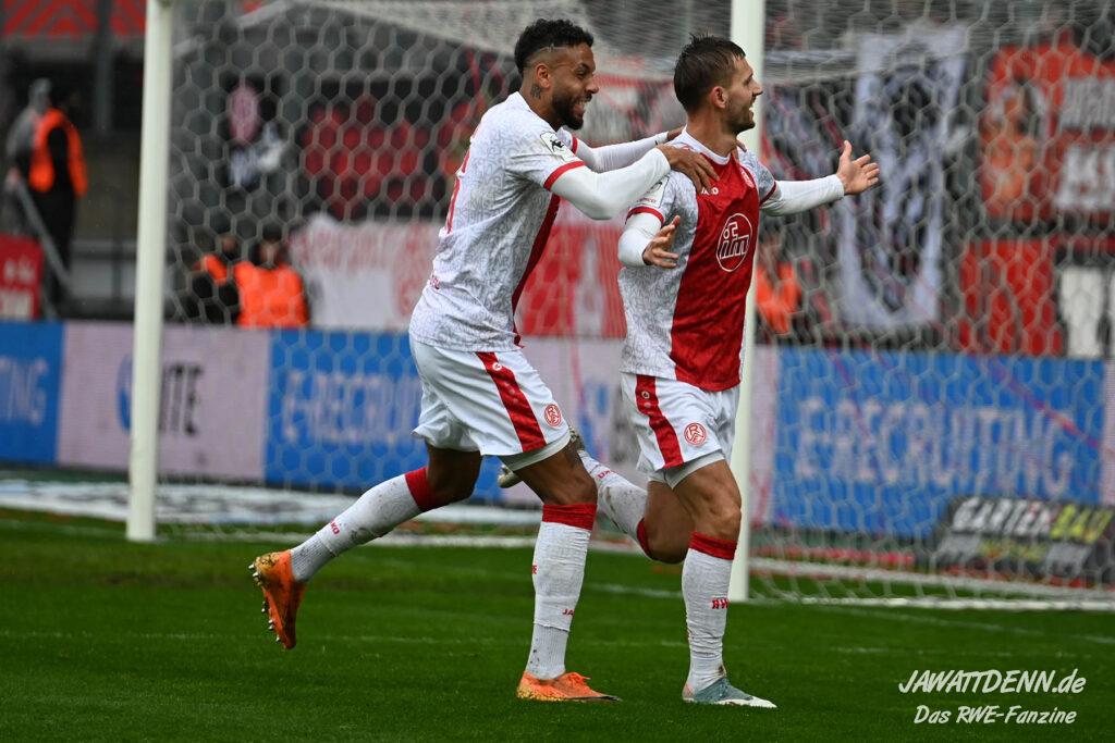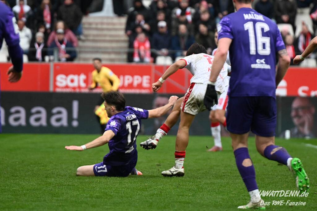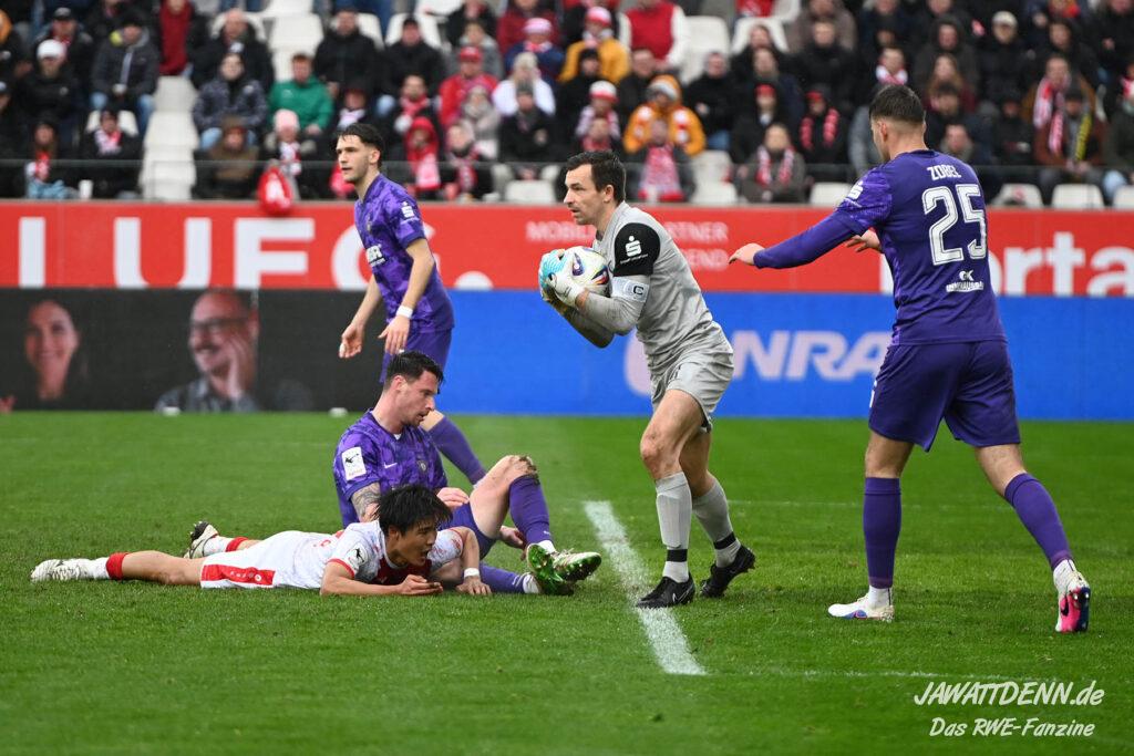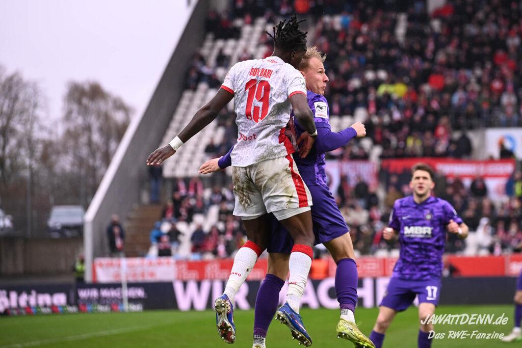 Selbst gegen die zweitschwächste Offensive der Liga schaffte es RWE nicht, hinten sauber zu bleiben. Das erste Gegentor kurz vor der Pause sei noch zu verschmerzen, vielleicht wollte die Mannschaft einfach in diesem Moment zu viel und war zu offen. Allerdings ließ sich auch hier Linksverteidiger Franci Boeubari wie beim ersten Gegentreffer in Hoffenheim zu leicht abkochen. Wie vor einer Woche war auch wieder der andere Außenverteidiger, Jannik Hofmann, in der Verlosung, doch diesmal war es großes Pech, dass er den Schuss von Ehlers abfälschte und dieser über Jakob Golz den Weg ins Tor fand.