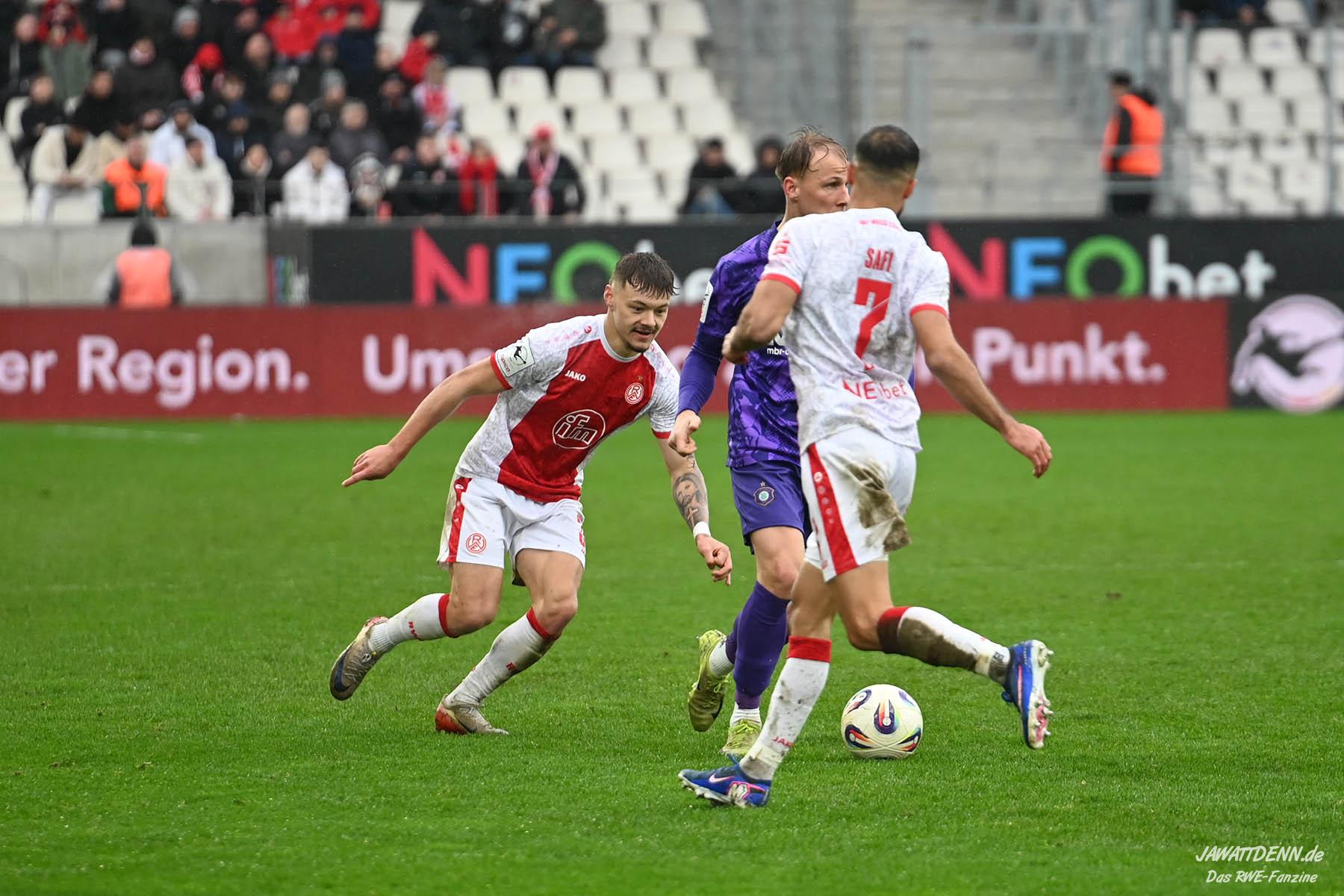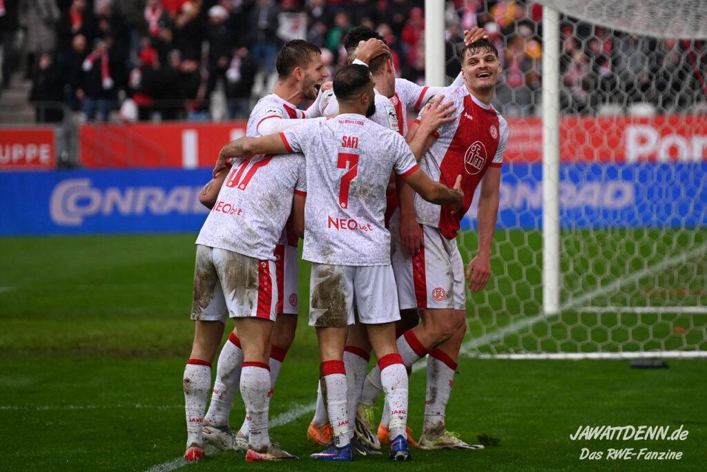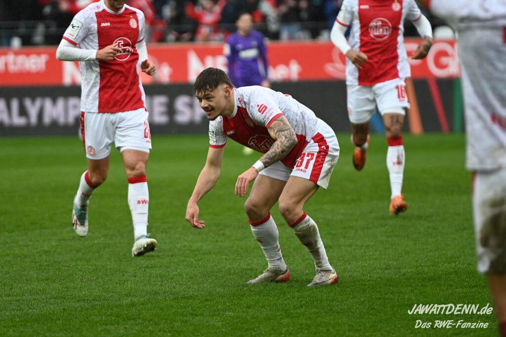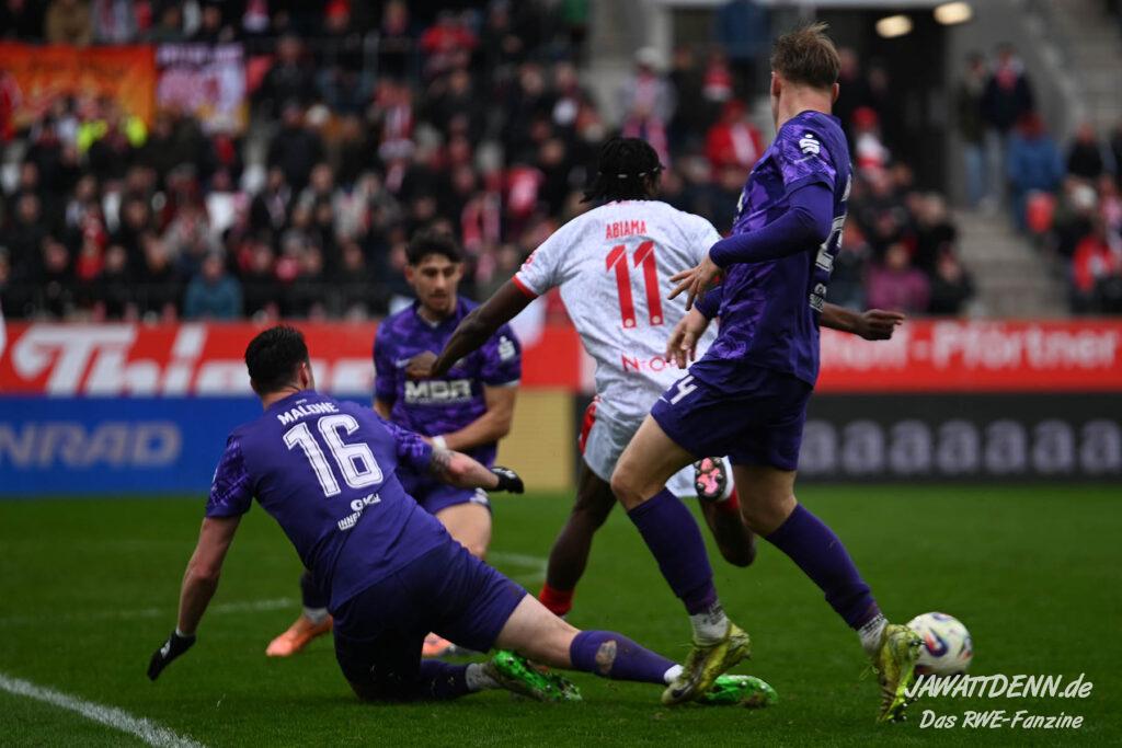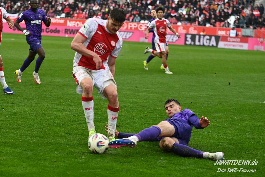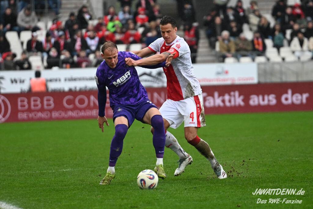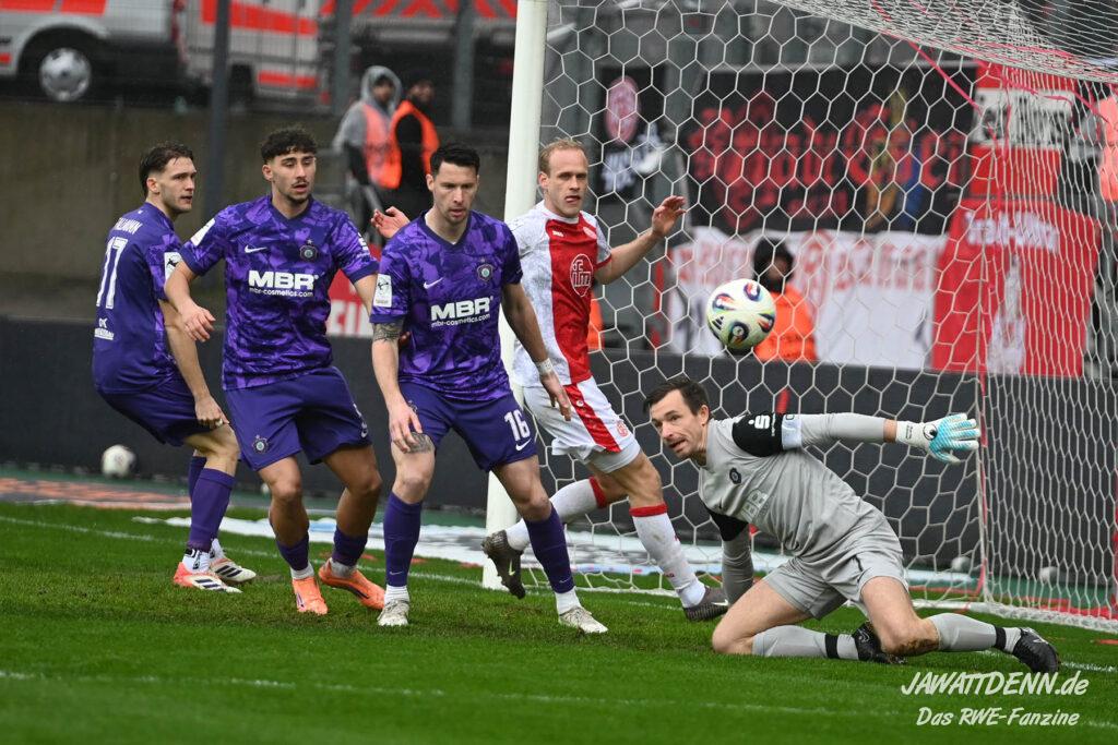 Selbst gegen die zweitschwächste Offensive der Liga schaffte es RWE nicht, hinten sauber zu bleiben. Das erste Gegentor kurz vor der Pause sei noch zu verschmerzen, vielleicht wollte die Mannschaft einfach in diesem Moment zu viel und war zu offen. Allerdings ließ sich auch hier Linksverteidiger Franci Boeubari wie beim ersten Gegentreffer in Hoffenheim zu leicht abkochen. Wie vor einer Woche war auch wieder der andere Außenverteidiger, Jannik Hofmann, in der Verlosung, doch diesmal war es großes Pech, dass er den Schuss von Ehlers abfälschte und dieser über Jakob Golz den Weg ins Tor fand.