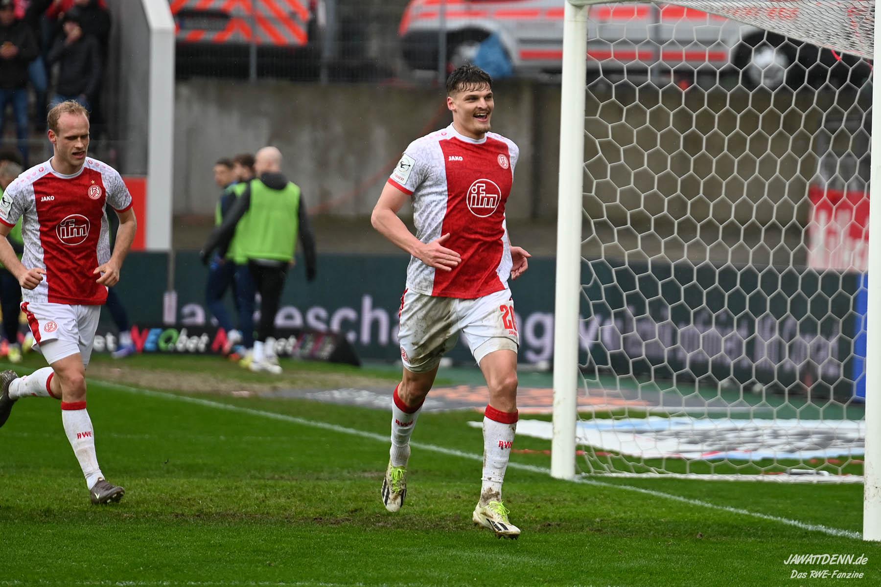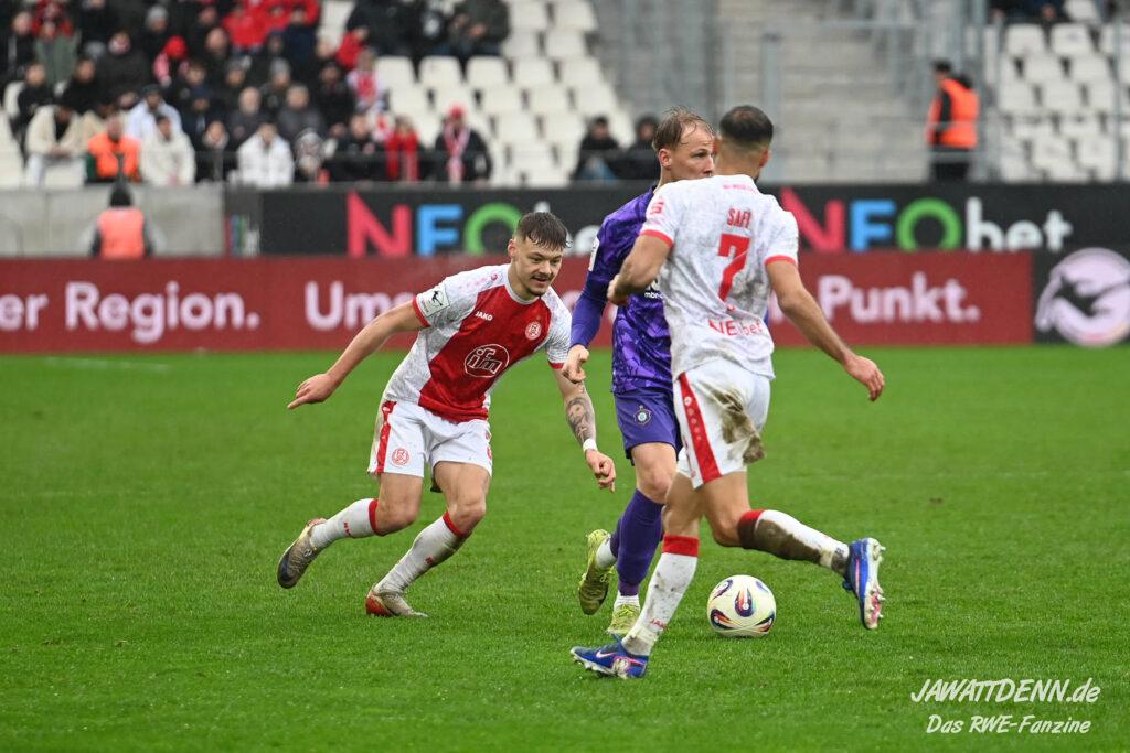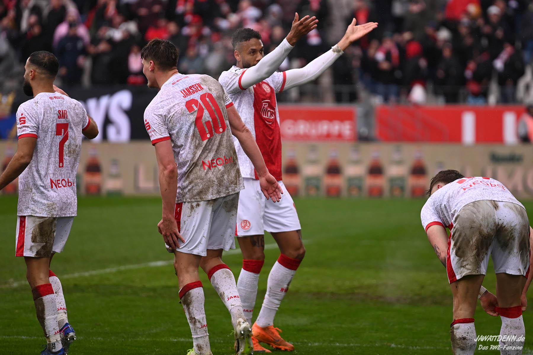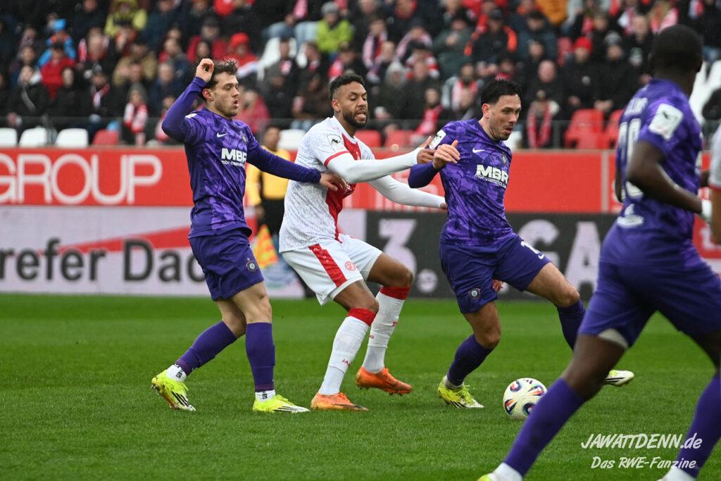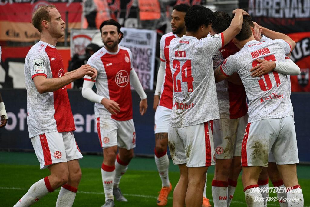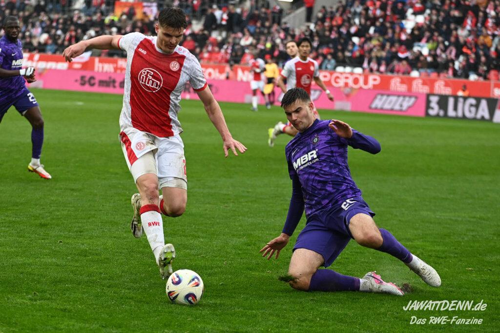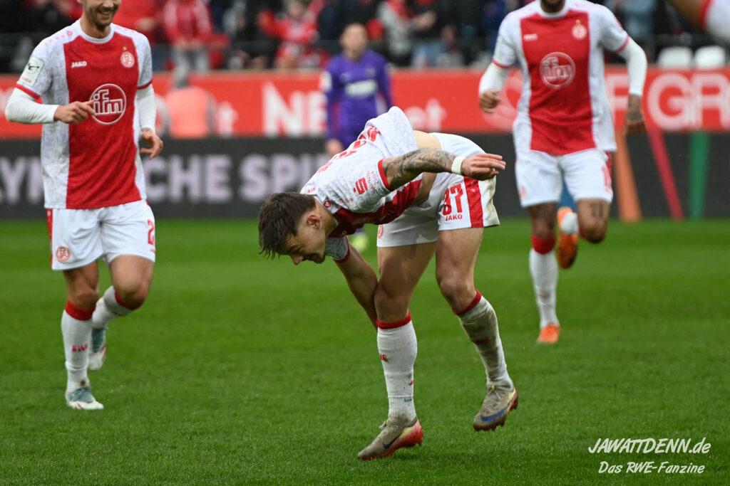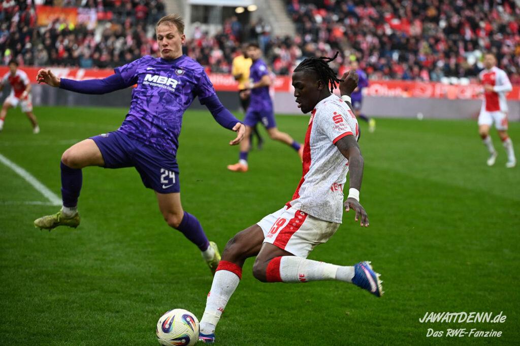 Selbst gegen die zweitschwächste Offensive der Liga schaffte es RWE nicht, hinten sauber zu bleiben. Das erste Gegentor kurz vor der Pause sei noch zu verschmerzen, vielleicht wollte die Mannschaft einfach in diesem Moment zu viel und war zu offen. Allerdings ließ sich auch hier Linksverteidiger Franci Boeubari wie beim ersten Gegentreffer in Hoffenheim zu leicht abkochen. Wie vor einer Woche war auch wieder der andere Außenverteidiger, Jannik Hofmann, in der Verlosung, doch diesmal war es großes Pech, dass er den Schuss von Ehlers abfälschte und dieser über Jakob Golz den Weg ins Tor fand.